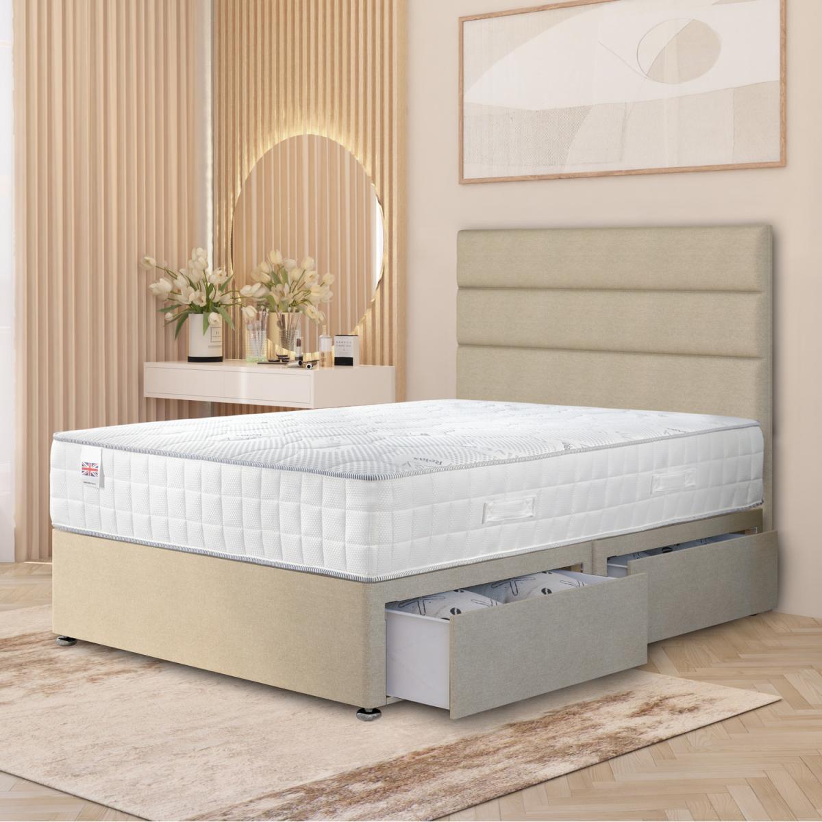 The Tweed Fabric Horizona Divan Bed Set blends refined design with lasting comfort. Handcrafted in the UK, it includes a solid platform-top divan base, a premium 5-layer Easy Relax Pocket Spring Memory Foam Mattress, and a 54" floor-standing headboard upholstered in elegant tweed fabric. The 1000 pocket springs and three foam layers - 2.5cm memory foam, 2.5cm reflex foam, and 750g polyester foam - deliver medium-firm cushioned support that contours to your body while maintaining bounce-back comfort. Firmer edge springs enhance stability, and the 7-zone system targets shoulders, hips, and back for improved posture and pressure relief. Finished with a quilted soft-touch knitted cover, the mattress provides even, breathable comfort for deeper, undisturbed sleep. The matching 54" floor standing headboard, with its horizontal cushioned panels, adds a statement of luxury to any bedroom. Available with no drawers, 2 drawers (same side), or 4 drawers, all with mattress included. Base height: 34.5cm with gliders, 30.5cm without. This bed comes with 2 easy access storage drawers. Headboard can be placed in either end of the base, so you can either have both drawers facing on the right side, or left side.