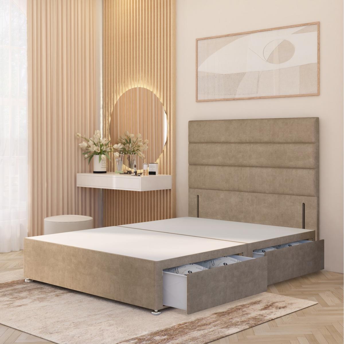 The Horizona Plush Velvet Divan Bed Base with 54" Floor Standing Upholstered Headboard combines luxury design with durable everyday support. The solid platform top divan base provides a stable, firm foundation for your mattress, enhancing comfort and delivering superior all round support compared to slatted frames. Expertly crafted in the UK from quality timber and upholstered in luxurious plush velvet fabric, this bed set adds refined elegance to both classic and modern interiors. The floor standing upholstered headboard features wide horizontal panel cushioning, offering a contemporary look that doubles as a comfortable backrest for sitting up in bed. The divan base measures 34.5cm in height with gliders (30.5cm without gliders) attached and is available in all standard UK sizes 2FT. 6 Small Single, 3FT Single, 4FT Small Double, 4FT. 6 Double, 5FT King, and 6FT Super King. For added practicality, choose from multiple storage drawer options including No Drawers, 2 Drawers (same side), or 4 Drawers, making this velvet divan bed with headboard both stylish and functional. Headboard is 54" / 137cm, front panel is 32" / 86cm. Maximum storage capacity with 4 drawers, 2 on each side make this a great storage bed option.