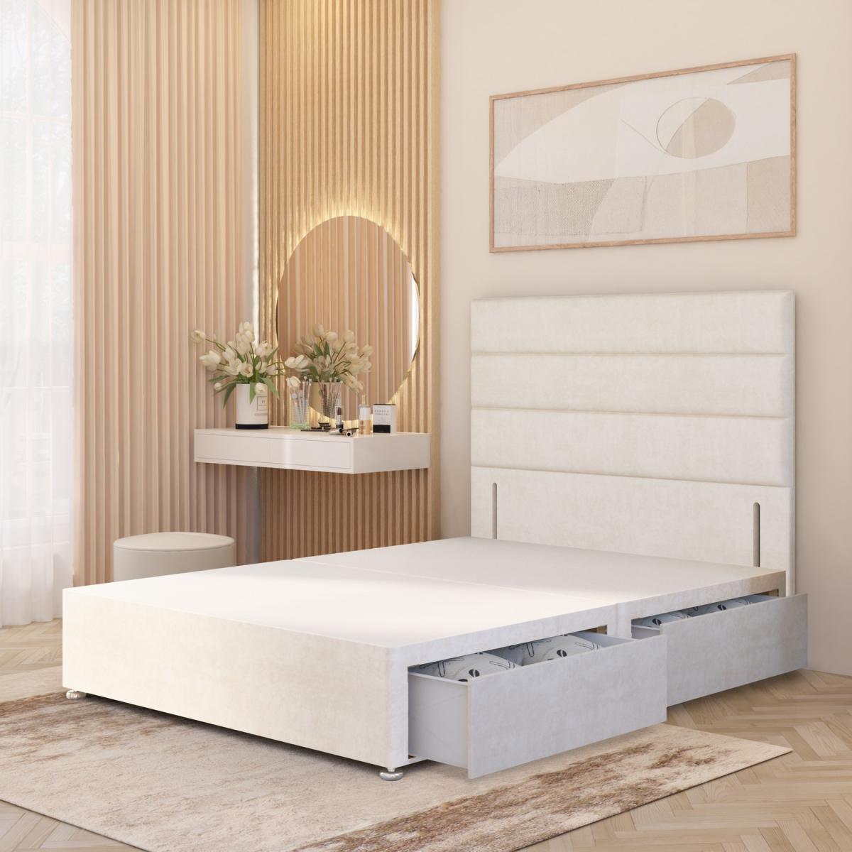 The Horizona Plush Velvet Divan Bed Base with 54" Floor Standing Upholstered Headboard combines luxury design with durable everyday support. The solid platform top divan base provides a stable, firm foundation for your mattress, enhancing comfort and delivering superior all round support compared to slatted frames. Expertly crafted in the UK from quality timber and upholstered in luxurious plush velvet fabric, this bed set adds refined elegance to both classic and modern interiors. The floor standing upholstered headboard features wide horizontal panel cushioning, offering a contemporary look that doubles as a comfortable backrest for sitting up in bed. The divan base measures 34.5cm in height with gliders (30.5cm without gliders) attached and is available in all standard UK sizes 2FT. 6 Small Single, 3FT Single, 4FT Small Double, 4FT. 6 Double, 5FT King, and 6FT Super King. For added practicality, choose from multiple storage drawer options including No Drawers, 2 Drawers (same side), or 4 Drawers, making this velvet divan bed with headboard both stylish and functional. Headboard is 54" / 137cm, front panel is 32" / 86cm. An excellent space saving storage bed. Drawers can be placed left or right side as the headboard fits either end of the base.
