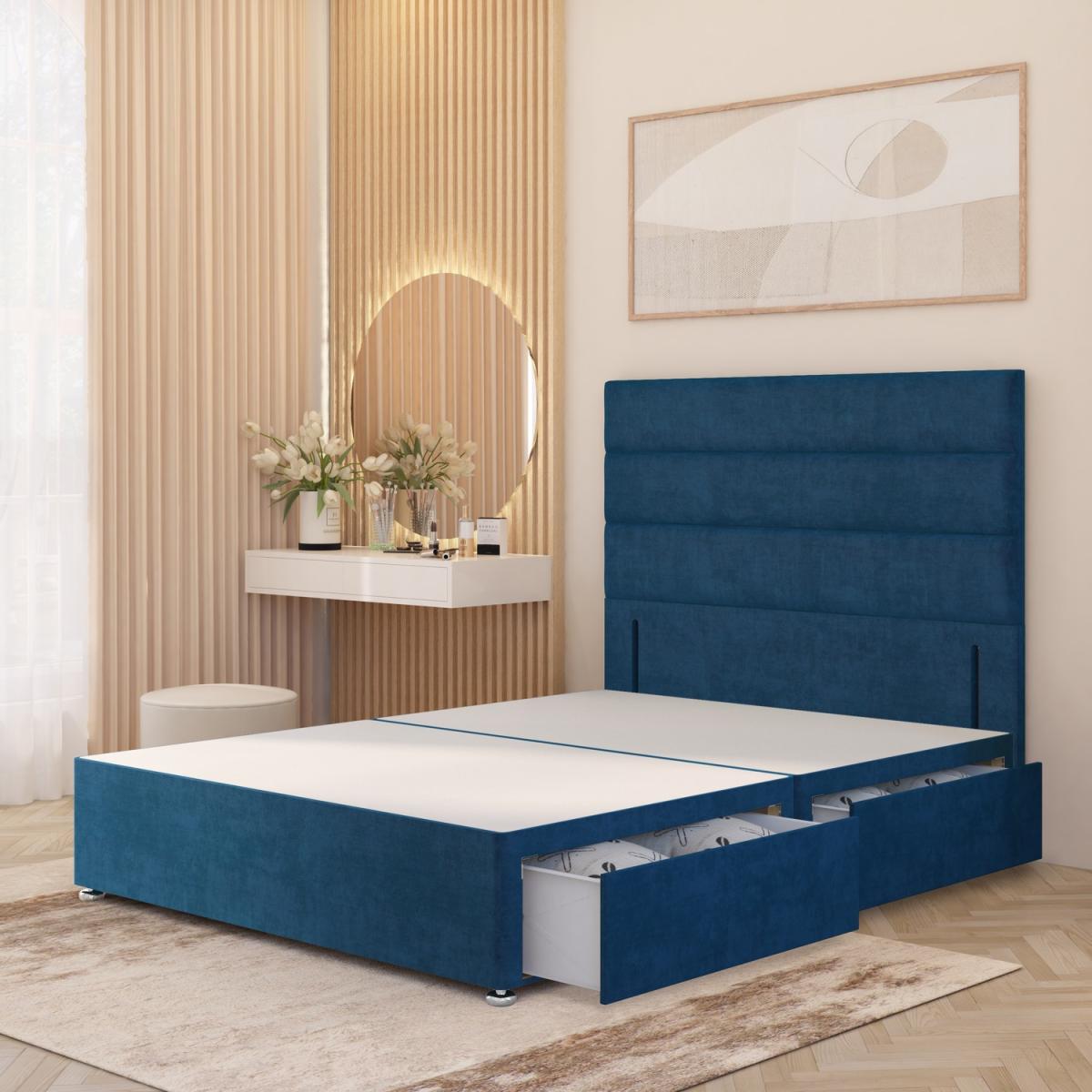 The Horizona Plush Velvet Divan Bed Base with 54" Floor Standing Upholstered Headboard combines luxury design with durable everyday support. The solid platform top divan base provides a stable, firm foundation for your mattress, enhancing comfort and delivering superior all round support compared to slatted frames. Expertly crafted in the UK from quality timber and upholstered in luxurious plush velvet fabric, this bed set adds refined elegance to both classic and modern interiors. The floor standing upholstered headboard features wide horizontal panel cushioning, offering a contemporary look that doubles as a comfortable backrest for sitting up in bed. The divan base measures 34.5cm in height with gliders (30.5cm without gliders) attached and is available in all standard UK sizes 2FT. 6 Small Single, 3FT Single, 4FT Small Double, 4FT. 6 Double, 5FT King, and 6FT Super King. For added practicality, choose from multiple storage drawer options including No Drawers, 2 Drawers (same side), or 4 Drawers, making this velvet divan bed with headboard both stylish and functional. Headboard is 54" / 137cm, front panel is 32" / 86cm. Maximum storage capacity with 4 drawers, 2 on each side make this a great storage bed option.