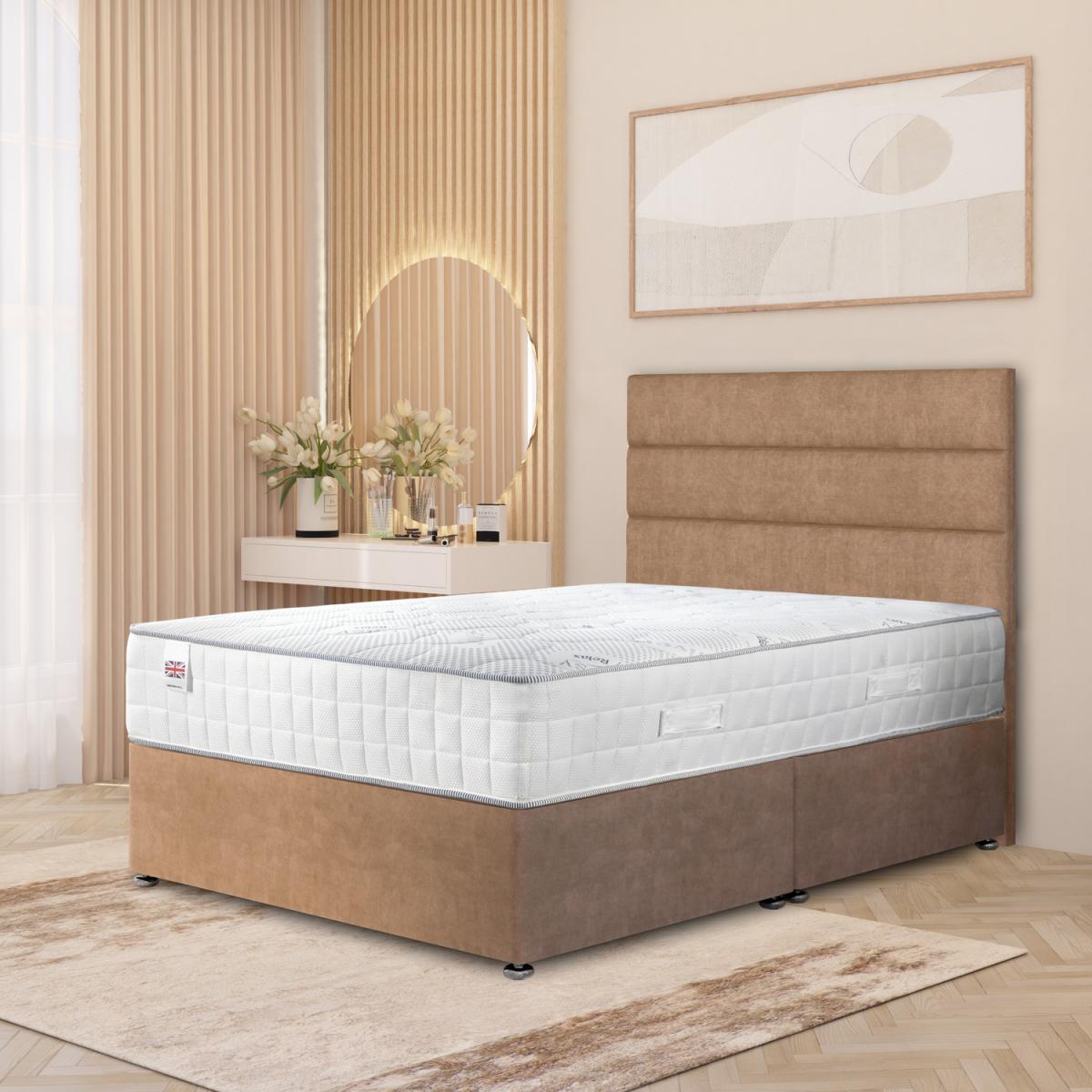 The luxurious Horizona Divan Bed Set includes a high-grade Divan Base with a solid platform top, Our premium 5 Layer Easy Relax Pocket Spring Memory Foam Mattress, and a 54" Floor Standing Headboard. The solid top base provides long-term durability and the best supporting surface for your mattress. The mattress allows you to sink in slightly and then offers medium firm cushioned support. Engineered for superior comfort, this mattress features three foam layers - 2.5cm memory foam, 2.5cm reflex foam, and 750g polyester foam - as well as 1000 pocket springs, combining to contour to your body, add bounce-back resilience, and provide a cushioned surface for deeper, undisturbed sleep. Specially designed firmer edge springs are placed along the mattress side for enhanced support and stability. The 7-zone system targets shoulders, hips, and back to reduce pressure and improve posture. The quilted soft touch knitted "easy relax" mattress cover offers an even surface to sleep on to support your whole body and is designed to offer a relaxing nights sleep. The elegant floor standing headboard elevates this bed set and brings everything together, guaranteed to make a statement of luxury in your bedroom, hand crafted with horizontal sectioned cushioned panels. Choose from a No draw divan bed, 2 draw divan bed, or 4 draw divan bed, all with mattresses included. Base height is 34.5cm with the gliders, 30.5cm without.