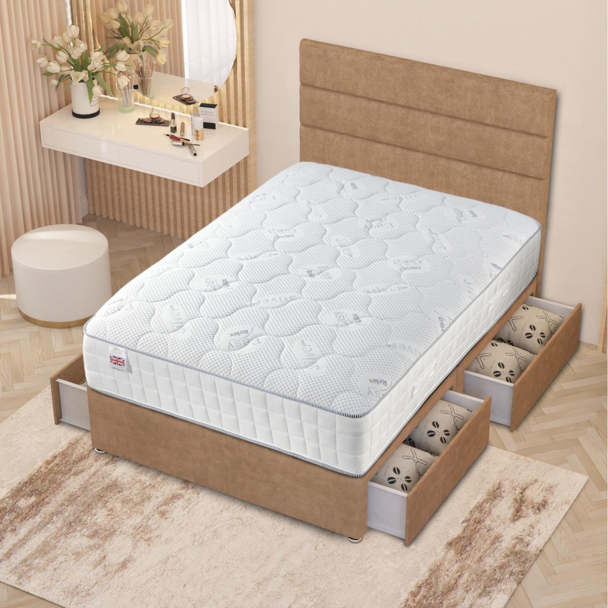 The luxurious Horizona Divan Bed Set includes a high-grade Divan Base with a solid platform top, Our premium 5 Layer Easy Relax Pocket Spring Memory Foam Mattress, and a 54" Floor Standing Headboard. The solid top base provides long-term durability and the best supporting surface for your mattress. The mattress allows you to sink in slightly and then offers medium firm cushioned support. Engineered for superior comfort, this mattress features three foam layers - 2.5cm memory foam, 2.5cm reflex foam, and 750g polyester foam - as well as 1000 pocket springs, combining to contour to your body, add bounce-back resilience, and provide a cushioned surface for deeper, undisturbed sleep. Specially designed firmer edge springs are placed along the mattress side for enhanced support and stability. The 7-zone system targets shoulders, hips, and back to reduce pressure and improve posture. The quilted soft touch knitted "easy relax" mattress cover offers an even surface to sleep on to support your whole body and is designed to offer a relaxing nights sleep. The elegant floor standing headboard elevates this bed set and brings everything together, guaranteed to make a statement of luxury in your bedroom, hand crafted with horizontal sectioned cushioned panels. Choose from a No draw divan bed, 2 draw divan bed, or 4 draw divan bed, all with mattresses included. Base height is 34.5cm with the gliders, 30.5cm without. This option storage bed comes with 4 easy access storage drawers, 2 on each side.