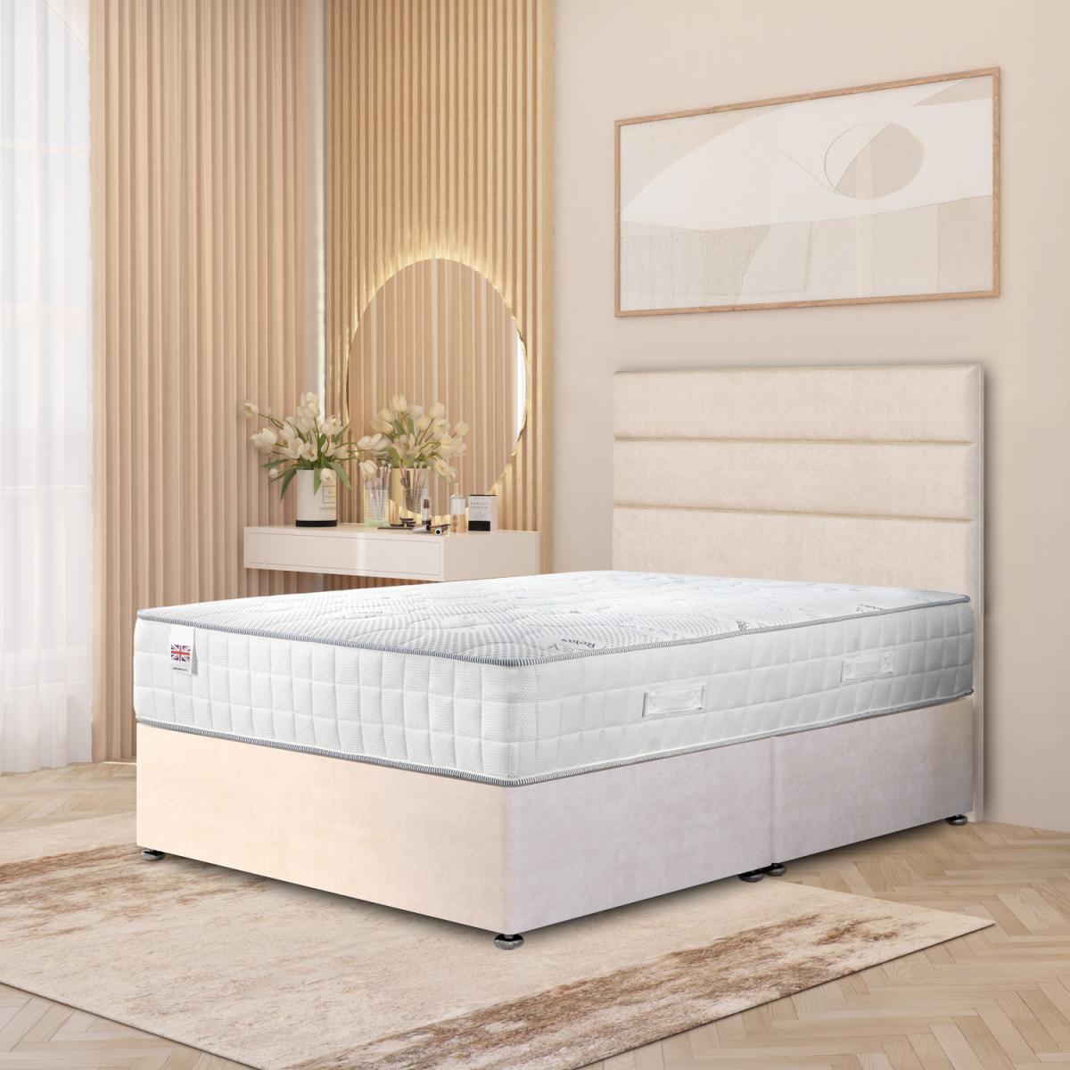 The luxurious Horizona Divan Bed Set includes a high-grade Divan Base with a solid platform top, Our premium 5 Layer Easy Relax Pocket Spring Memory Foam Mattress, and a 54" Floor Standing Headboard. The solid top base provides long-term durability and the best supporting surface for your mattress. The mattress allows you to sink in slightly and then offers medium firm cushioned support. Engineered for superior comfort, this mattress features three foam layers - 2.5cm memory foam, 2.5cm reflex foam, and 750g polyester foam - as well as 1000 pocket springs, combining to contour to your body, add bounce-back resilience, and provide a cushioned surface for deeper, undisturbed sleep. Specially designed firmer edge springs are placed along the mattress side for enhanced support and stability. The 7-zone system targets shoulders, hips, and back to reduce pressure and improve posture. The quilted soft touch knitted "easy relax" mattress cover offers an even surface to sleep on to support your whole body and is designed to offer a relaxing nights sleep. The elegant floor standing headboard elevates this bed set and brings everything together, guaranteed to make a statement of luxury in your bedroom, hand crafted with horizontal sectioned cushioned panels. Choose from a No draw divan bed, 2 draw divan bed, or 4 draw divan bed, all with mattresses included. Base height is 34.5cm with the gliders, 30.5cm without.