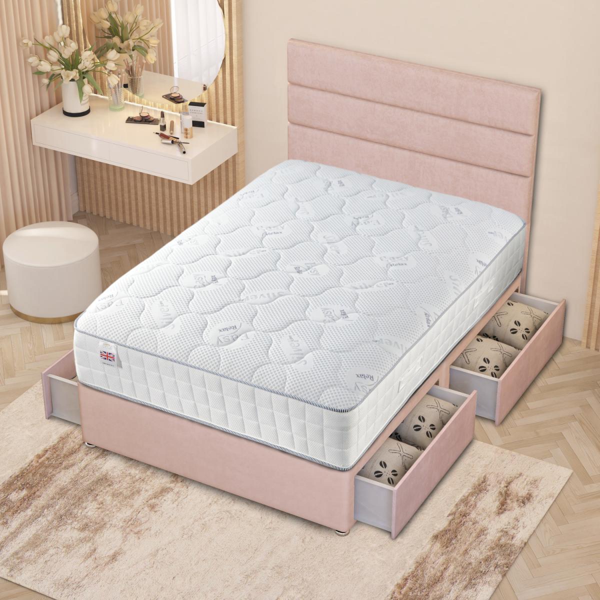 The luxurious Horizona Divan Bed Set includes a high-grade Divan Base with a solid platform top, Our premium 5 Layer Easy Relax Pocket Spring Memory Foam Mattress, and a 54" Floor Standing Headboard. The solid top base provides long-term durability and the best supporting surface for your mattress. The mattress allows you to sink in slightly and then offers medium firm cushioned support. Engineered for superior comfort, this mattress features three foam layers - 2.5cm memory foam, 2.5cm reflex foam, and 750g polyester foam - as well as 1000 pocket springs, combining to contour to your body, add bounce-back resilience, and provide a cushioned surface for deeper, undisturbed sleep. Specially designed firmer edge springs are placed along the mattress side for enhanced support and stability. The 7-zone system targets shoulders, hips, and back to reduce pressure and improve posture. The quilted soft touch knitted "easy relax" mattress cover offers an even surface to sleep on to support your whole body and is designed to offer a relaxing nights sleep. The elegant floor standing headboard elevates this bed set and brings everything together, guaranteed to make a statement of luxury in your bedroom, hand crafted with horizontal sectioned cushioned panels. Choose from a No draw divan bed, 2 draw divan bed, or 4 draw divan bed, all with mattresses included. Base height is 34.5cm with the gliders, 30.5cm without. This option storage bed comes with 4 easy access storage drawers, 2 on each side.