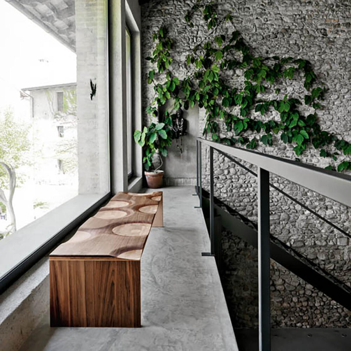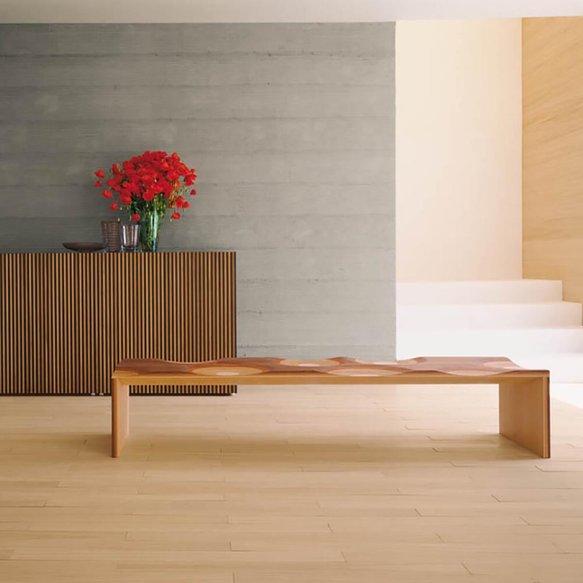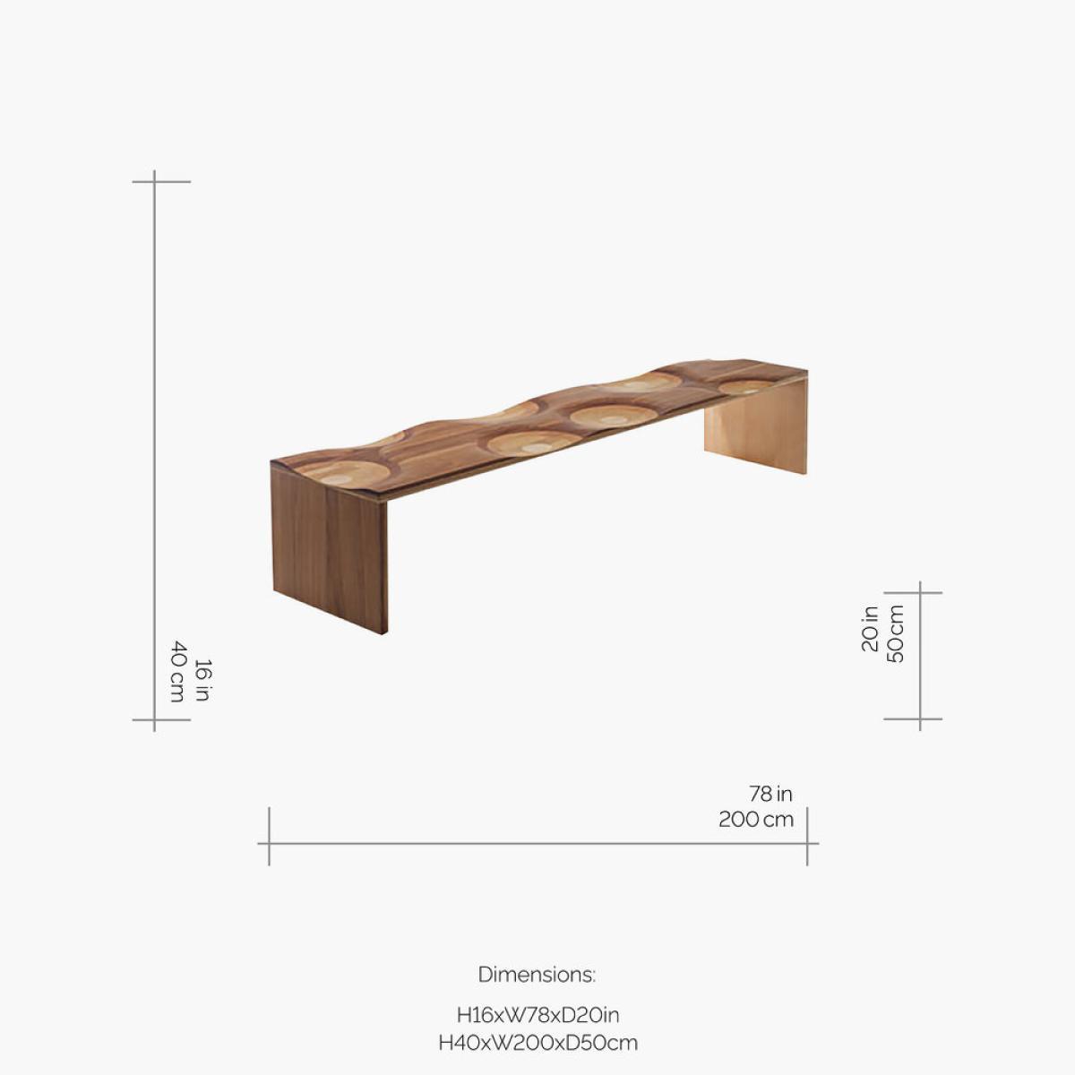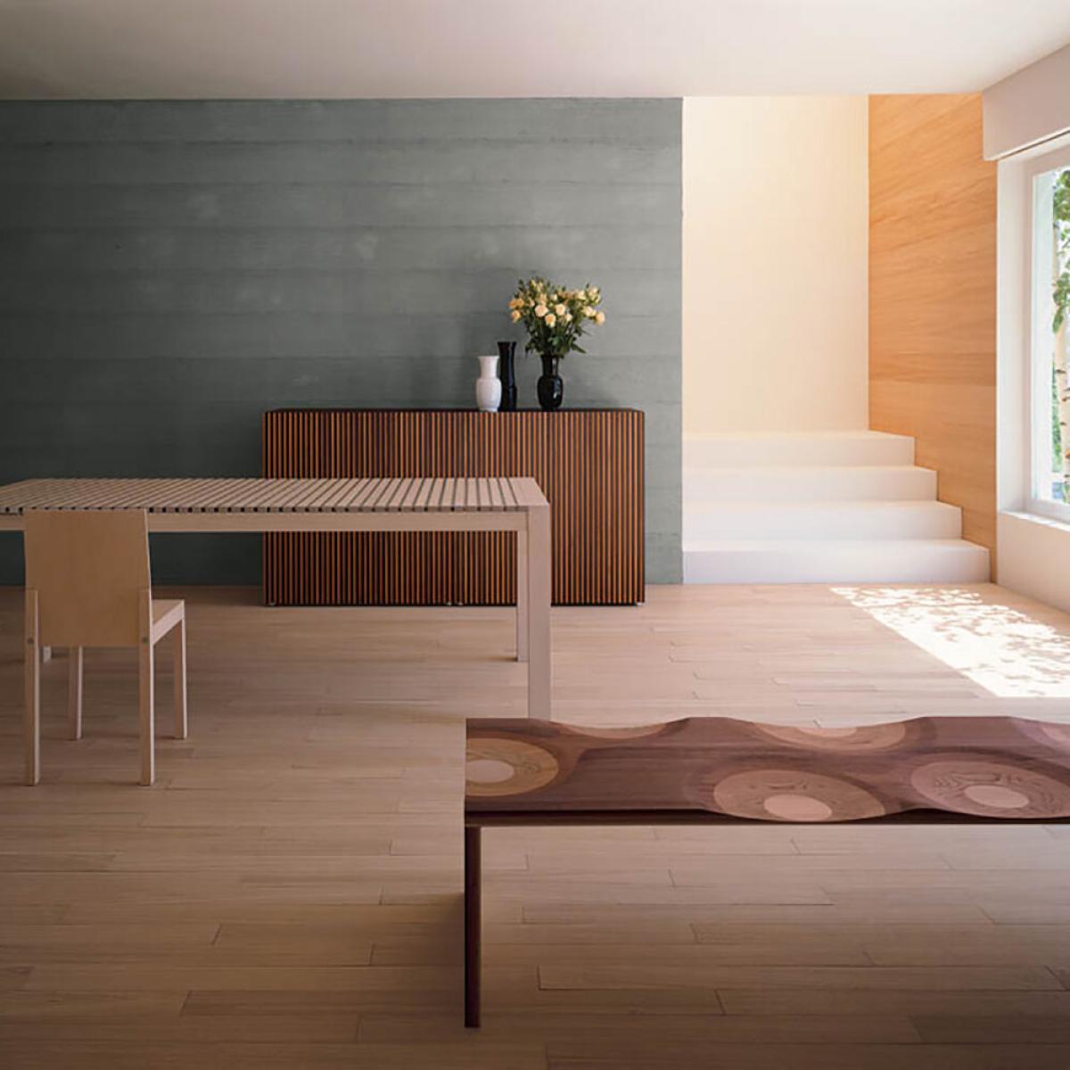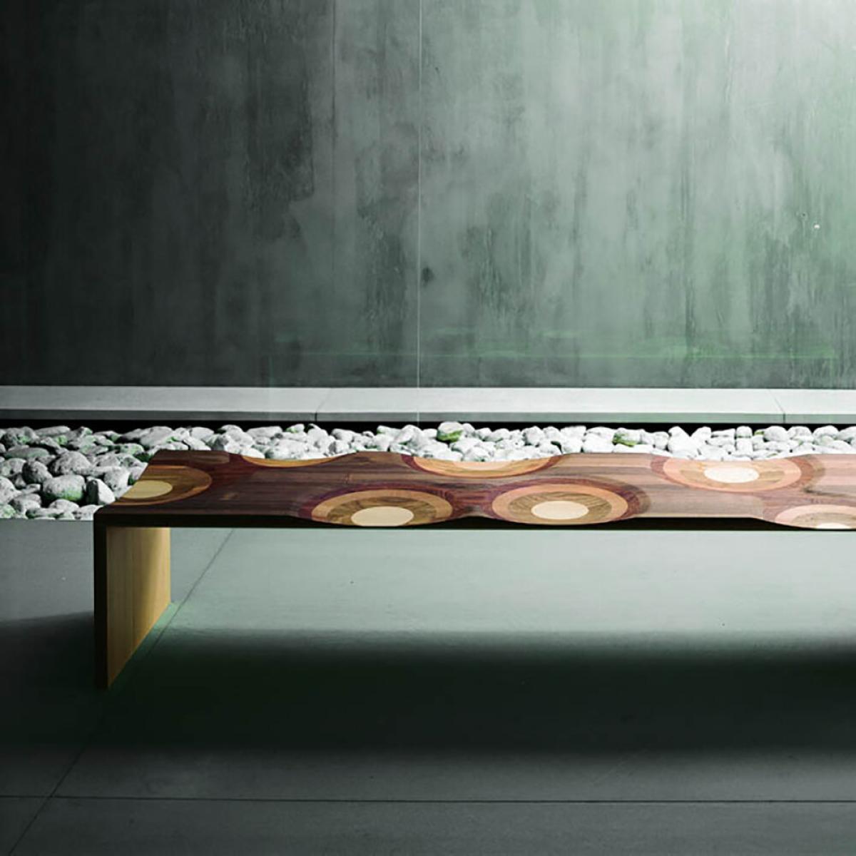 The Ripples bench is a true icon of international design. Winner of the 2004 Compasso d’Oro, it seamlessly blends five different solid woods: walnut, mahogany, cherry, oak and ash. Hand finished to produce a polychromatic effect, slide your hand across the surface to enjoy the continuous transition of different materials.