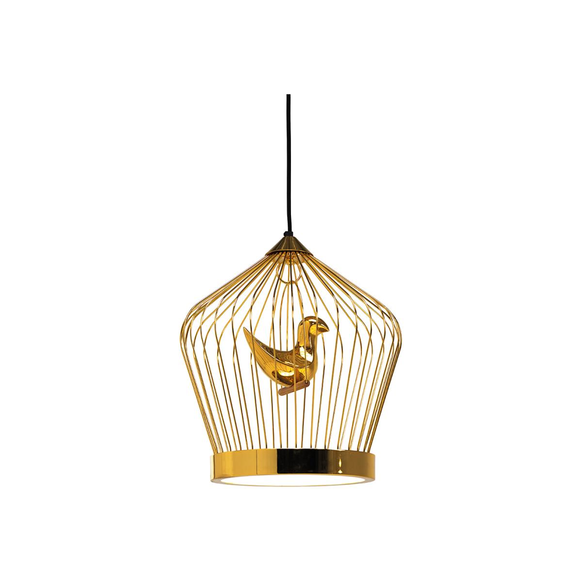 Stylishly illuminate your interior with this Twee T ceiling light from Horm & Casamania. Crafted from metal, this bird cage shaped light is enhanced with luxurious 24 carat gold plating and features a hand decorated ceramic bird, an icon of high class status in Britain in the Middle Ages. The LED lighting fixture is at the base of the cage and is covered by a double polycarbonate shielding that illuminates both the interior of the cage and the room it is placed in. A striking addition to any setting, coordinate your space by pairing this light with complementing home accessories available separately from Horm & Casamania. Key features: * Ceiling light * Material: metal, ceramic * Dimensions: H46xØ41cm * Bulb required: LED (included) * Cable length: 2m * Designed by Jake Phipps * Bird cage design * Hand decorated bird * Plated in 24ct gold * LED light on base of cage * Covered by a double polycarbonate shielding
