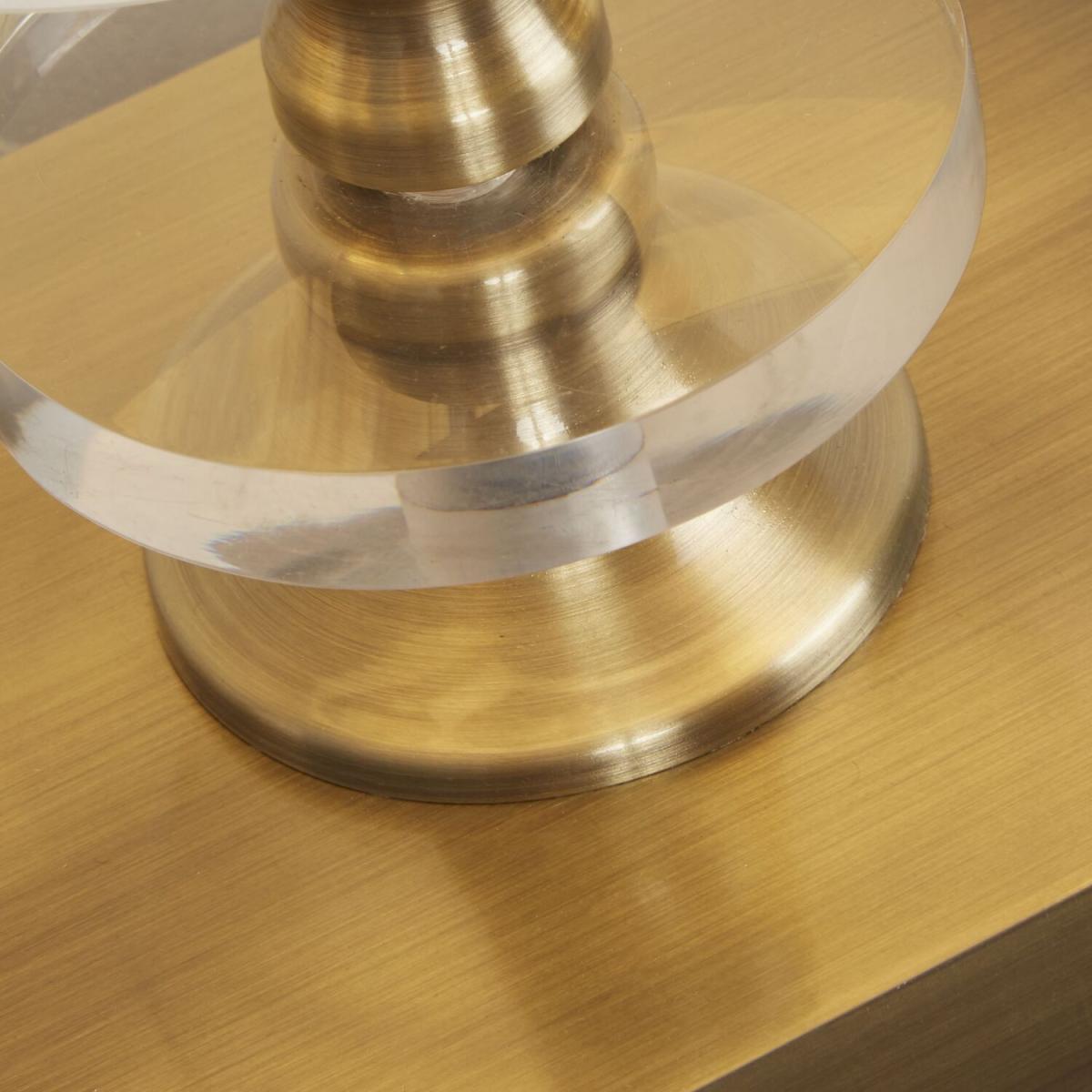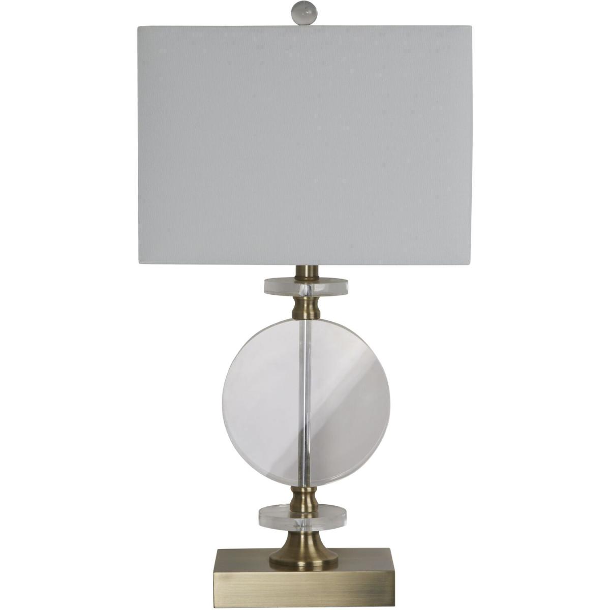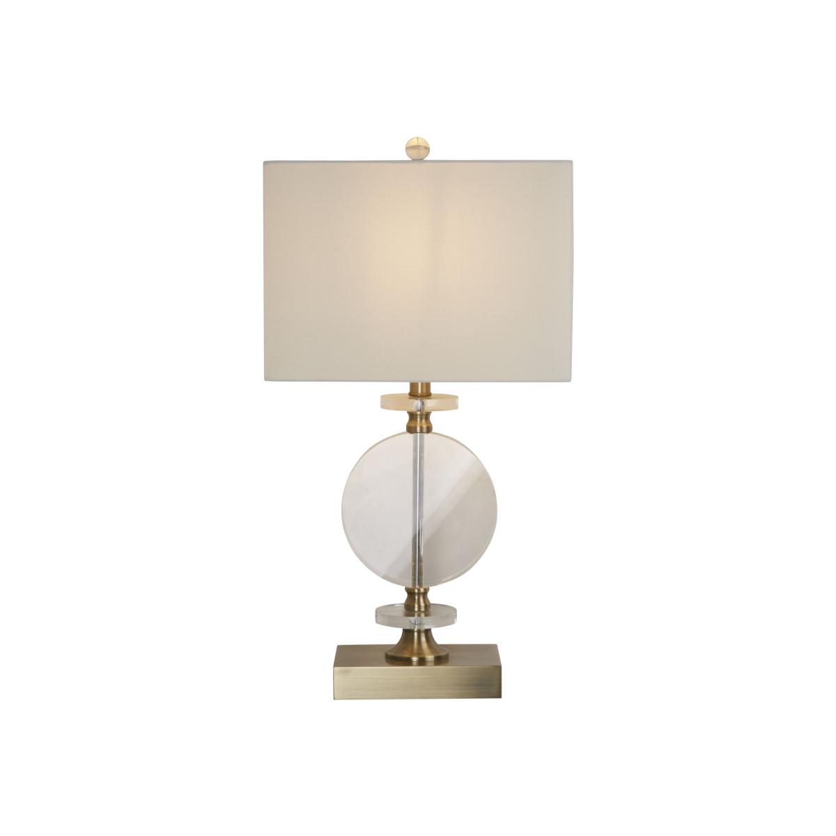 With a unique design base and luxurious white linen shade, this simple yet stylish table lamp will elevate any room in your home. The antique brass base has beautiful clear acrylic circles which add an air of elegance to this beautiful lamp, which will work in both modern and more traditional homes. Ideal as a statement feature in a living room or hallway, or even when used as pairs in a bedroom, this stunning 69cm high table lamp will add modern glamour to any home.