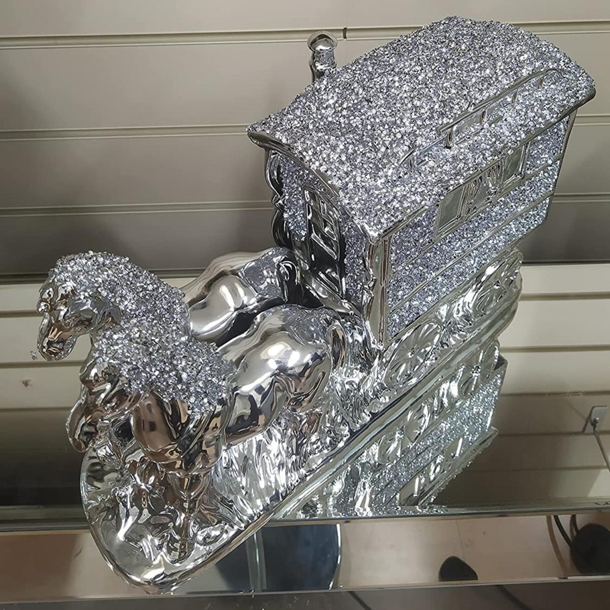 I love this glittering piece for its playful take on classical motifs, making it a real statement sculpture in any interior. It works particularly well in eclectic, contemporary, or glamour-inspired spaces where it can serve as a focal point. To style it effectively, consider pairing it with neutral or metallic accessories to let the ornament stand out, and place it on a mantle, side table, or in a display cabinet where its reflective qualities can catch the light. Keep the surrounding decor minimal to allow the carriage to shine, and think about adding subtle touches of silver or platinum to create a cohesive, luxe aesthetic.