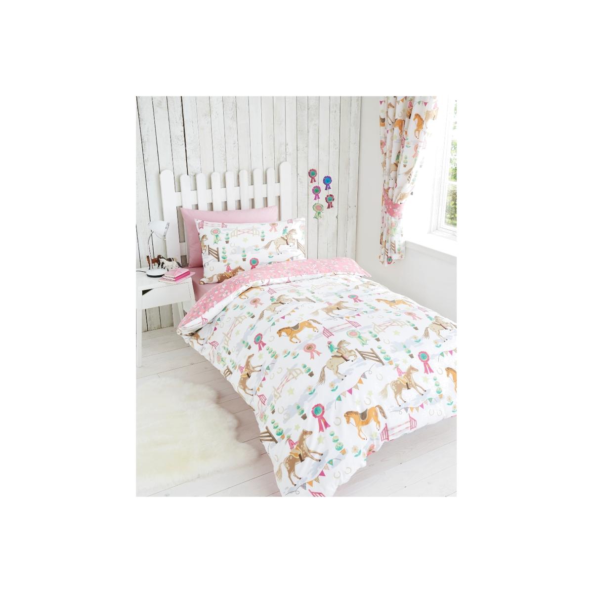 A beautifully illustrated gymkhana design duvet and pillowcase set, with jumps, rosettes and elegant horses complete with a mini floral reverse. Matching curtains are available.
