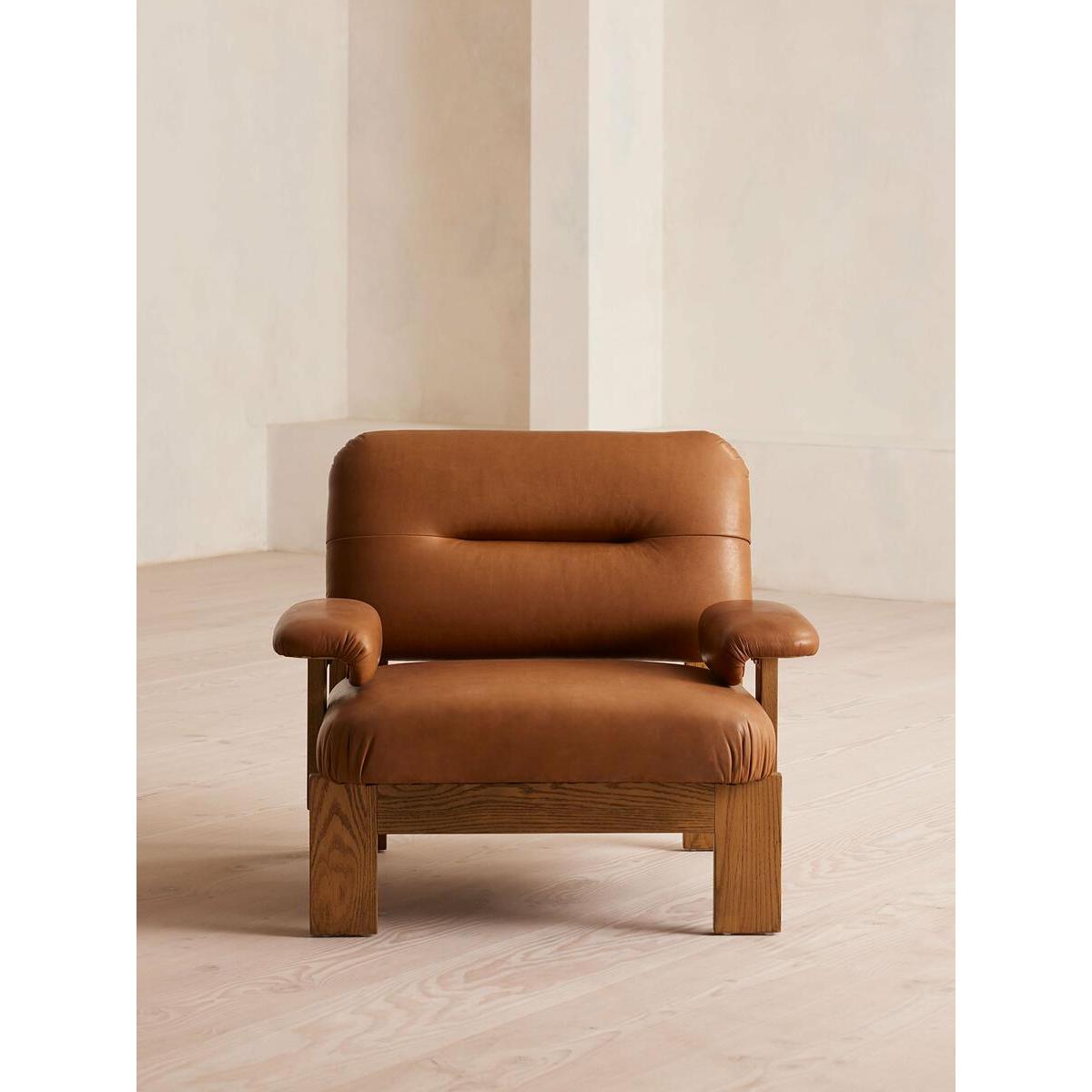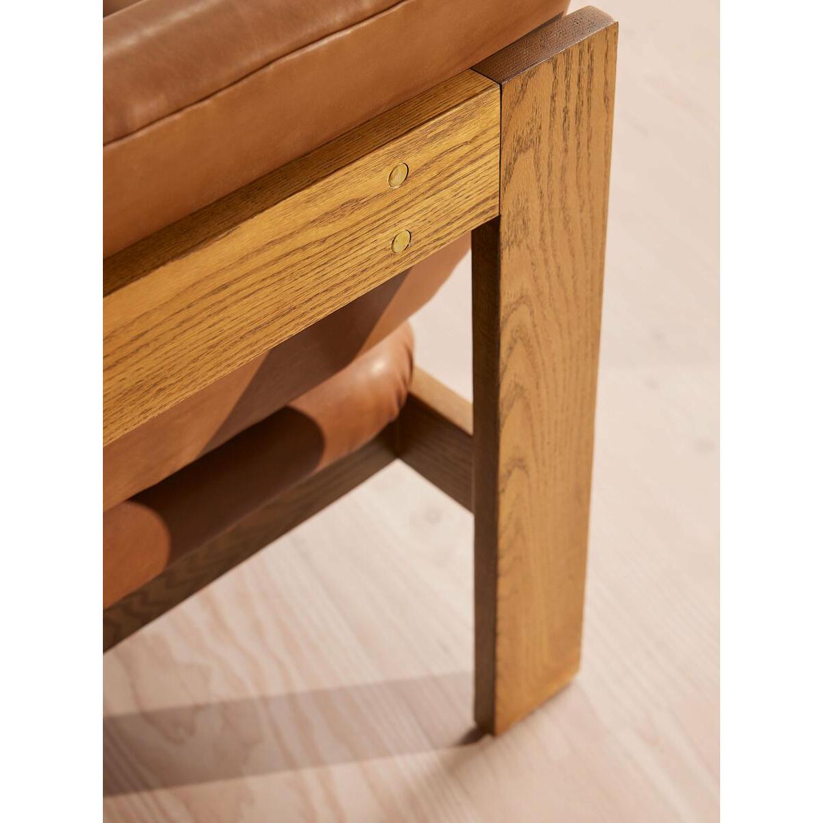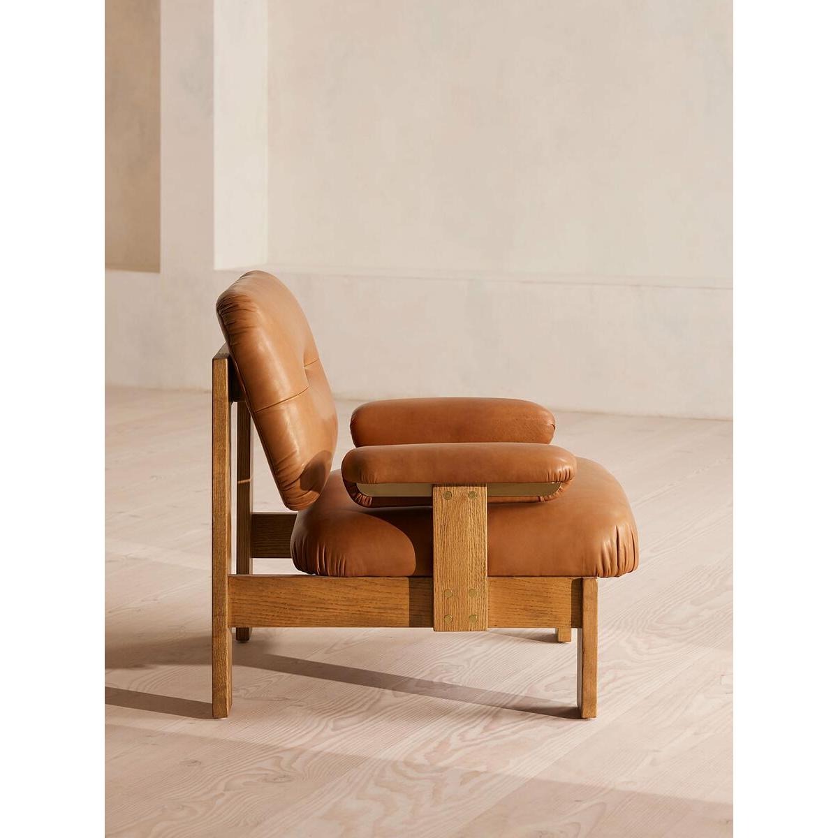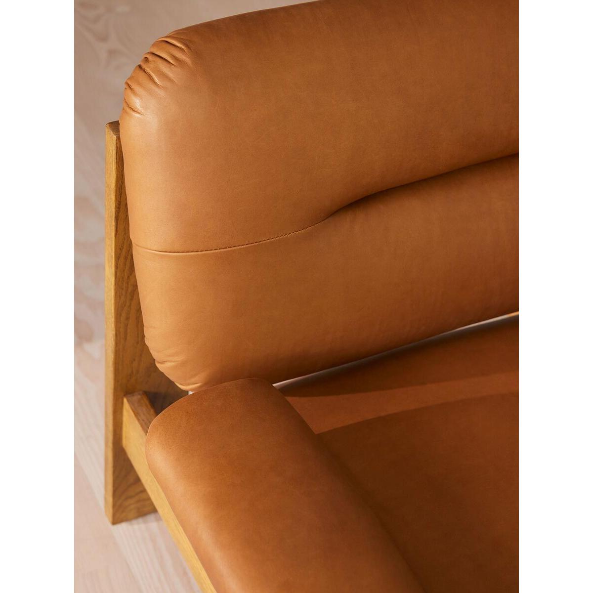Our Horton armchair nods to the retro silhouettes and colour palettes of White City House. Built in solid oak, the standout chair is upholstered in a versatile, chestnut leather with brass joint detail and a pulled back section within the backrest to create definition. Display the chair in an office or reading nook to welcome instant warmth and a 1960s-inspired aesthetic into your space. Chestnut leather Brass joint detailing Pulled back detail Natural gathered accents Solid oak frame Inspired by White City House Leather hide is a natural material and will therefore vary in appearance within each armchair.