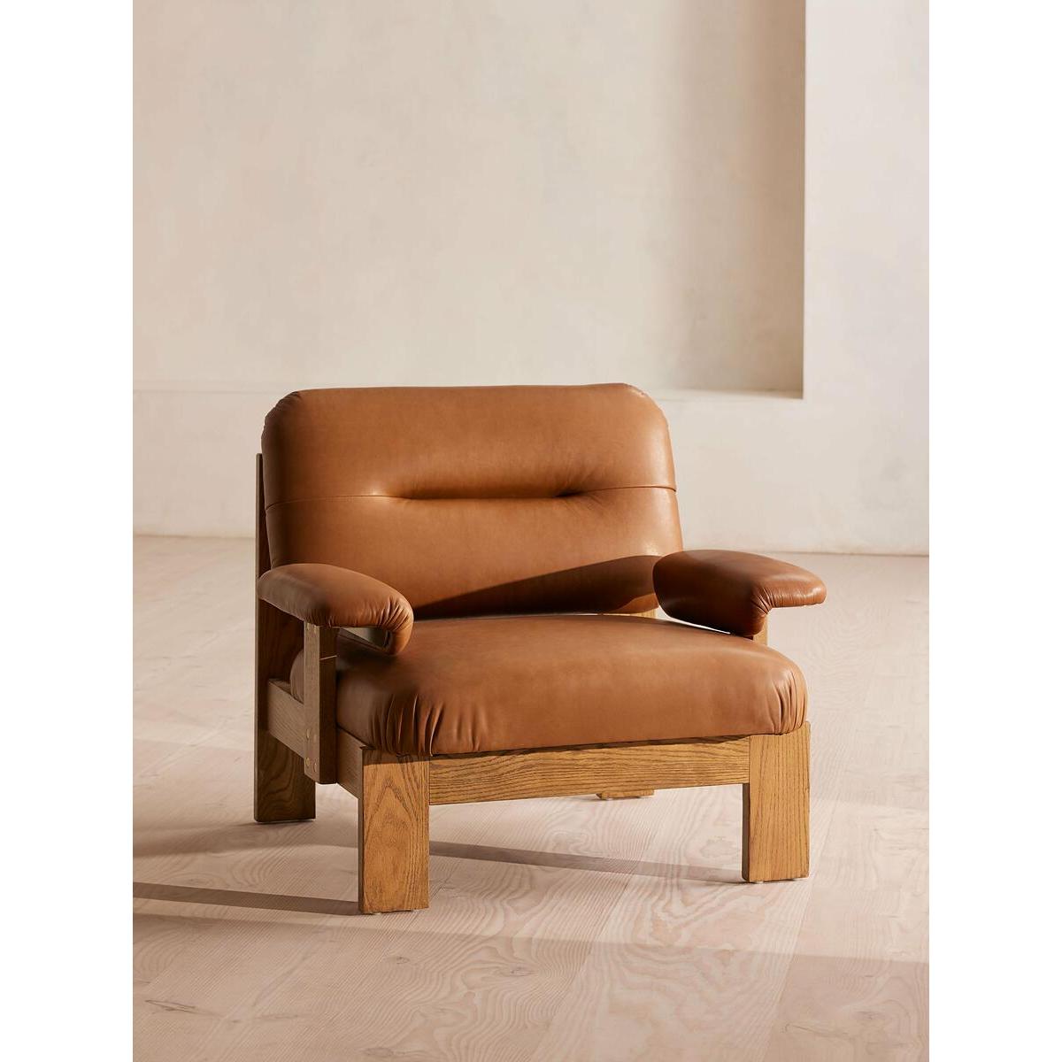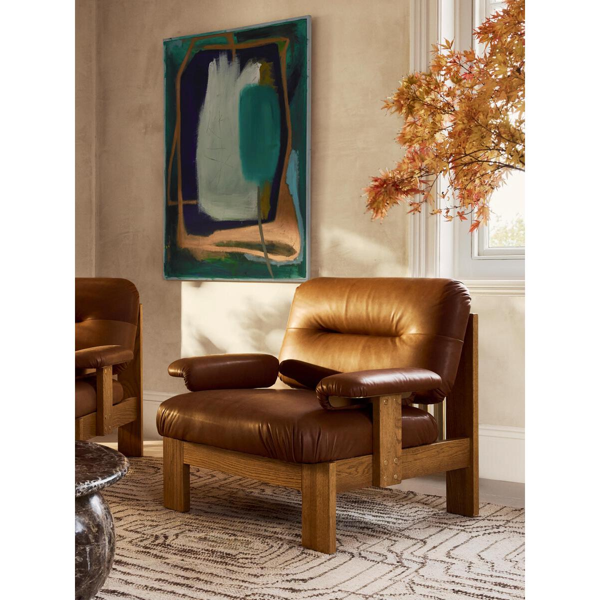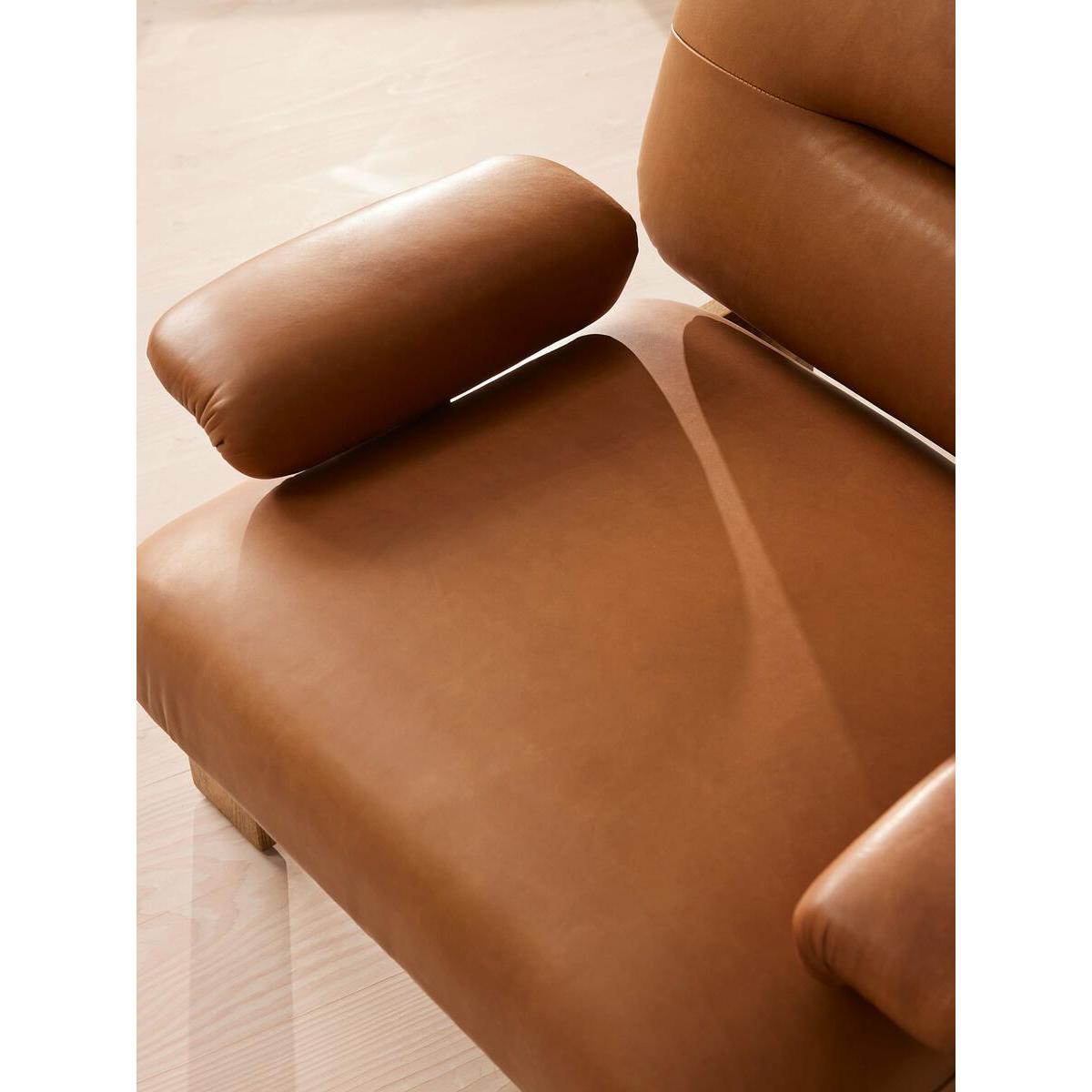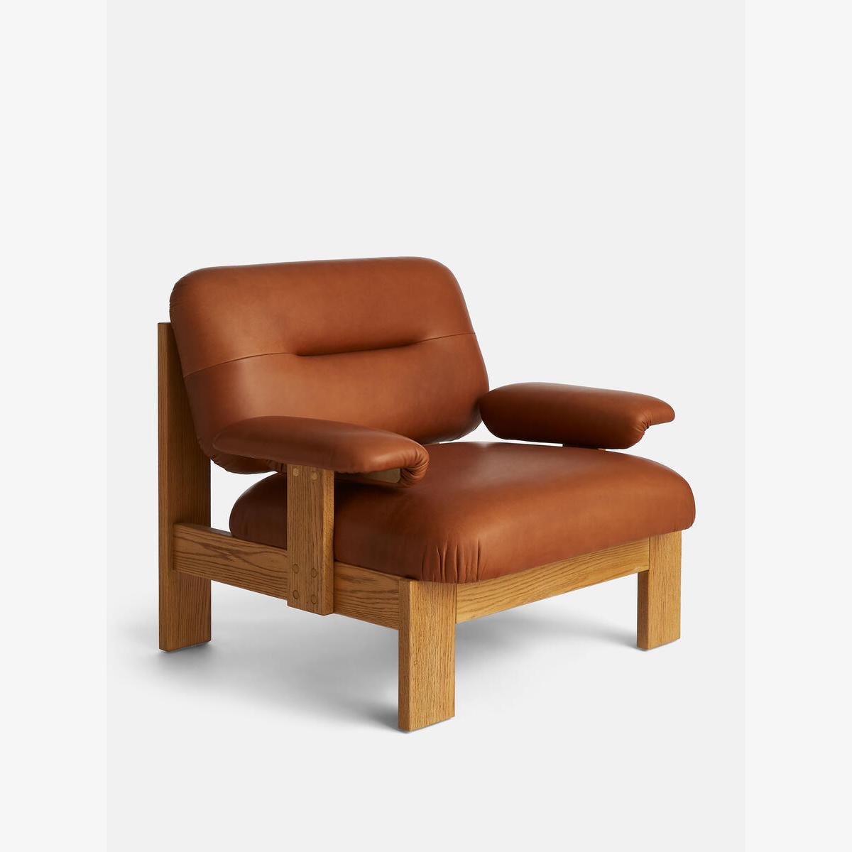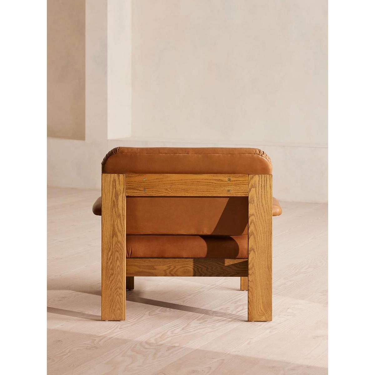 Our Horton armchair nods to the retro silhouettes and colour palettes of White City House. Built in solid oak, the standout chair is upholstered in a versatile, chestnut leather with brass joint detail and a pulled back section within the backrest to create definition. Display the chair in an office or reading nook to welcome instant warmth and a 1960s-inspired aesthetic into your space. Chestnut leather Brass joint detailing Pulled back detail Natural gathered accents Solid oak frame Inspired by White City House Leather hide is a natural material and will therefore vary in appearance within each armchair.