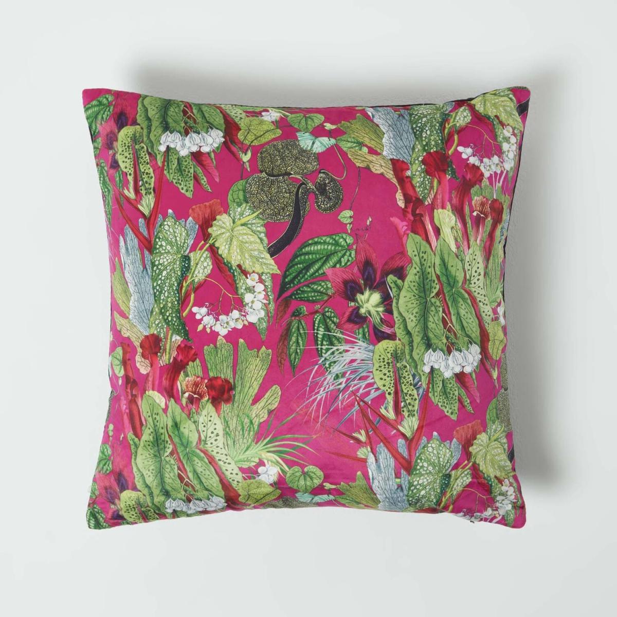 On-trend velvet cushion with a reversible design. Plain on one side, with a tropical velvet print on the other, this velvet cushion is ideal for adding a burst of colour to your living room or bedroom. This contemporary-style cushion cover is woven from super soft velvet and features a plain reverse, making it easy to style. Complete with a generous microfibre filling, this cushion is perfect for layering up on your sofa and bed, or use alone on an armchair for added comfort. Each cushion measures 46 x 46cm, cool wash at 30 degrees only.