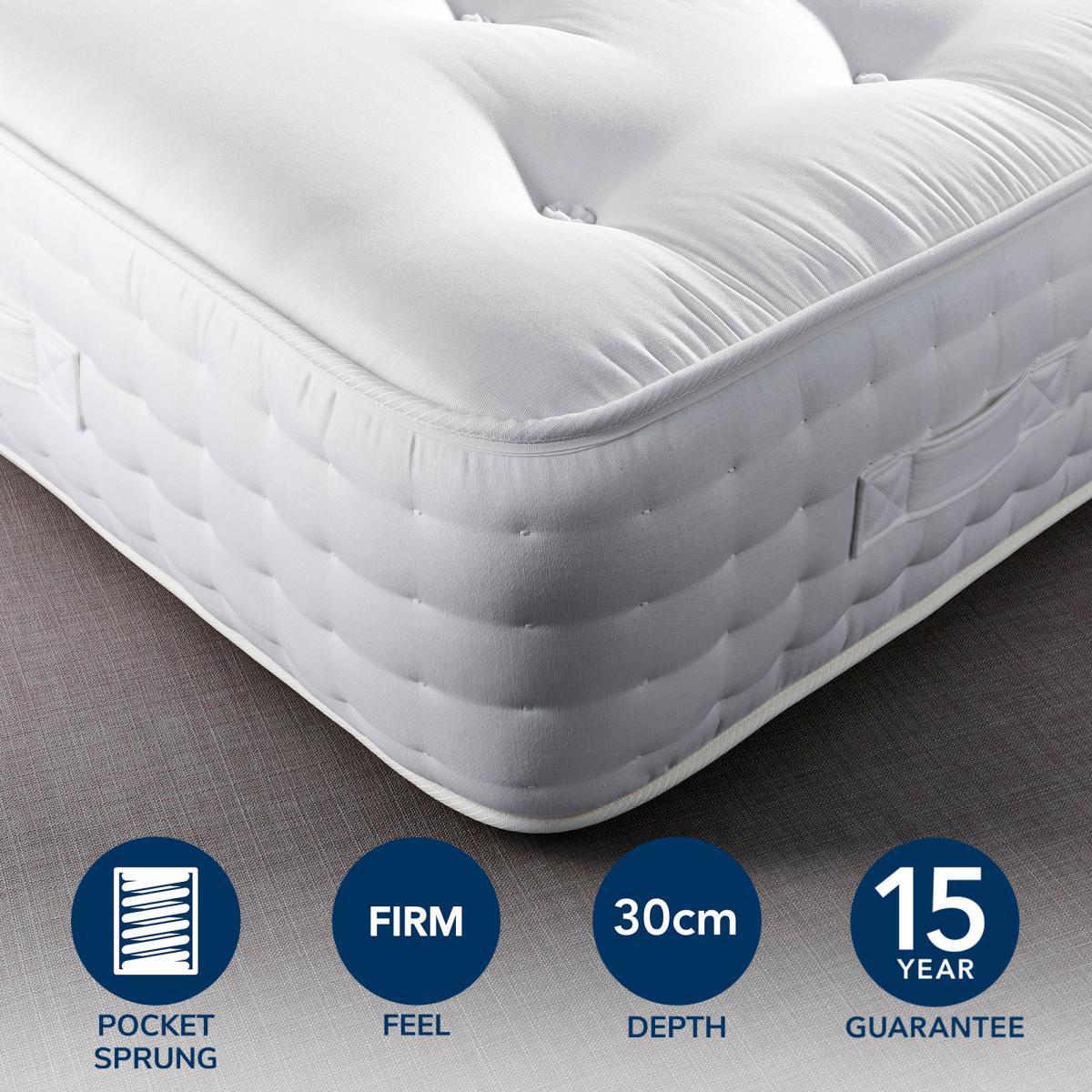 * 1000 individual pocket springs plus 4000 mini springs to limit disturbances* Firm Support – ideal for back sleepers* 100% Cotton Cover – added breathability* Eco-polyester Filling – made from recycled polyester fibres* Wool Comfort Layer – naturally temperature regulating* Hand Tufted – hold the filling in place* Reinforced side support – prevents collapsing at the side for a greater sleeping area* 8 x Handles for even easier moving* 15-Year Guarantee* Handmade in the UK Sleep in lavish luxury with our Hotel Ambassador Pocket Sprung Mattress. The Ambassador features a middle layer of 1000 springs encased in their own personal pockets; this layer is then surrounded by an extra 4000 mini springs for the perfect sumptuous slumber. Each individual spring responds to your body’s movements and limits other movement disturbances making this mattress perfect for light sleepers. Wrapped in a 100% cotton cover and finished with 8 air vents for improved breathability and pressure regulation, this Hotel mattress perfectly combines luxury and sustainability, layering up extra indulgence between you and the springs – including an eco-polyester layer made from recycled polyester fibres and an added wool comfort layer to help regulate your body’s temperature and to help absorb moisture. With a firm support comfort grading, this mattress is recommended for back sleepers. To keep your mattress perfectly formed, the edge is designed with reinforced side support to ensure the edges don’t collapse and to increase your sleeping area. Designed with a hand tufted top to hold the filling in place, prevent it from sinking and keep your support consistent, this mattress is complete with 8 handles to make moving it easier than ever. Prolong the life of your mattress by flipping and turning regularly to redistribute the support and help prevent an uneven sleeping surface. This product is supplied by NBF Approved Members, who have been independently audited against a set of strict criteria and standards set by the National Bed Federation. Need to throw out your old mattress first? View our information on [mattress recycling and collections.](https://www. dunelm. com/info/about/mattress-and-furniture-recycling)* For health and hygiene reasons, we are unable to offer refunds or exchanges on Mattresses unless they are returned unused and in their original packaging. For more information please see our Easy Returns section. Suitable for domestic or commercial use. Please note that the guarantees shown are for domestic, non-commercial use only.