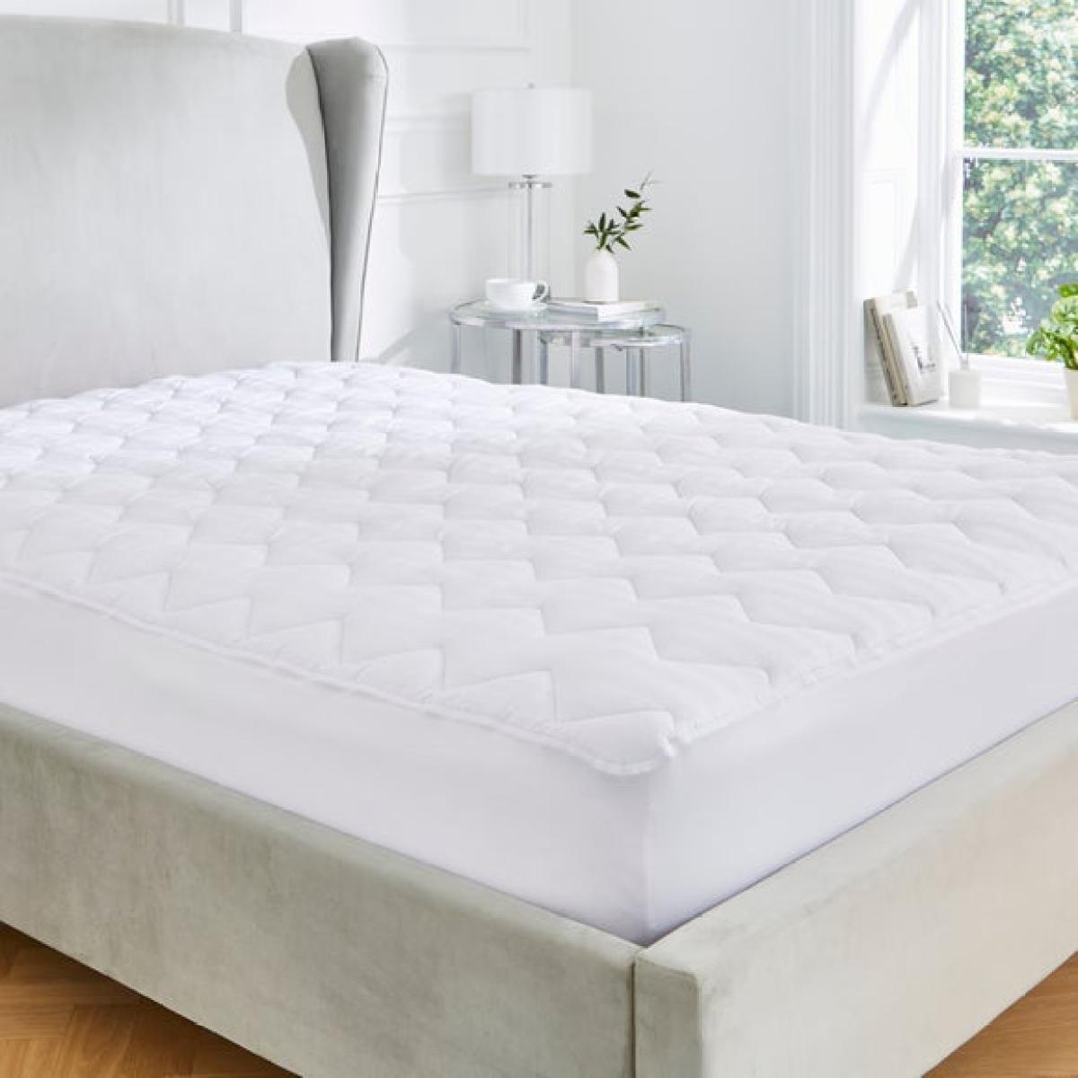 * Premium 240 Thread Count 100% Cotton Cover * 100% Polyester Filling * Treated with Anti-Allergy technology for an extra peaceful sleep * 35cm Depth * Machine Washable, Not suitable for tumble drying or ironing Get the 5 star Hotel experience with this luxuriously plush mattress topper from the esteemed Hotel Collection. Perfect for allergy suffers, this mattress topper sports an extra strong, 240 thread count cover to prevent mites from effecting your sleep and the creation of dust molecules. Soft and crisp, the 240 thread count cover is composed from 100% cotton, promoting breathability through out the night. Featuring a plush 100% polyester fibre filling, this topper is built to remain plush for longer while protecting your mattress at the same time.