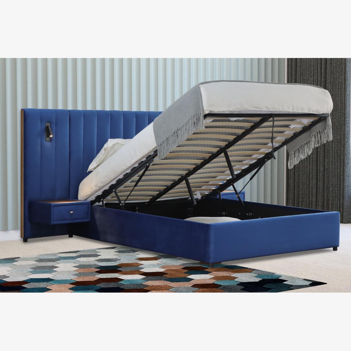 Large headboard upholstered in plush padding creates a standout piece bed in any room. Deep navy blue bed is an compliments any bedroom interior with wide headboard making this bed a feature piece of bedroom furniture. 2 Bedside tables built in with drawers for super handy area to store your bedside essentials. Featuring swivel reading lights and 2 USB chargers to power up your devices overnight. The Ottoman storage unit is not included in the sale. Create extra space in your bedroom with large underbed storage compartment. Easy access front opening gas lift up bed has plenty of space to store clothes, boxes, duvets & bedding. With a base sheet included to keep them dust free. Premium soft to touch velvet fabric with extra padded upholstery creates a cosy sleeping environment. Sprung wooden slats support & absorb weight of sleeper and mattress. Made with a strong steel internal frame with centre support beams and adjustable legs for stability. Robust, strong plywood slats in multiple zones to spread the weight of mattress. Solid backboard keeps bed stable. Hybrid Pocket Sprung and Memory Foam Mattress option. Our highest comfort pocket sprung and memory foam hybrid mattress. Breathable cool touch hypoallergenic cover, anti dust and anti mite. High density 3cm foam and memory foam quilted top layer. Medium firm for all ages and sleeping positions 16cm thick.