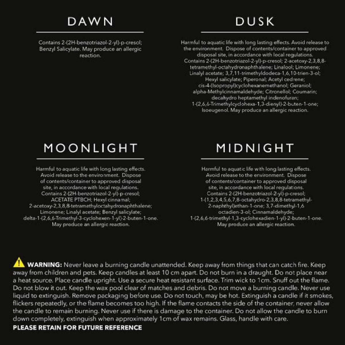 * Set of 4 candles * 4 Hotel scents * Stylish glass jars * Perfect gift idea Discover the Hotel Candle Fragrance Library Gift Set, a perfect present for a loved one. This set includes four mini candles, each offering a unique scent journey: * Midnight: Drift into a distant paradise with dark cassis, patchouli, coconut, and a rich vanilla base. * Moonlight: Experience cool bergamot and lime, a hint of amber, and the grounding embrace of cedarwood, suede, and saffron. * Dusk: Capture the golden glow of evening with orange blossom and jasmine on a base of vanilla and amber. * Dawn: Unfold white floral notes and elderflower, complemented by bright plum and red berries. Presented in stylish coloured glossy vessels, each of these four mini candles provides up to 15 hours of burn time.