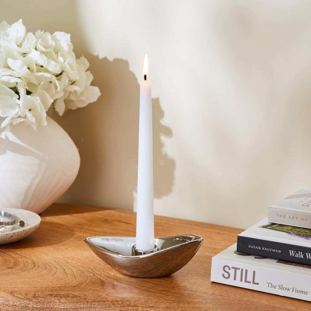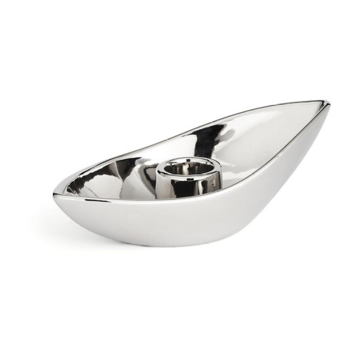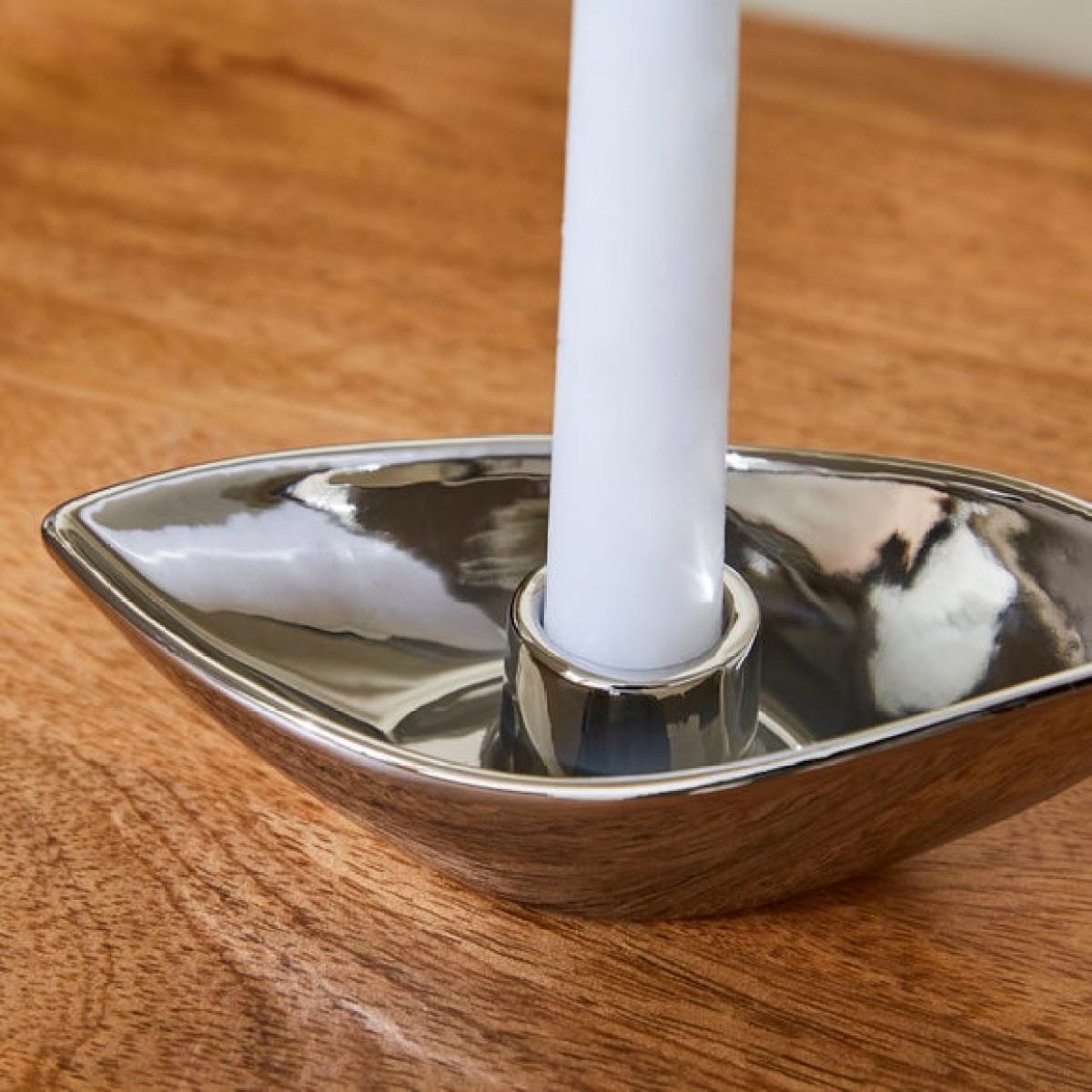 * Made from ceramic * Chrome finish * Sleek design * Designed for taper candles (not included) Bring a soft glow to your space with this ceramic taper candle holder. The chrome finish gives it a sleek, modern look that works well on dining tables, shelves or sideboards. Designed to hold taper candles, it’s a simple way to add a bit of atmosphere to your evenings. Whether you’re setting the mood or styling a shelf, it’s a handy piece to elevate your décor.