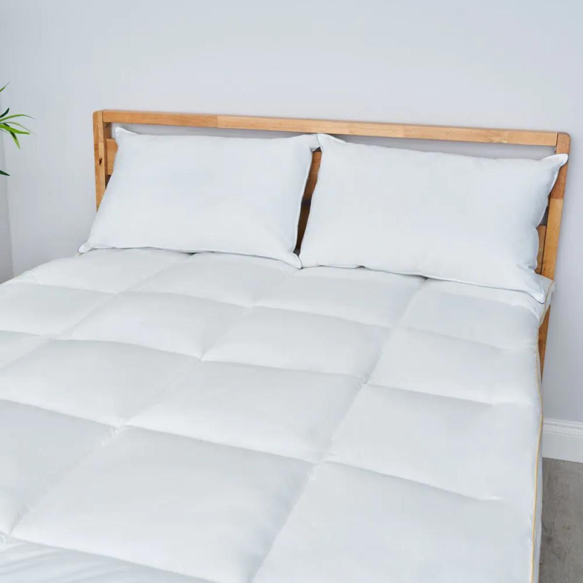 Get a seamless sleep experience while safeguarding against allergens with our Hotel Collection Luxury Cotton Anti-Allergy Mattress Enhancer. Made with FR-treated fabrics, it offers fire-resistant protection in addition to allergy defence, with a 4-5cm deep filling and gold piping for an added touch of opulence. Available in single, double, king, and super king sizes, you can be sure to elevate your bed's comfort and safety with this premium mattress enhancer, packed in a carry bag with rope handles for your convenience.