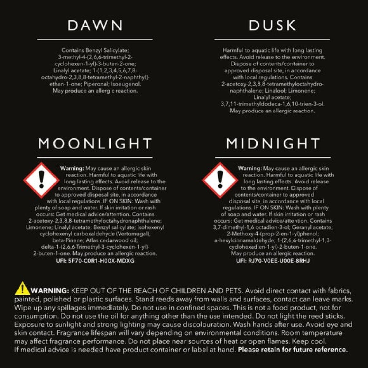 * Set of 4 mini diffusers * Stylish square bottles * 4 Hotel scents * Great gift idea This Hotel Diffuser Fragrance Library Gift Set makes the perfect present for a loved one, featuring four 50ml diffusers, each in a coloured glossy bottle with its own set of black fibre reeds. Explore four captivating scents: * Midnight: Drift away to a tropical night with dark cassis, patchouli, coconut, and a rich vanilla base. * Moonlight: Experience cool bergamot and lime, a hint of amber, and the grounding embrace of cedarwood, suede, and saffron. * Dusk: Enjoy the warm, sweet glow of evening sun with orange blossom, jasmine, vanilla, and amber. * Dawn: Discover white floral notes and elderflower unfolding like morning blooms, with bright plum and red berries dazzling like dew.
