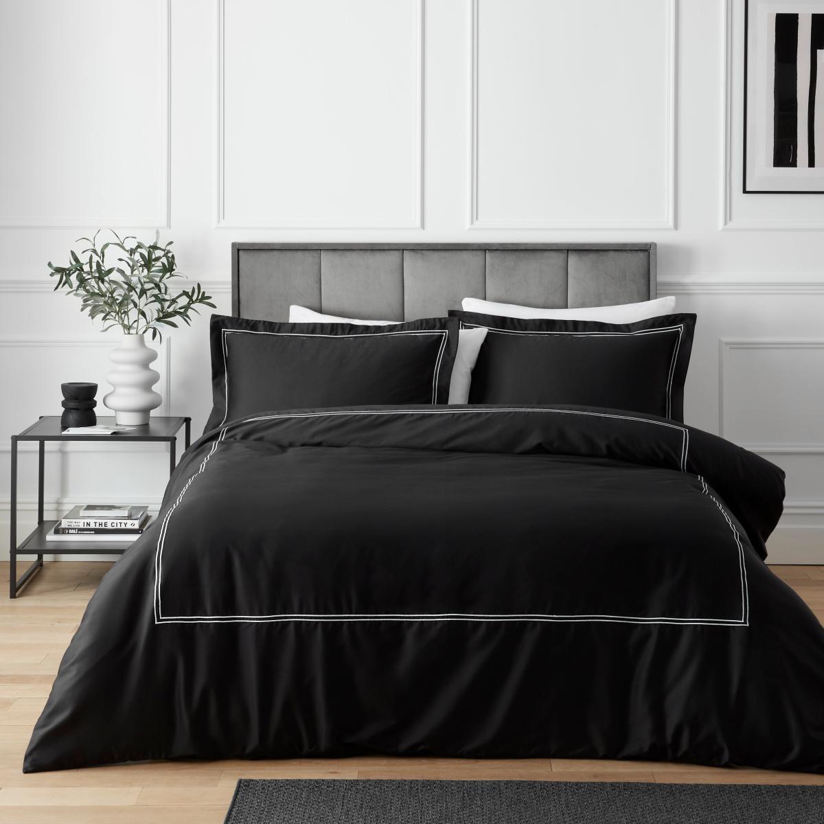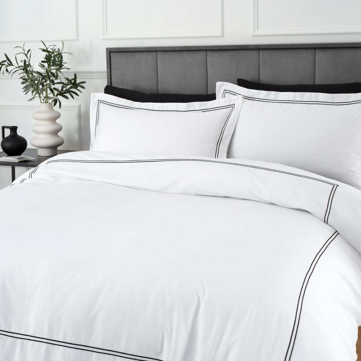 * Made from 100% cotton sateen * Modern contrast stitch design* Includes matching pillowcase(s)* Secure button closure An exquisite and sophisticated choice to bring the indulgence of a hotel getaway into your bedroom. Crafted from 100% cotton sateen, this set offers a luxurious and silky-smooth feel for an opulent night's sleep. The modern contrast stitch design adds a touch of understated elegance to your sleep space, allowing you to effortlessly elevate your bedding. Each set includes matching pillowcase(s) with a secure button closure, ensuring your duvet stays in place for a well-curated and serene bedroom setting. This product is OEKO-TEX MADE IN GREEN certified, meaning it was produced in OEKO-TEX S Te P certified factories - verifying environmental, social, and chemical standards in the facility. It has also been certified to OEKO-TEX STANDARD 100, the original safety standard for everyday confidence. To offer full visibility, the production stages throughout the supply chain can be traced.