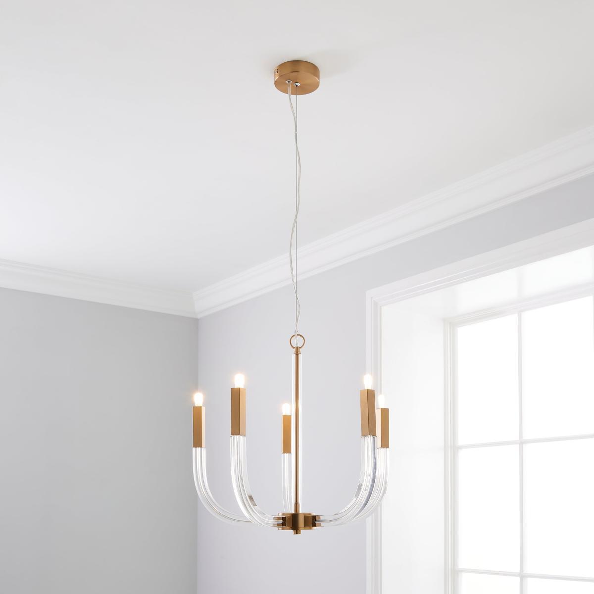 Inject luxury to your home interior with the Hotel Finley 5 Light Ceiling Fitting, this modern light is crafted with a clear acrylic design and stunning metal detailing, suspended from a height adjustable clear flex. This modern ceiling fitting would make a statement piece in any room, with a dimmable feature so the lighting can be adjusted to your mood. Coordinate your home with matching family items, this piece is available in Gold and Silver.