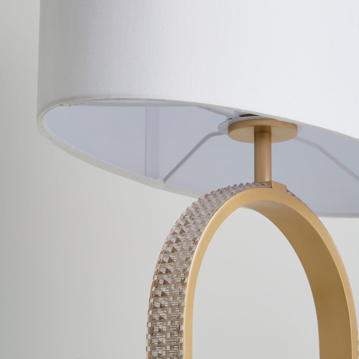 Add a luxurious touch to your home with the Hotel Harrogate Integrated LED Floor Lamp. Featuring a beautiful gold rectangular hoop design, with a crystal effect LED integrated within the light, finished with a striking gold base and a stylish white shade. The Hotel Harrogate Integrated LED Floor Lamp is the perfect piece for adding elegance to your décor, pair with available matching family items to complete the look.