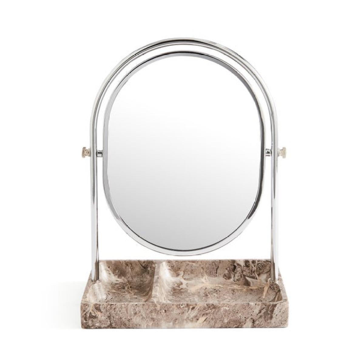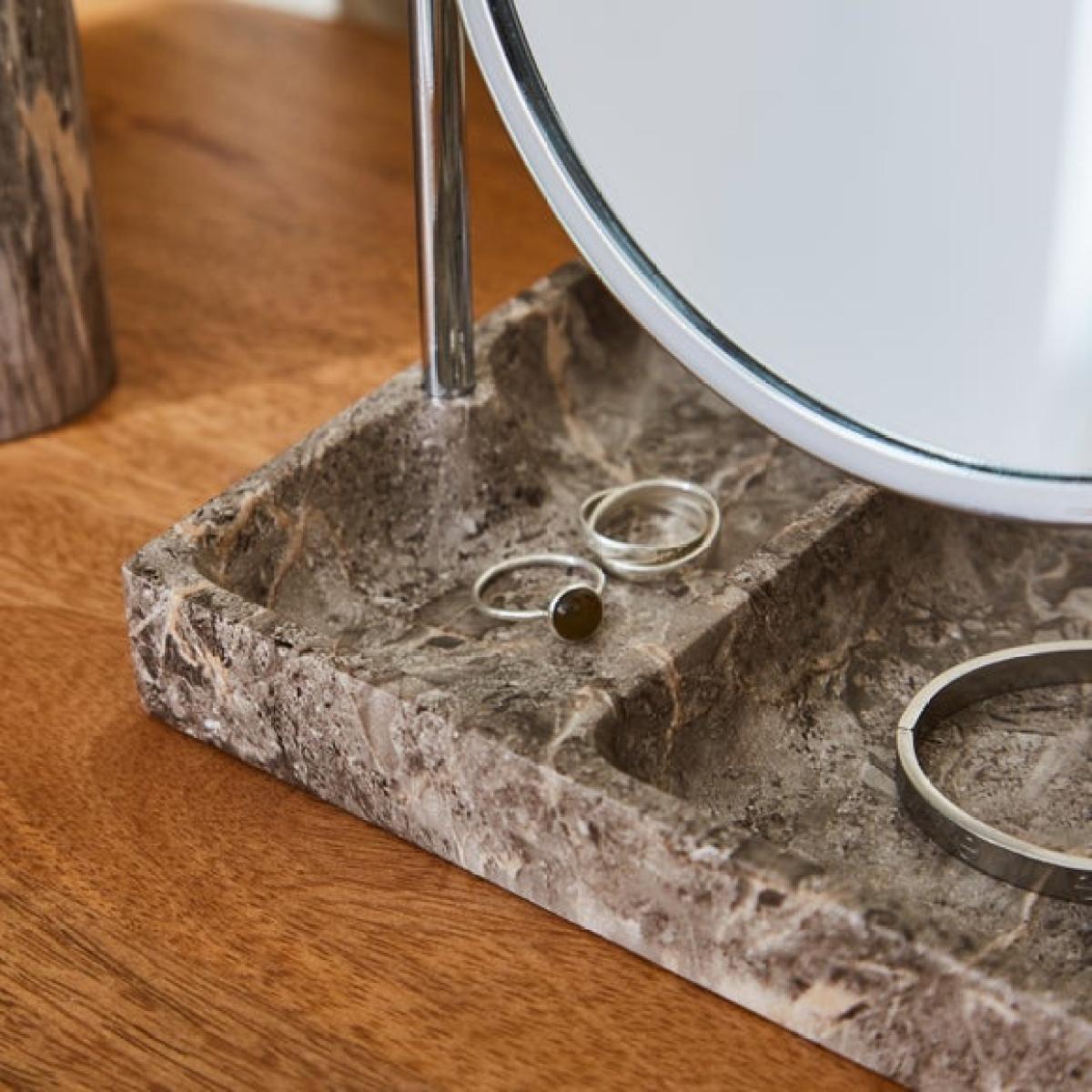 * Marble-effect finish * Built-in tray for small accessories * Ideal for dressing tables or shelves Add a sleek touch to your morning routine with the Hotel Marble Dressing Table Mirror. The contemporary shape and marble-effect finish give it a smart, modern look that works well in bedrooms or dressing areas. The base tray is perfect for keeping small accessories close to hand - think rings, clips or earrings. It’s a simple way to keep things tidy while you get ready for the day.
