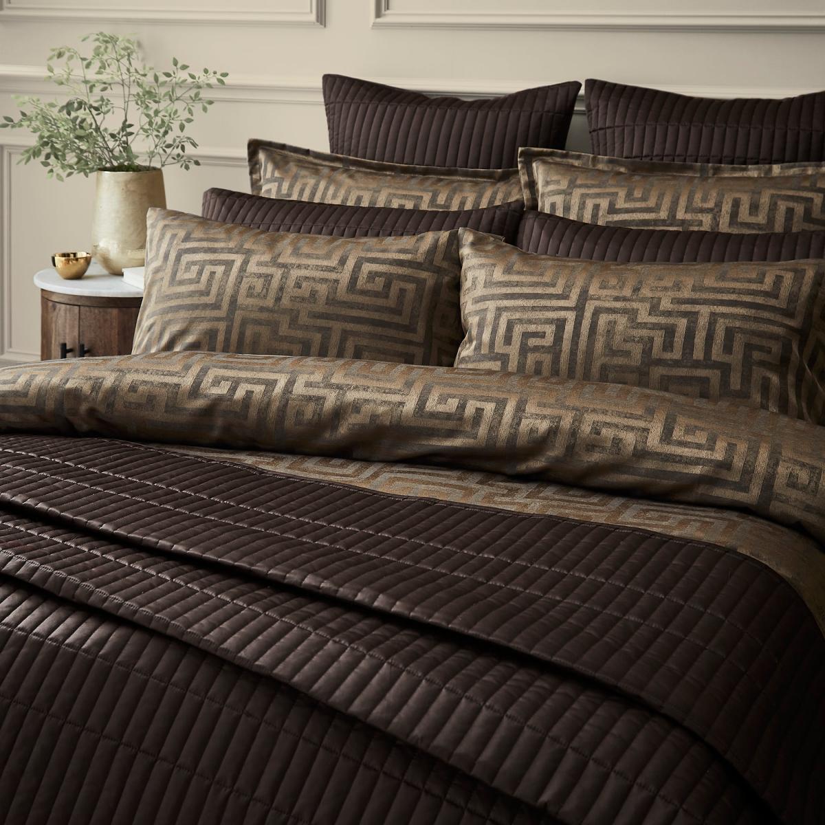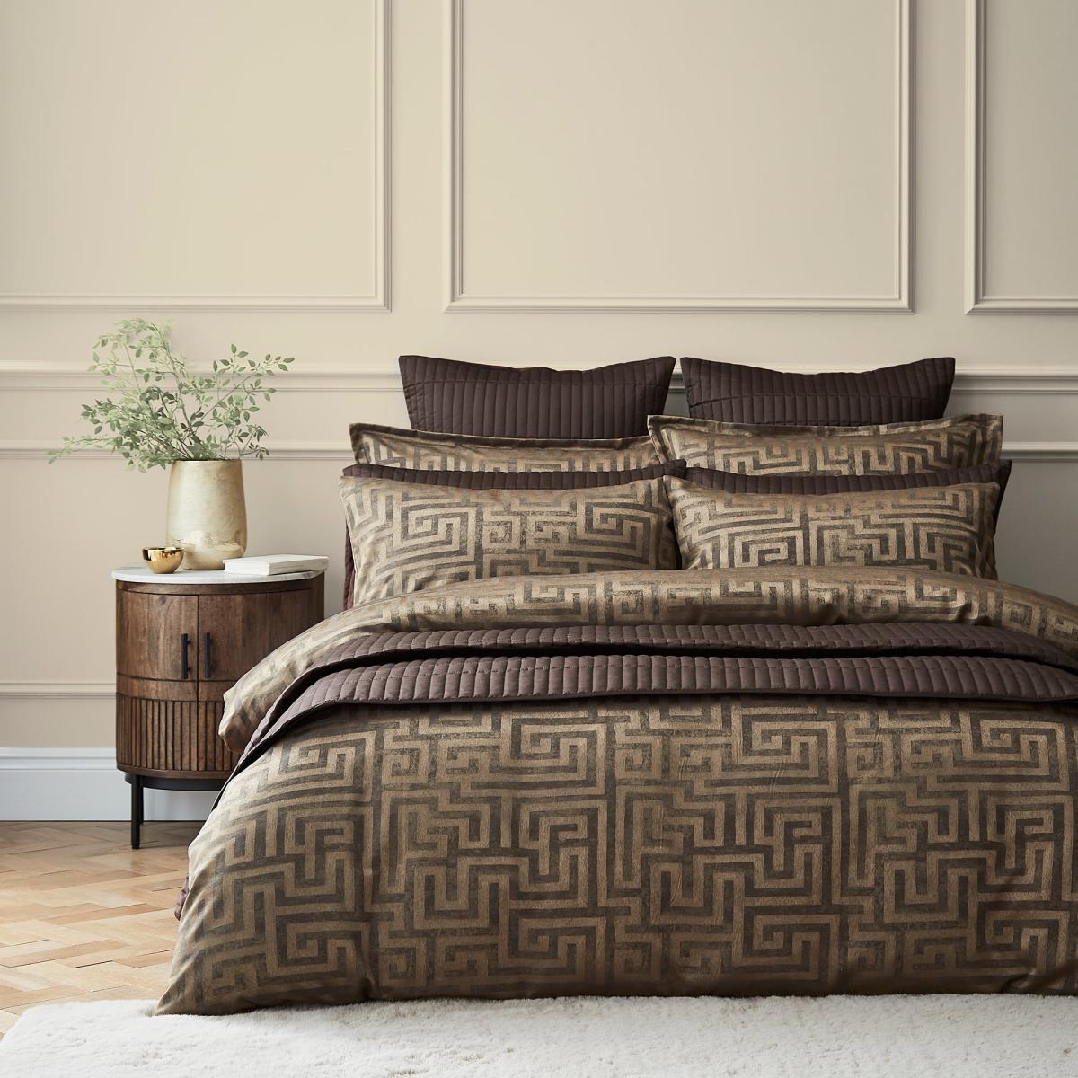 * Soft and durable polyester microfibre composition* Textured Floral design* Button closure* Machine washable* Corresponding items sold separately Elevate your bedroom with our luxurious jacquard Hotel Tris bedding. Featuring a Greek key design in rich gold and deep brown tones, the intricate geometric pattern adds a bold yet refined touch to your decor. Made from easy-care polyester, this bedding is soft, durable, and super easy to wash and care for. The set includes a duvet cover and pillowcase with a button closure, and is non-iron for added convenience. Coordinating items are sold separately.
