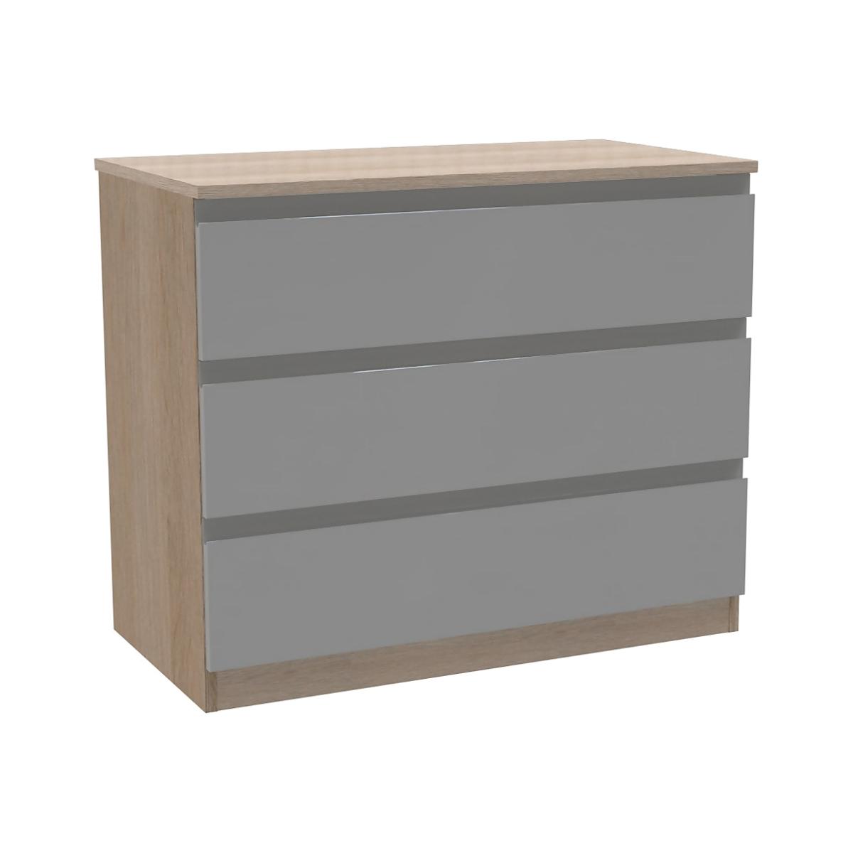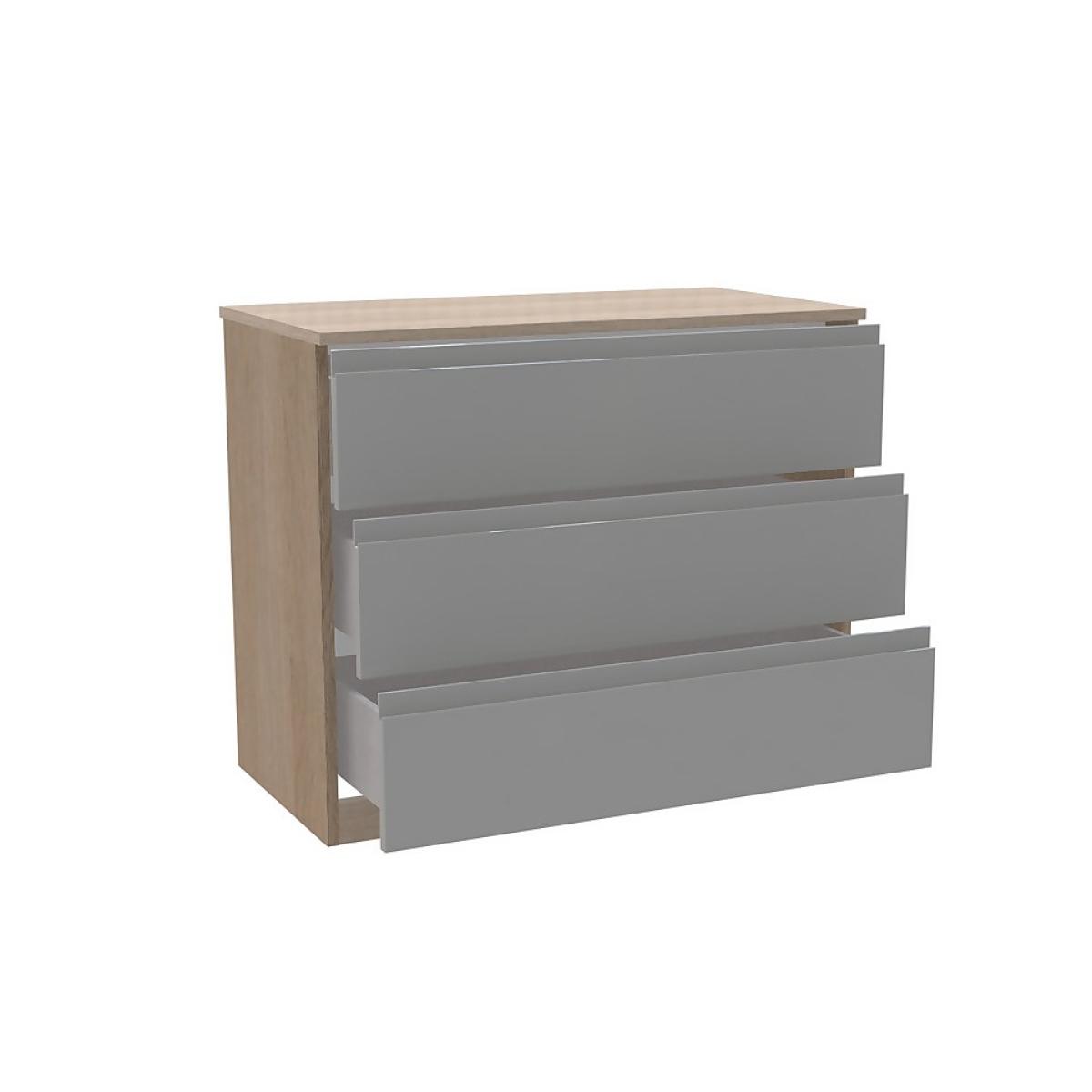 The House Beautiful bedroom range available exclusively at Homebase is full of great ideas and designs for your home. This three drawer chest has been finished with luxurious gloss grey handleless drawer fronts on an oak effect cabinet featuring fully wrapped panels, soft-close clip-on Blum runners and an internal drawer box finished in a textured linen effect.