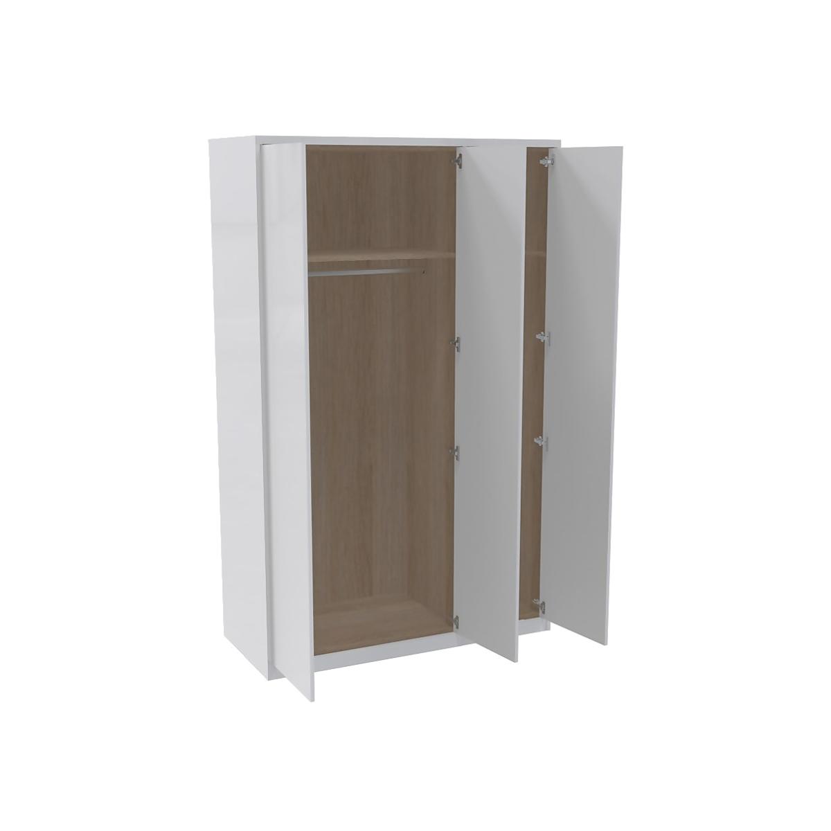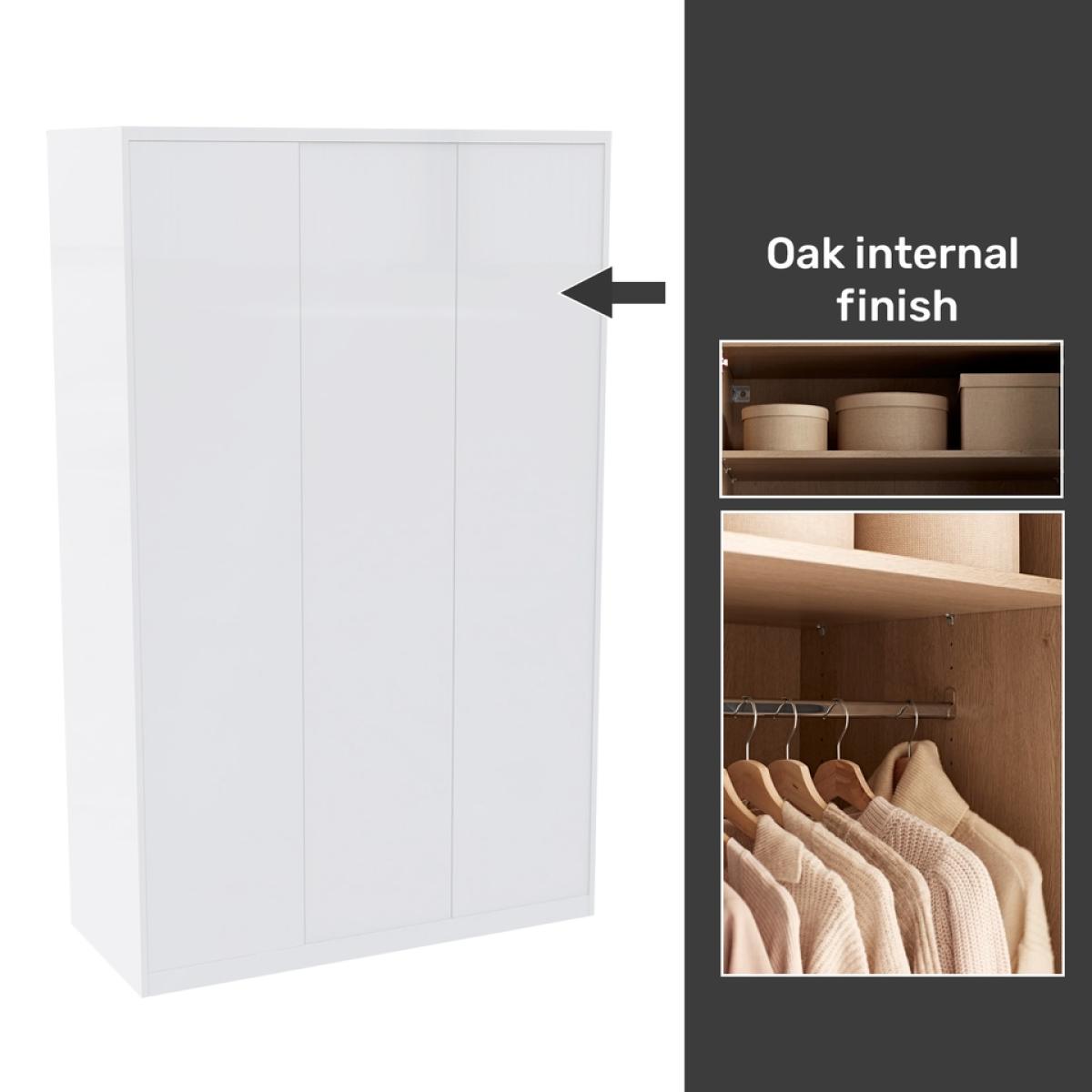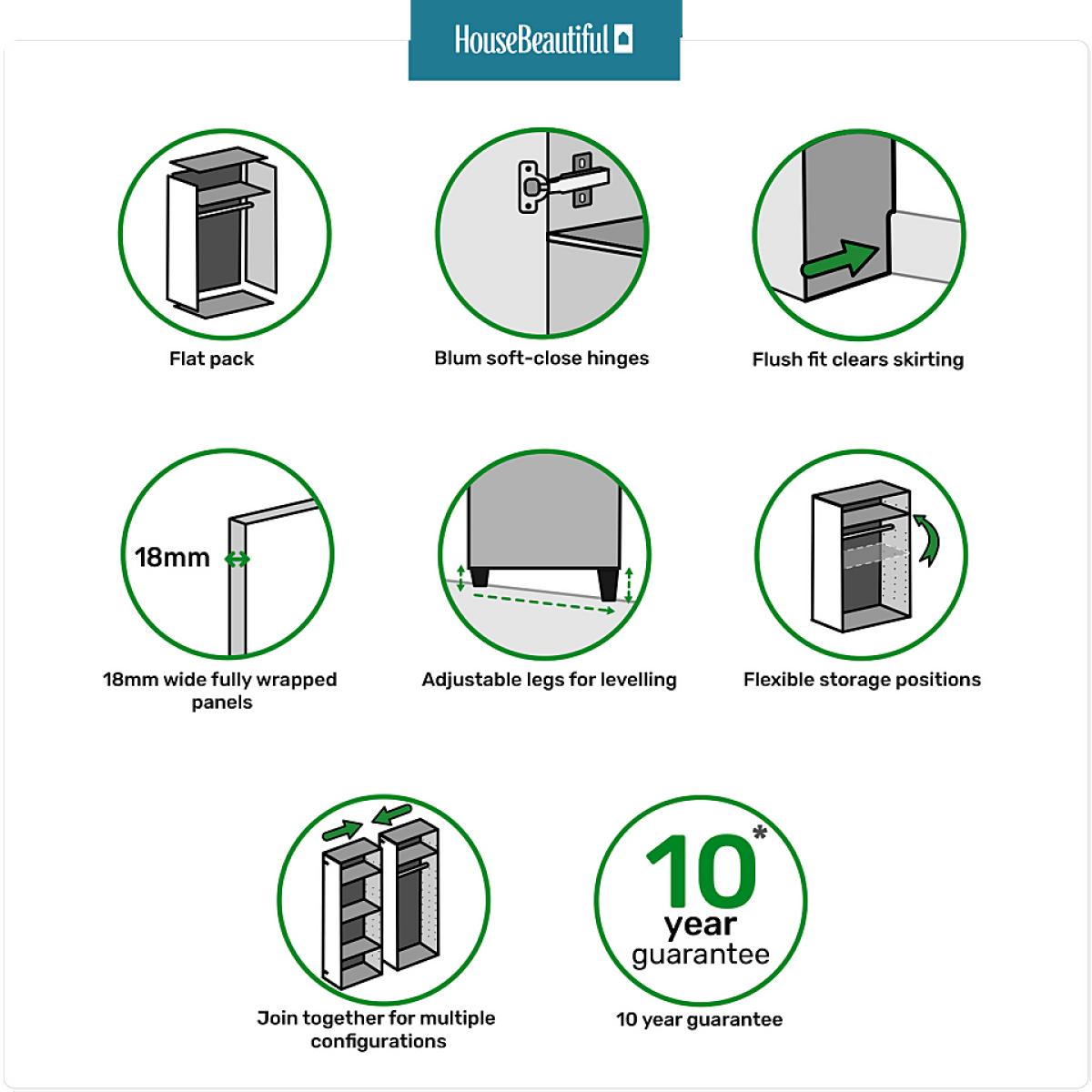 The House Beautiful range is exclusive to Homebase and offers a selection of different finishes and storage configurations to suit your needs. With a range of carcass colours and contrasting door designs, you can select the look to fit your bedroom aesthetic. The House Beautiful range now includes the fully fitted look with this combination pack which includes the wardrobe, end panels, plinth and cornice, meaning you can complete your bedroom with a luxury look. Coordinating chests of drawers are also available separately. This triple wardrobe (1 x double unit and 1 x single unit) features an oak effect internal carcass and includes end panels, plinth and matching cornice all in a finish to match the beautiful luxe gloss white slab doors. The wardrobe features premium soft close clip-on Blum hinges, two shelves and two hanging rails. You can customise your wardrobe with our additional