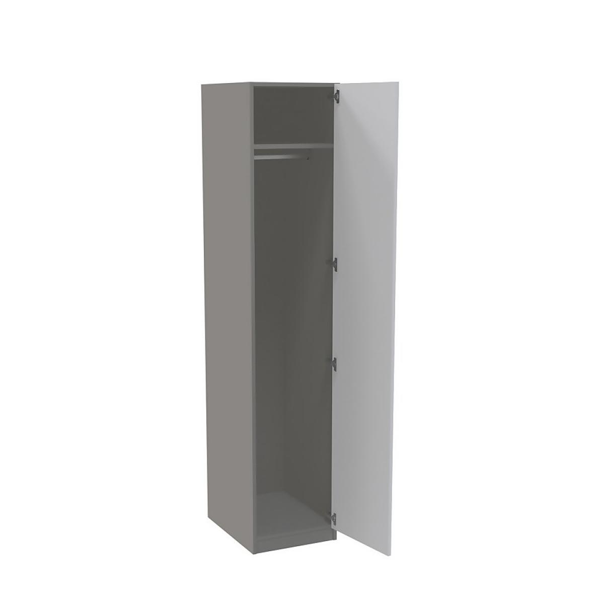 The House Beautiful range is exclusive to Homebase and offers a selection of different finishes and storage configurations to suit your needs. With a range of carcass colours and contrasting door designs, you can select the look to fit your bedroom aesthetic. This single wardrobe features a grey carcass and a beautiful gloss white slab door for a modern sleek look. The wardrobe features premium soft close Blum hinges, a shelf and a hanging rail. You can customise your wardrobe with our additional