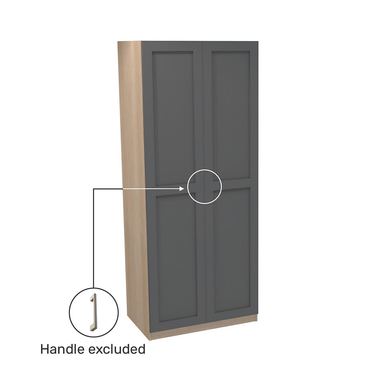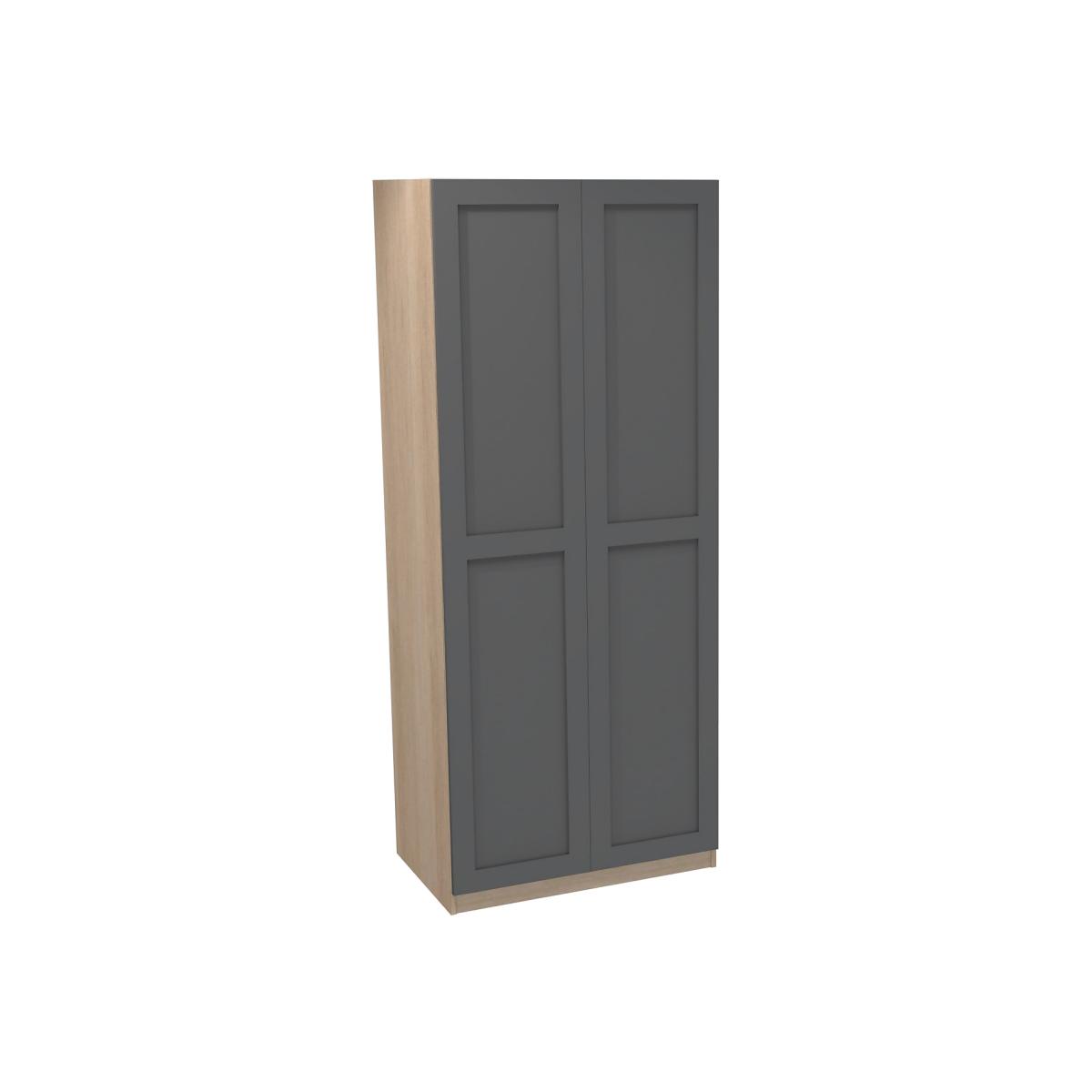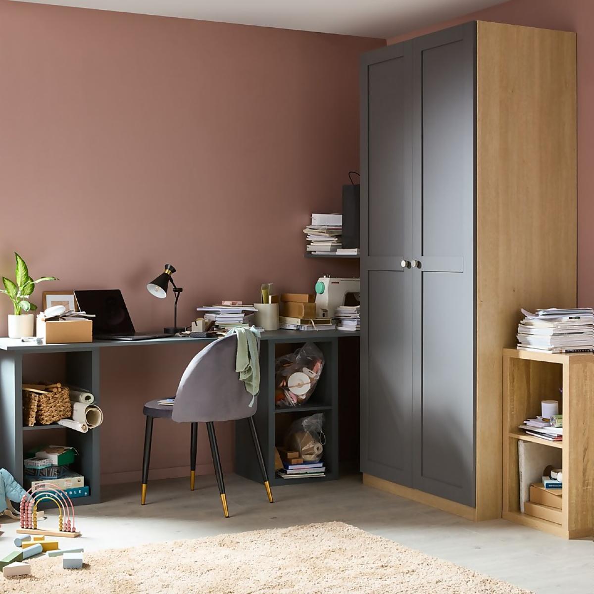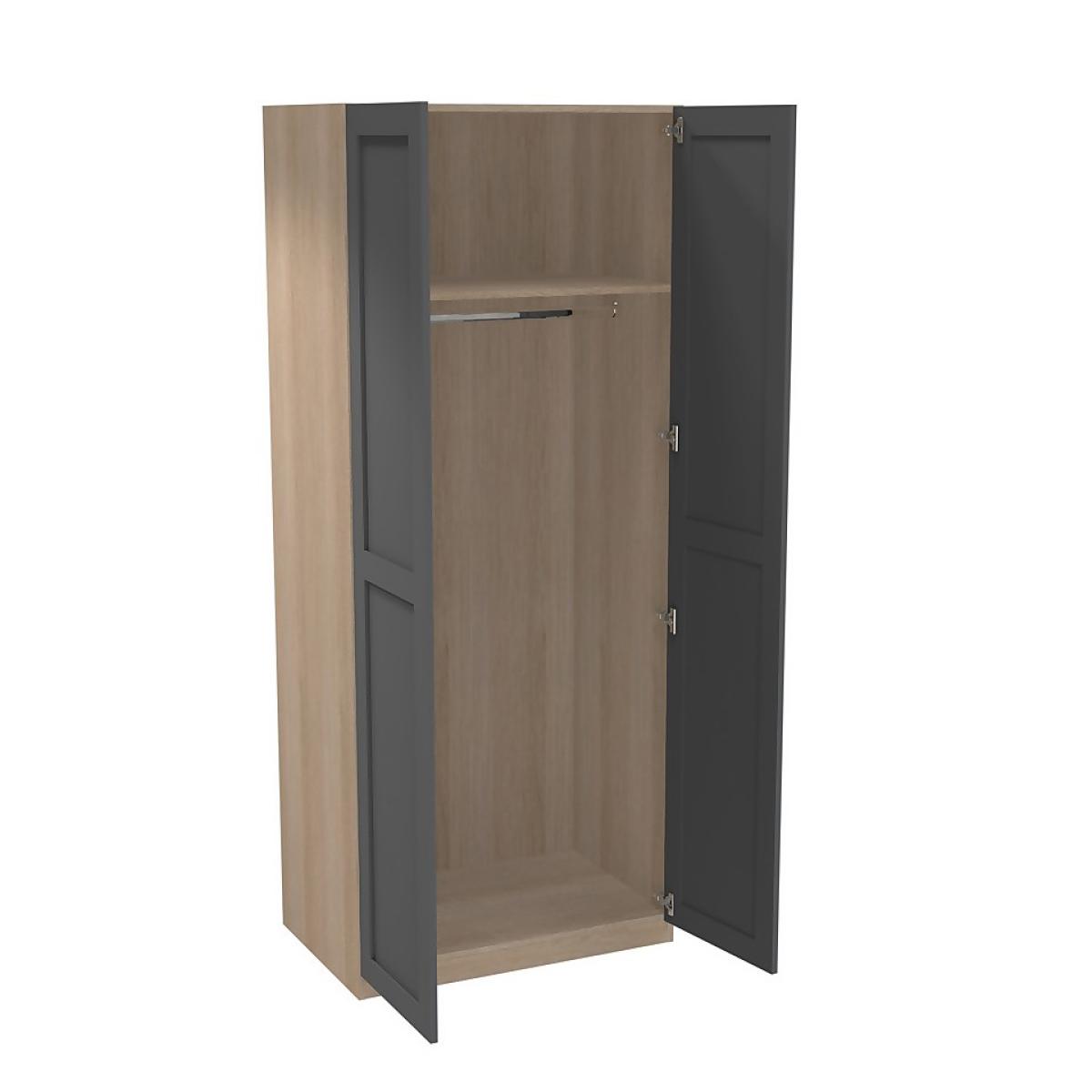 The House Beautiful range is exclusive to Homebase and offers a selection of different finishes and storage configurations to suit your needs. With a range of carcass colours and contrasting door designs, you can select the look to fit your bedroom aesthetic. This double wardrobe features an oak effect carcass and beautiful shaker doors finished in a luxurious matt carbon grey. The wardrobe features premium soft close Blum hinges, a shelf and a hanging rail. You can customise your wardrobe with our additional