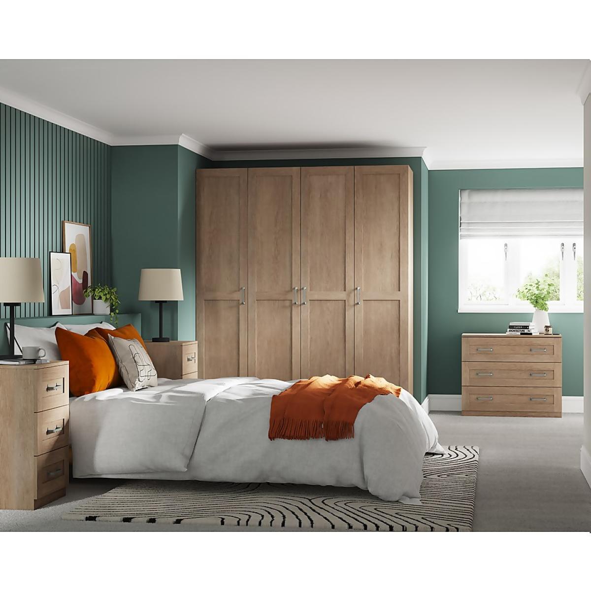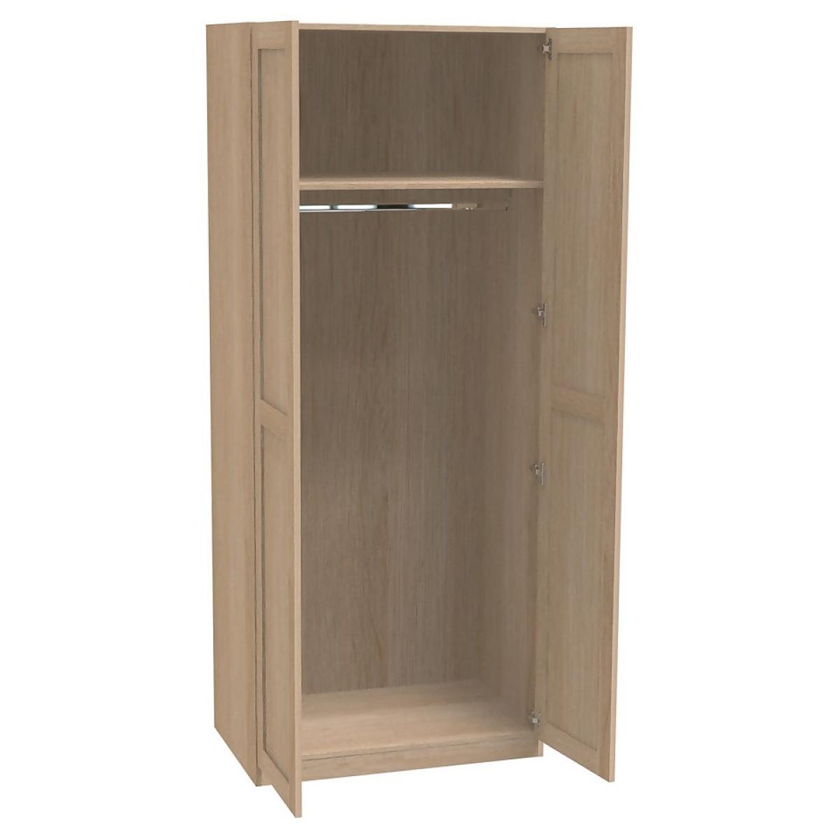 The House Beautiful range is exclusive to Homebase and offers a selection of different finishes and storage configurations to suit your needs. With a range of carcass colours and contrasting door designs, you can select the look to fit your bedroom aesthetic. This double wardrobe features an oak effect carcass and beautiful matching shaker doors. The wardrobe features premium soft close Blum hinges, a shelf and a hanging rail. You can customise your wardrobe with our additional