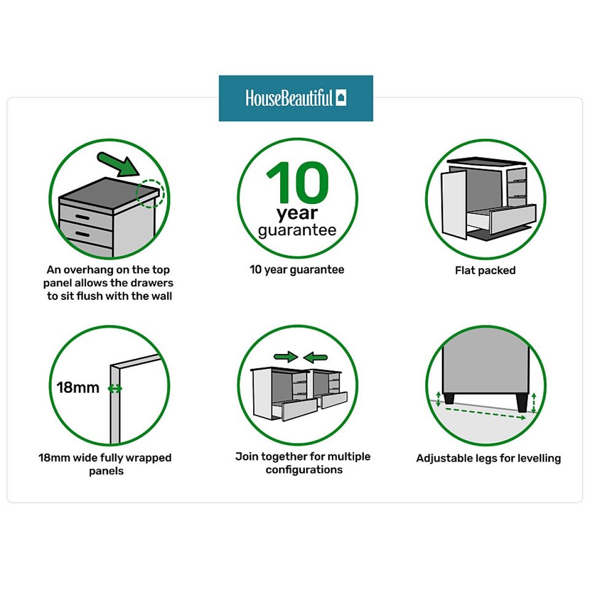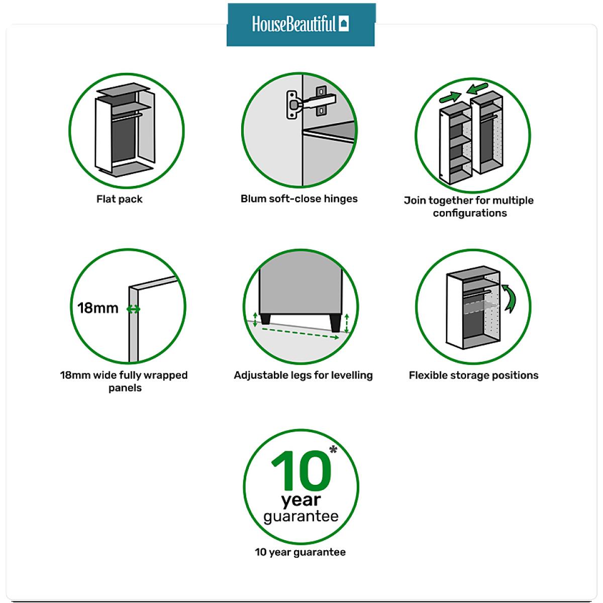 The House Beautiful bedroom range is exclusive to Homebase and offers a selection of different finishes and storage configurations to suit your needs. With a range of carcass colours and contrasting door designs, you can select the look to fit your bedroom aesthetic.