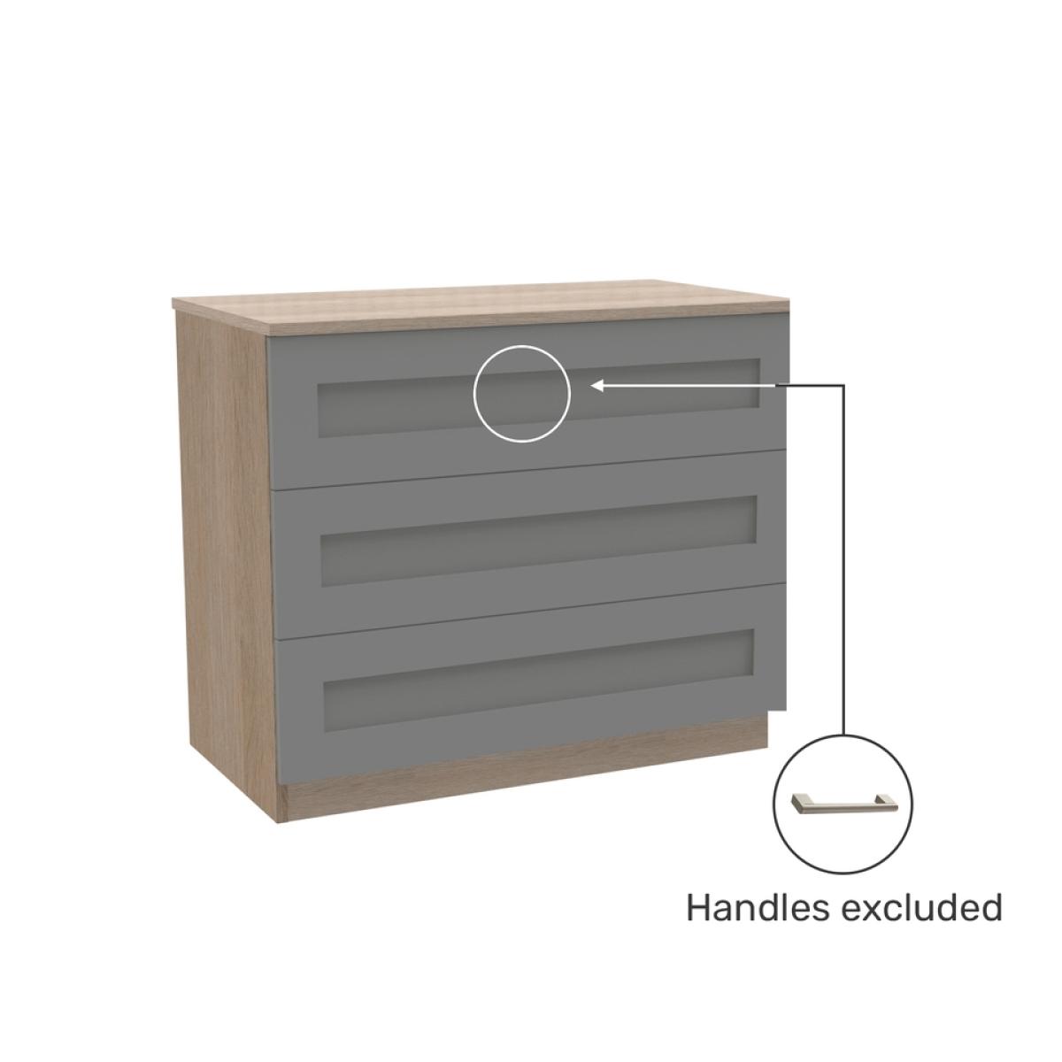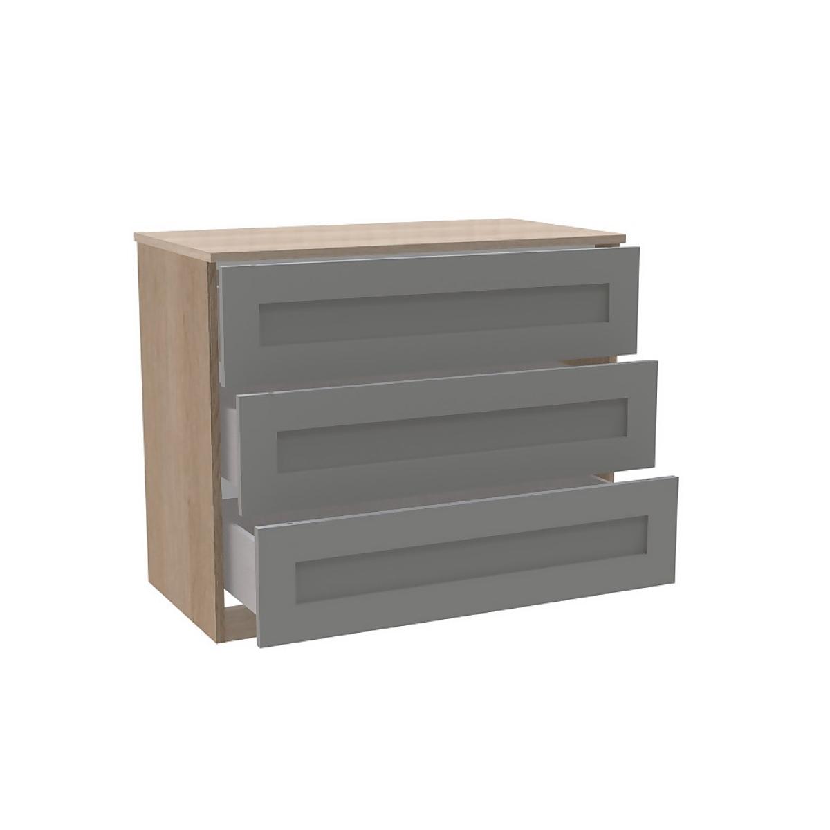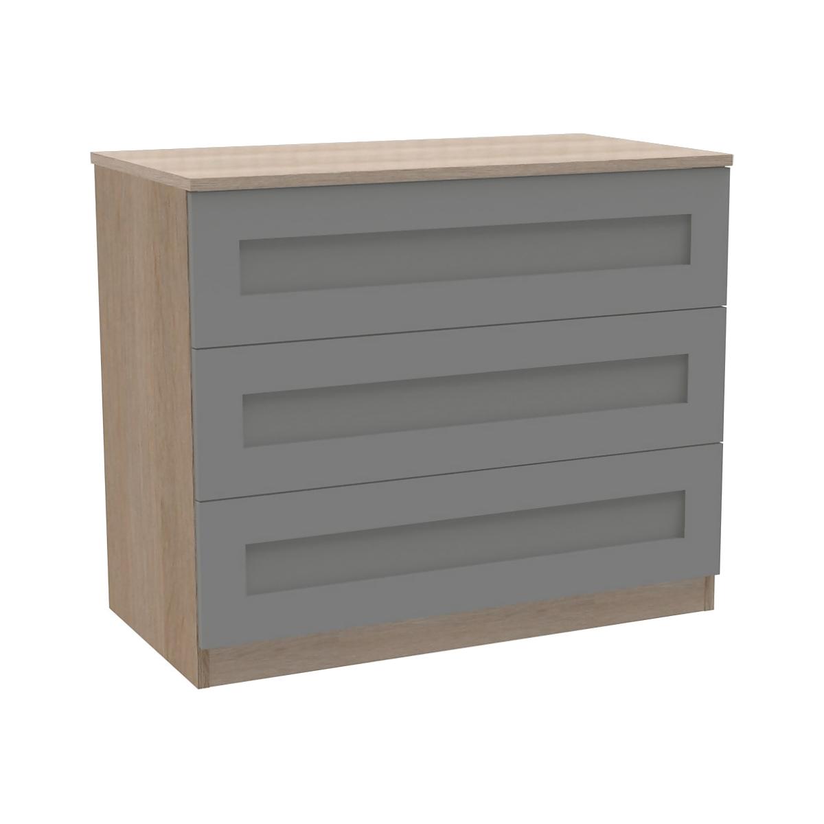 The House Beautiful bedroom range available exclusively at Homebase is full of great ideas and designs for your home. This three drawer chest has been finished with luxurious grey shaker drawer fronts on an oak effect cabinet featuring fully wrapped panels, soft-close clip-on Blum runners and an internal drawer box finished in a textured linen effect.