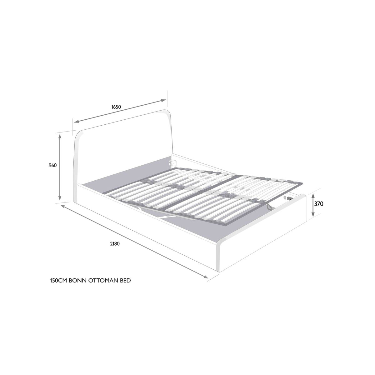 Our Bonn ottoman bed frame is simple, sturdy and brilliant for smaller bedrooms. It has a comfortable, wide headboard and sprung slats provide a supportive base for your mattress. There's plenty of storage space in the base for spare clothes and linens and we've added a handle and hydraulic arms to faciliate an easy manual lift-up. The gently curved frame will bring a softer focus to your bedroom and it's upholstered in our Saga fabric which is exceptionally durable. Plus, the frame can support a total weight of 279kg when supporting a mattress and two people. Built with Smart Slats This bed frame is designed with wider slats at the shoulders, lumbar and feet. They provide maximum support for you and your mattress so that you experience perfect spinal alignment while you sleep. The standard slat caps are black so we have added grey slat caps to ensure that you know where to place the wider slats. Want to see it first? You may want to see and get a feel for the furniture in one of our shops before ordering. We'll be able to tell you where the range you'd like to view is on display. With great prices and great design, our new brand offers style and quality for modern living today. Whatever you need, there’s joy to be found in.