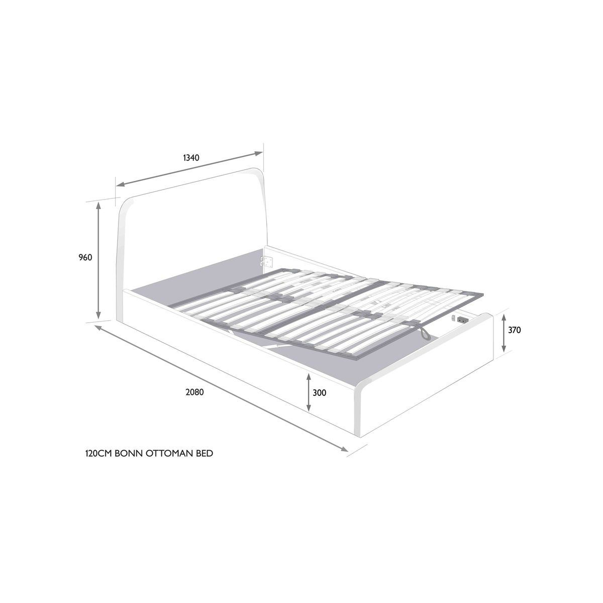Our Bonn ottoman bed frame is simple, sturdy and brilliant for smaller bedrooms. It has a comfortable, wide headboard and sprung slats provide a supportive base for your mattress. There's plenty of storage space in the base for spare clothes and linens and we've added a handle and hydraulic arms to faciliate an easy manual lift-up. The gently curved frame will bring a softer focus to your bedroom and it's upholstered in our Saga fabric which is exceptionally durable. Plus, the frame can support a total weight of 279kg when supporting a mattress and two people. Built with Smart Slats This bed frame is designed with wider slats at the shoulders, lumbar and feet. They provide maximum support for you and your mattress so that you experience perfect spinal alignment while you sleep. The standard slat caps are black so we have added grey slat caps to ensure that you know where to place the wider slats. Want to see it first? You may want to see and get a feel for the furniture in one of our shops before ordering. We'll be able to tell you where the range you'd like to view is on display. With great prices and great design, our new brand offers style and quality for modern living today. Whatever you need, there's joy to be found in ANYDAY.