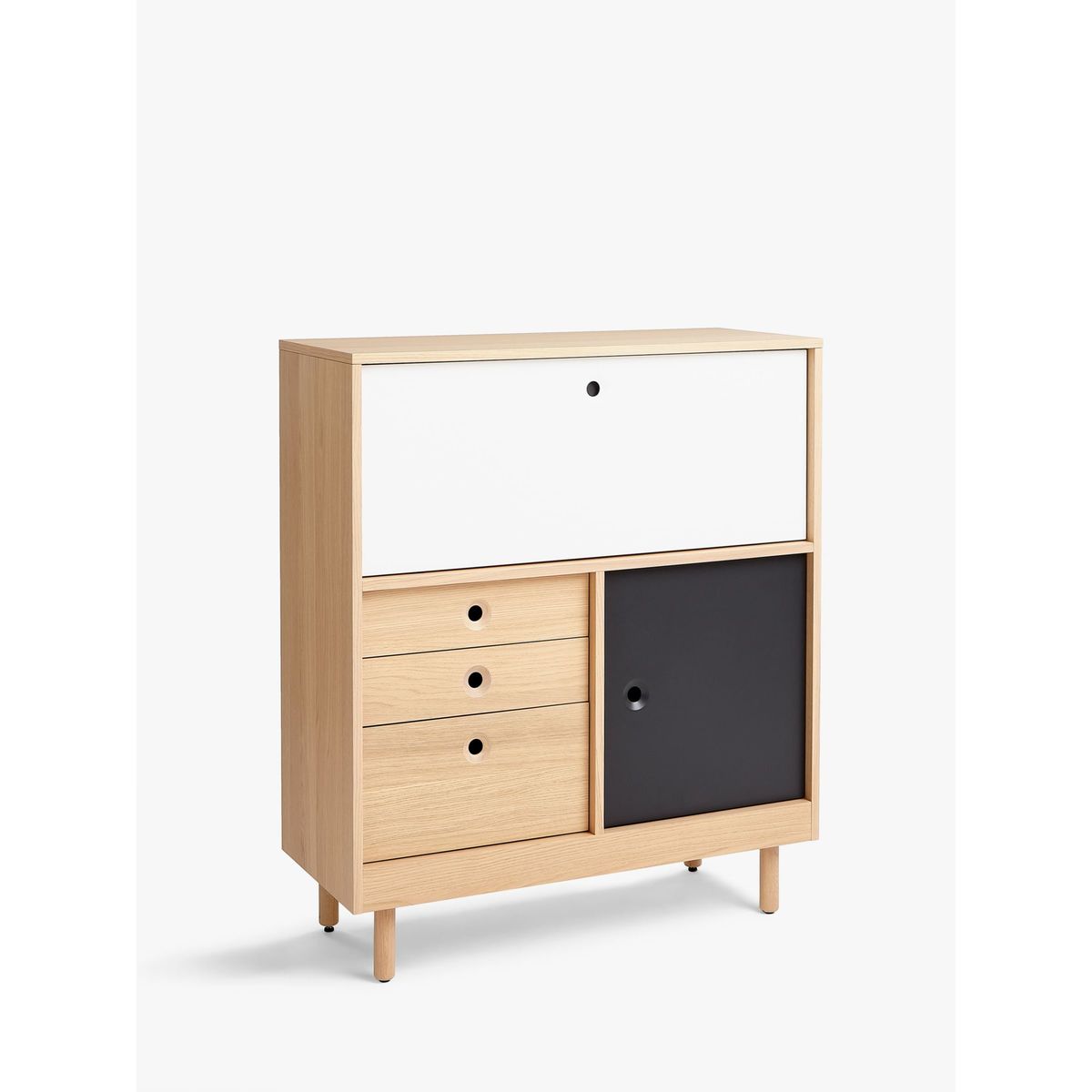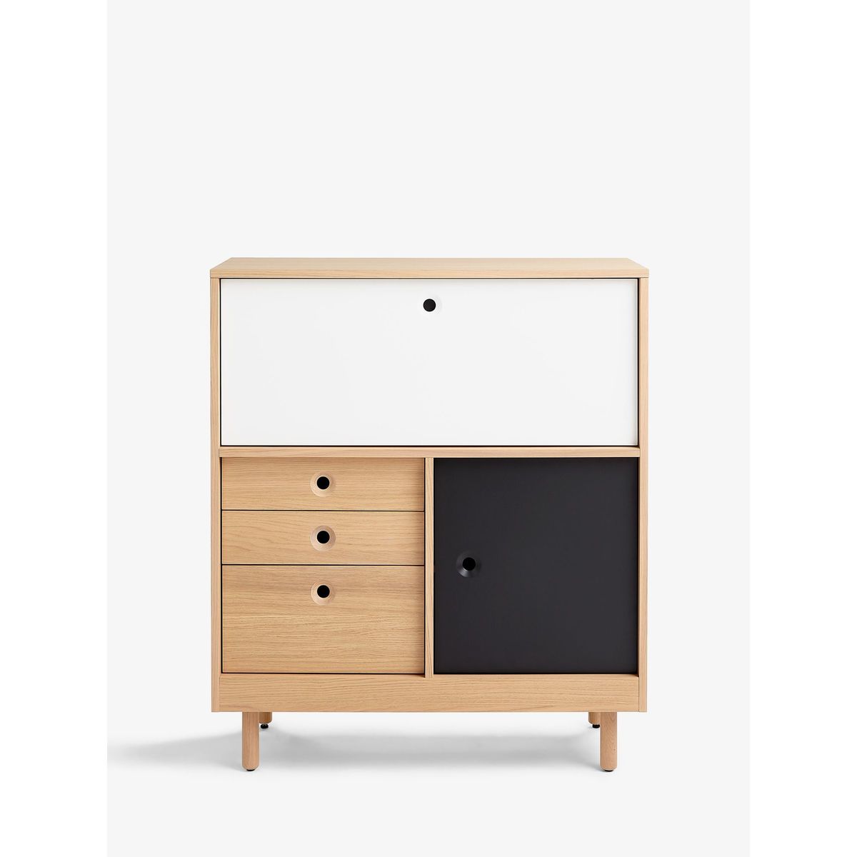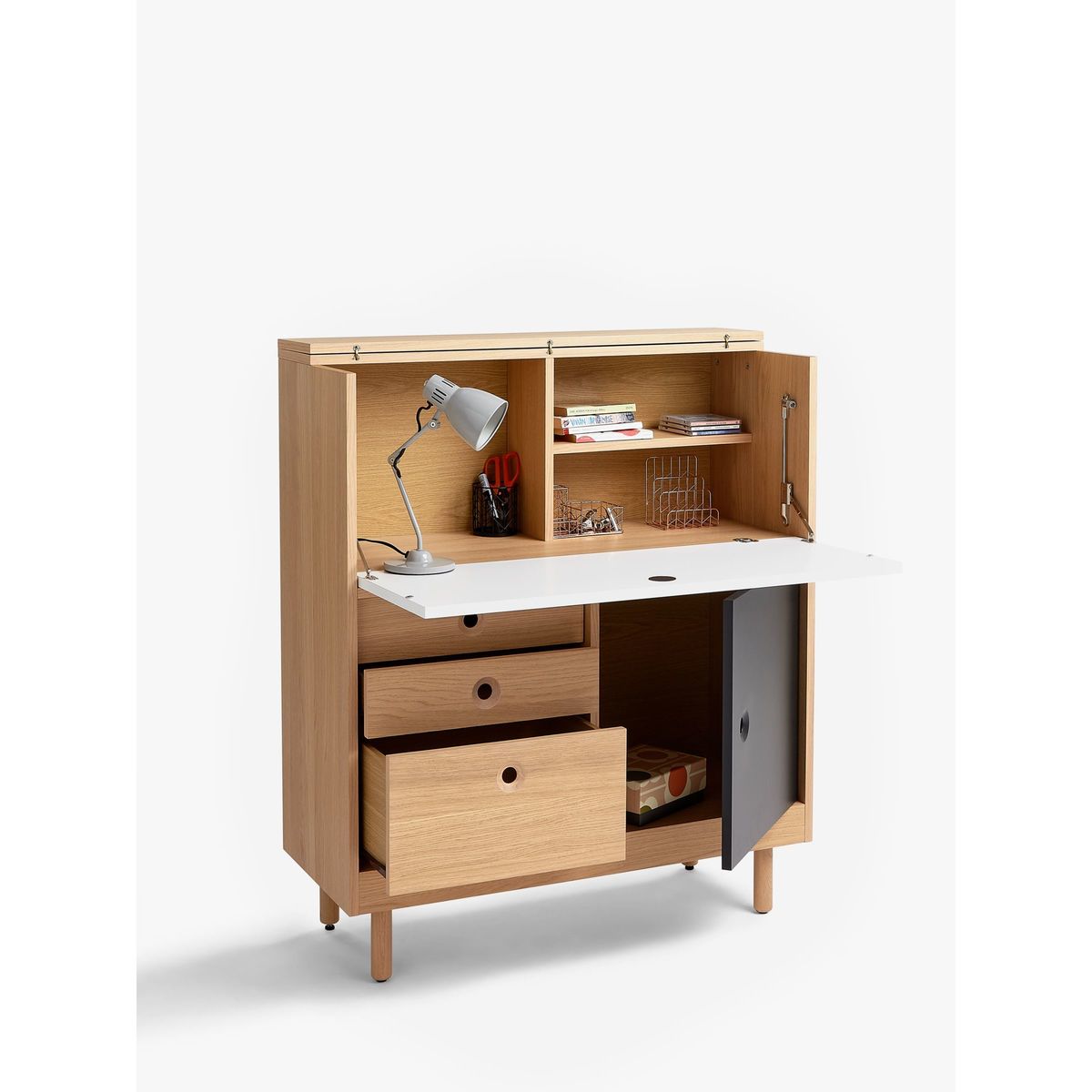 Part of the House by John Lewis Cube range, this contemporary bureau offers storage and style. Its neat and practical profile houses 3 drawers, a cupboard and a top cabinet section that opens with a flap door to reveal organised interior shelving. Finished in a natural lacquer, its modern design is highlighted thanks to black and white painted doors. Supported by sturdy round wooden legs, this piece is ideal for your study or home office. Maximum loads. Top panel: 60kg. Drawers: 15kg. Top cabinet section: 20kg.