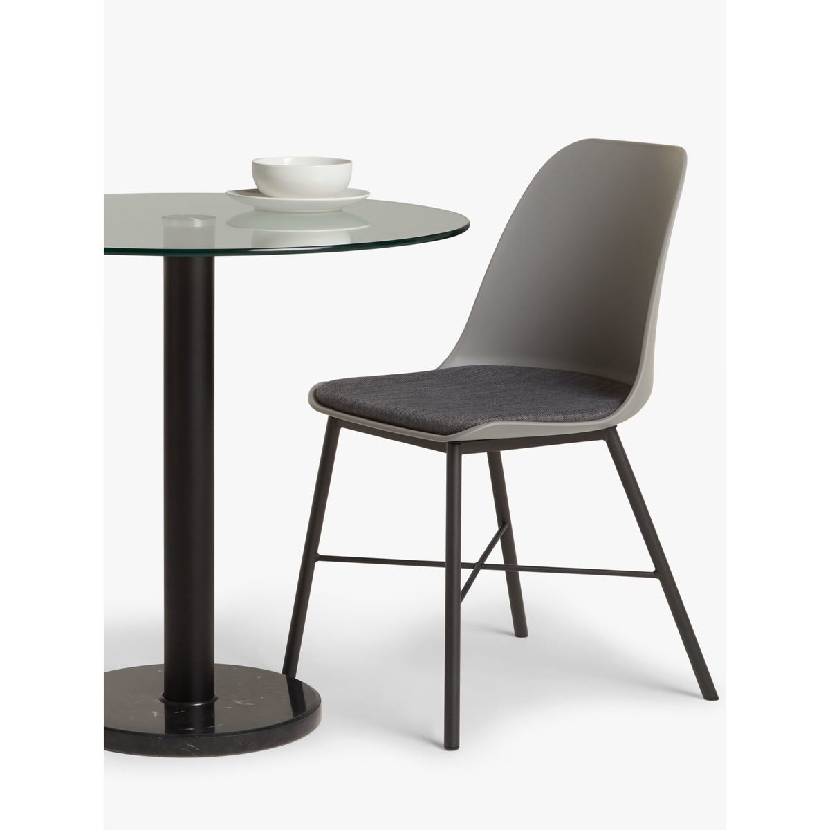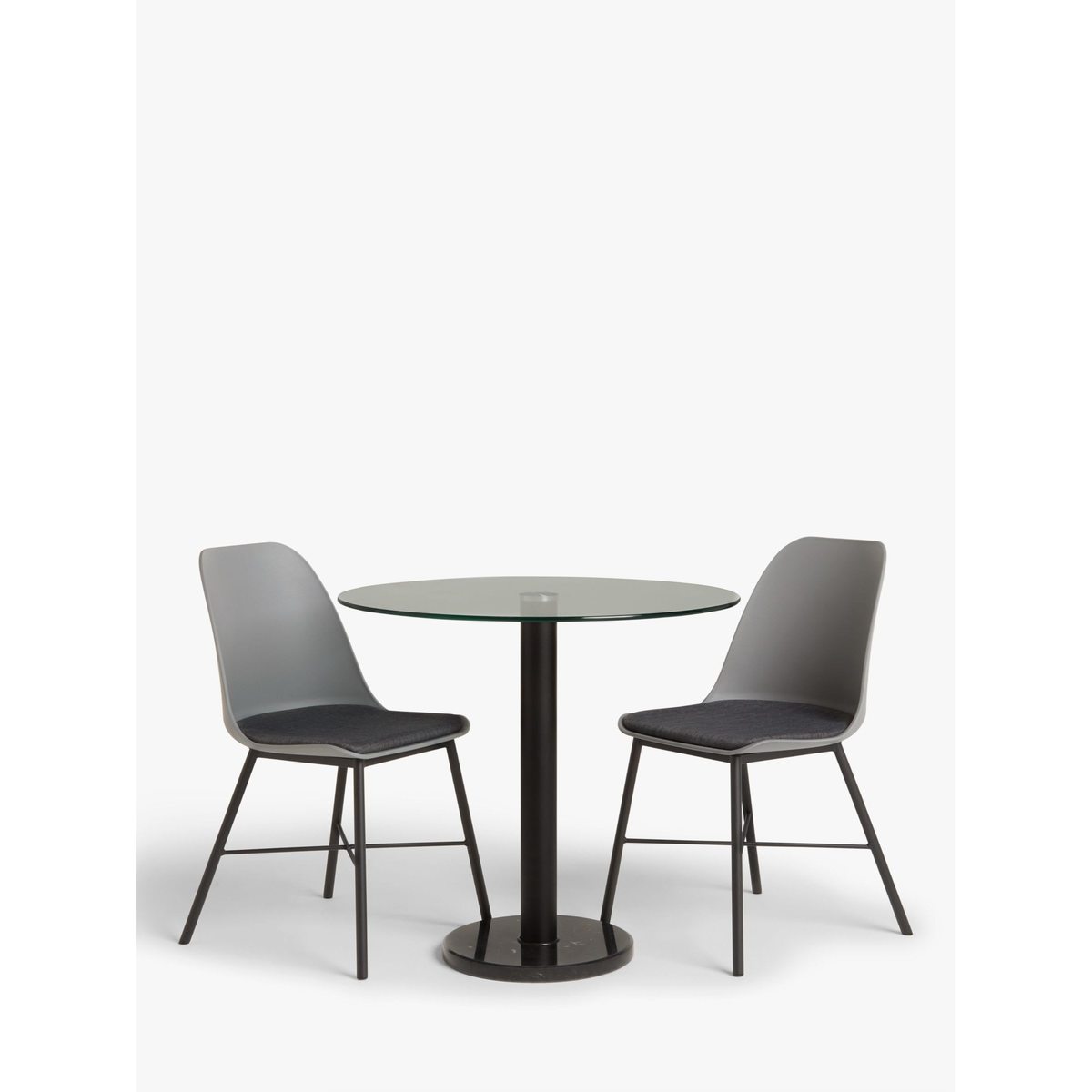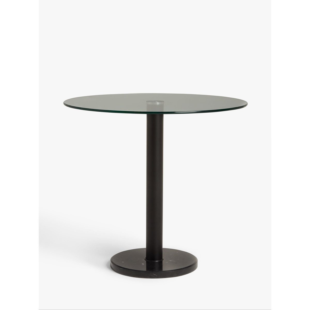 Create a sophisticated dining setting, even if you're restricted with space. Two people can sit comfortably at this round dining table, which we've made from a combination of high-quality materials. While minimalist in style, the pedestal frame is reassuringly sturdy thanks to a metal stem and thick, black marble base. The surface top is made from clear tempered glass which is easy to wipe and keep clean. We like how each table base will have a unique look, as marble is a natural material with subtle variations. Want to see it first? You may want to see and get a feel for the furniture in one of our shops before ordering. We'll be able to tell you where the range you'd like to view is on display. With great prices and great design, our new brand offers style and quality for modern living today. Whatever you need, there’s joy to be found in.