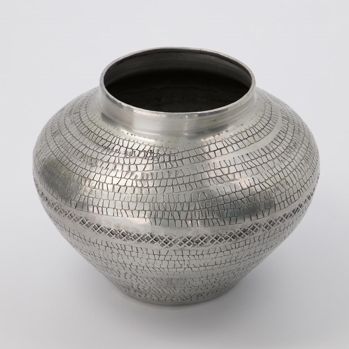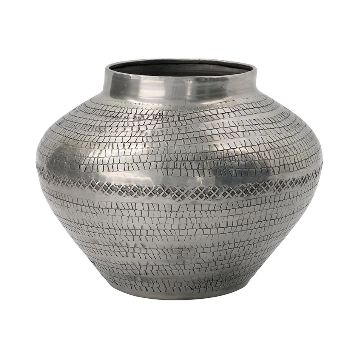 I love this vase for its versatile and contemporary appeal. Its mid-sized, rounded shape lends itself well to both minimalist and eclectic interiors, particularly in neutral or metallic palettes. The subtle textured pattern adds visual interest without overwhelming the space, making it a great statement piece on a side table, mantle, or within a centrepiece. For styling tips, consider filling it with a simple arrangement of fresh or dried stems to enhance its modern look, or leave it empty as a sculptural accent. It works particularly well in modern, Scandinavian, or industrial settings, and can be paired with other metallic or matte finishes for a cohesive look.