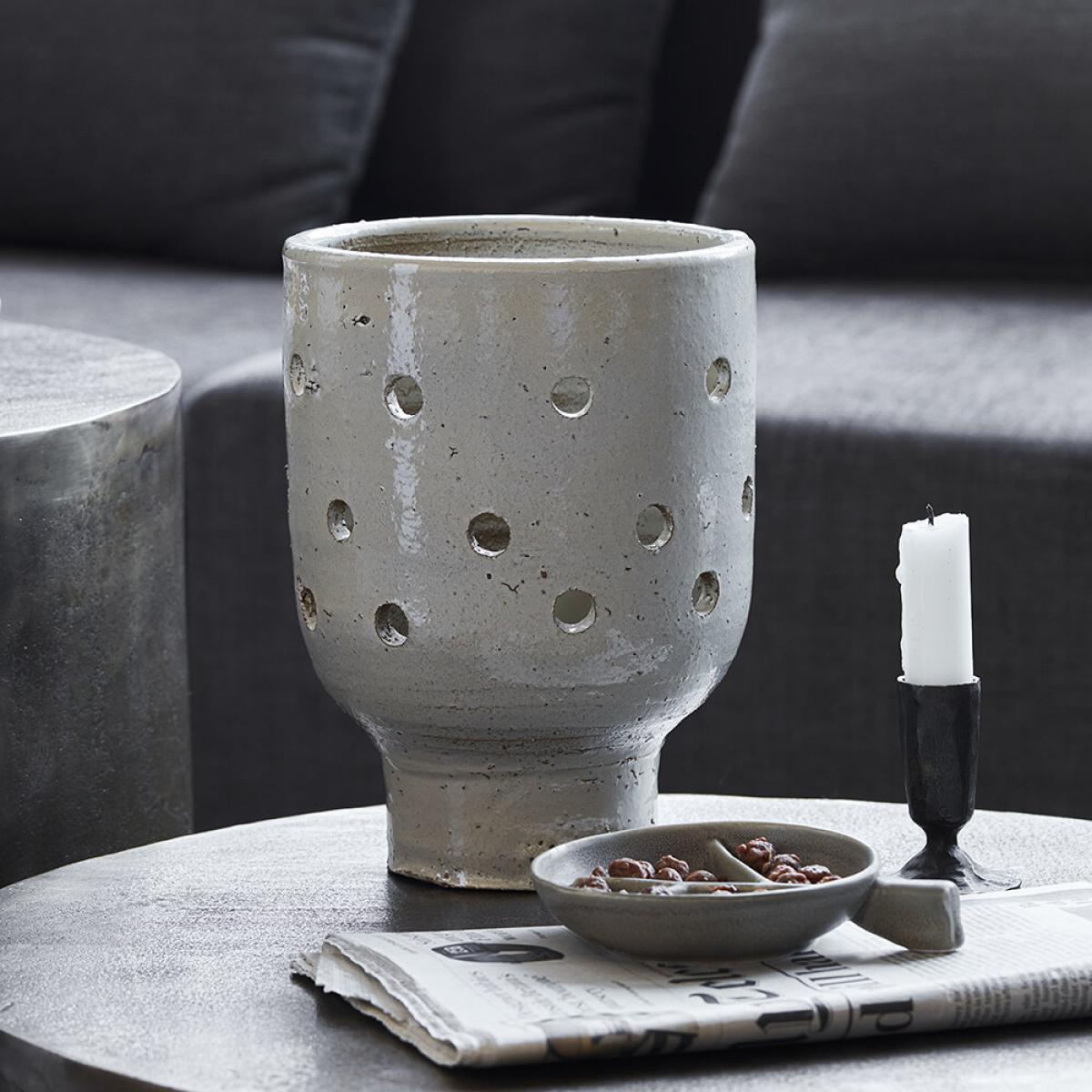 Set the scene in style with this Artist tealight holder from House Doctor. Made from stoneware, each features a soft beige tone with a rustic, imperfect glaze. Complete with a perforated design that allows the light to shine through beautifully, this stylish tealight holder will look beautiful perched on your mantlepiece.