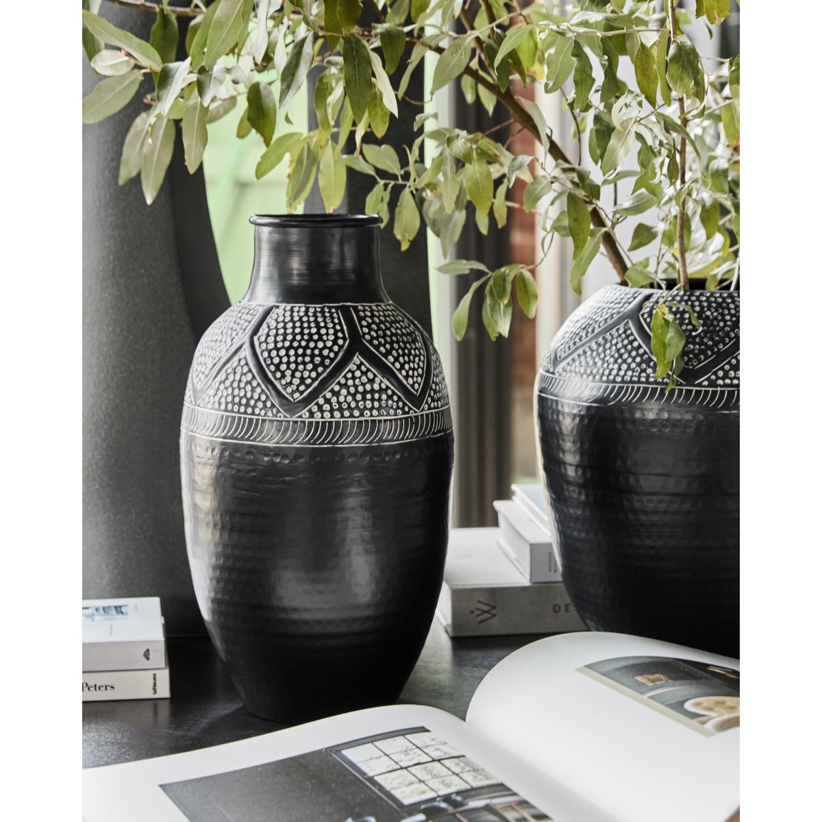I love this black vase because of its versatile, modern silhouette and detailed pattern that adds a touch of texture without overwhelming the space. It works well in both contemporary and a slightly more eclectic interior, especially when paired with natural materials like wood or greenery. For styling, I’d suggest using it with tall, minimalist stems or dried arrangements to highlight its height and design. It’s perfect as a standalone statement piece on a sideboard or console, but it can also blend seamlessly into a grouping of varied vessels for a more eclectic look. Keep the colour palette neutral or monochrome to let the design details really stand out.