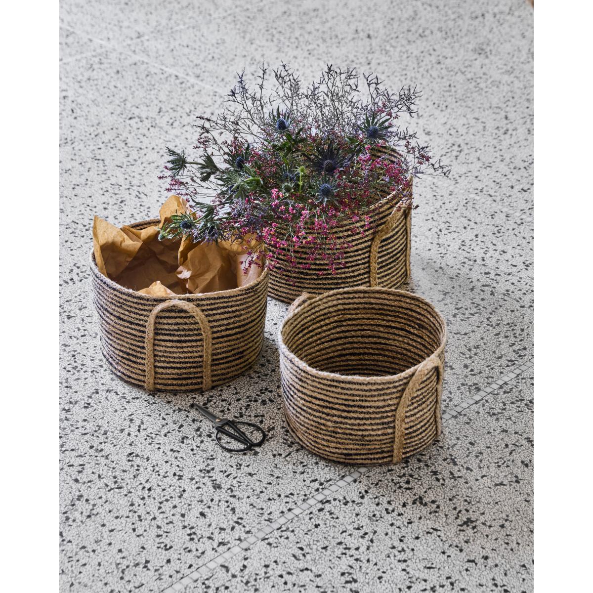 Dungi low storage baskets 3-pack from House Doctor is a set of handmade jute baskets that combine practical storage with Scandinavian charm. The jute baskets feature clean stripes and handy handles, making them perfect for small items, textiles, or as decorative accents in the home. The durable materials make them as functional as they are beautiful to display.