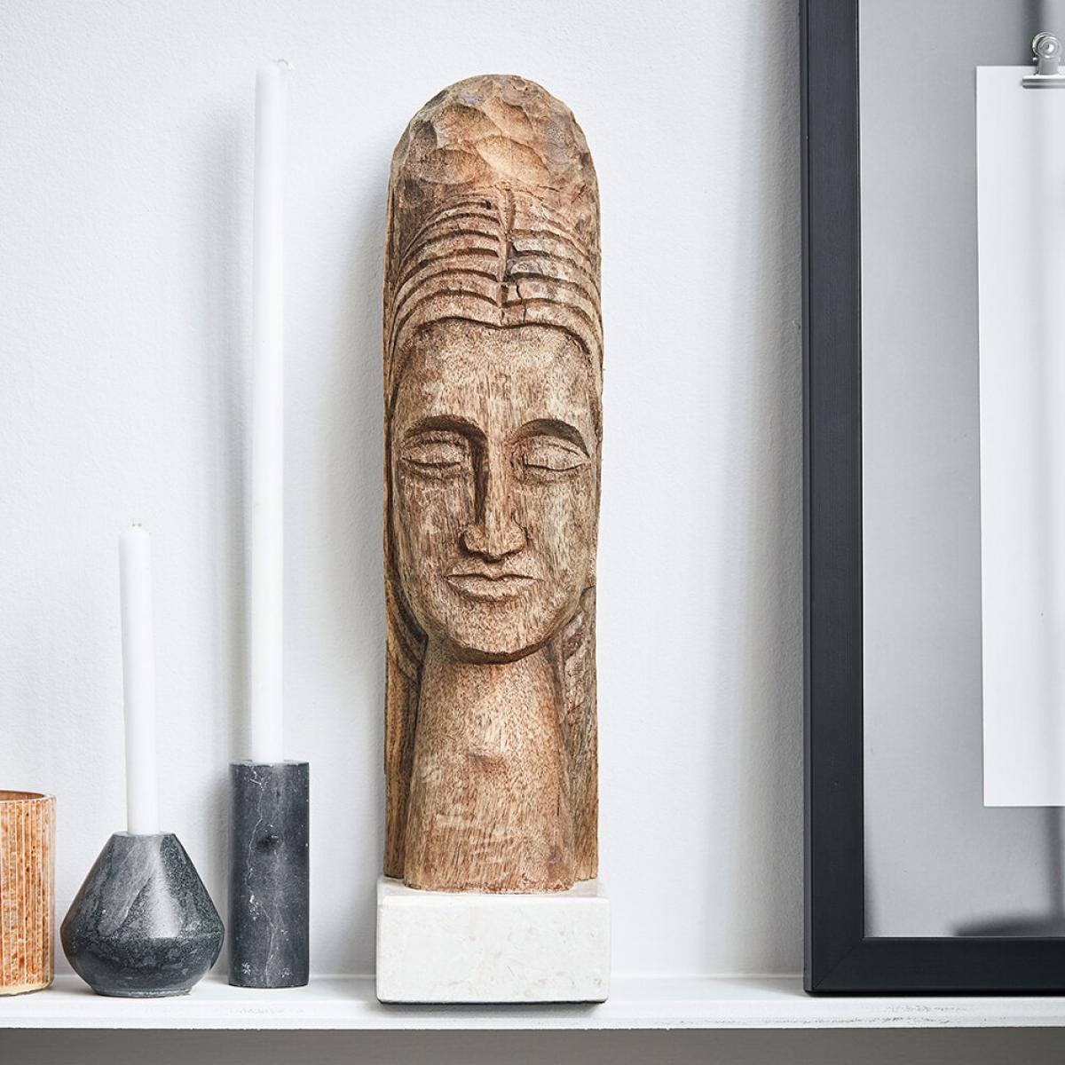 Add some character to your interior with this Mindful art piece from House Doctor. Hand-carved from mango wood with a natural, rustic finish, it sits on a smooth white marble base providing the perfect contrast. Please note, due to the handmade nature each piece is unique.