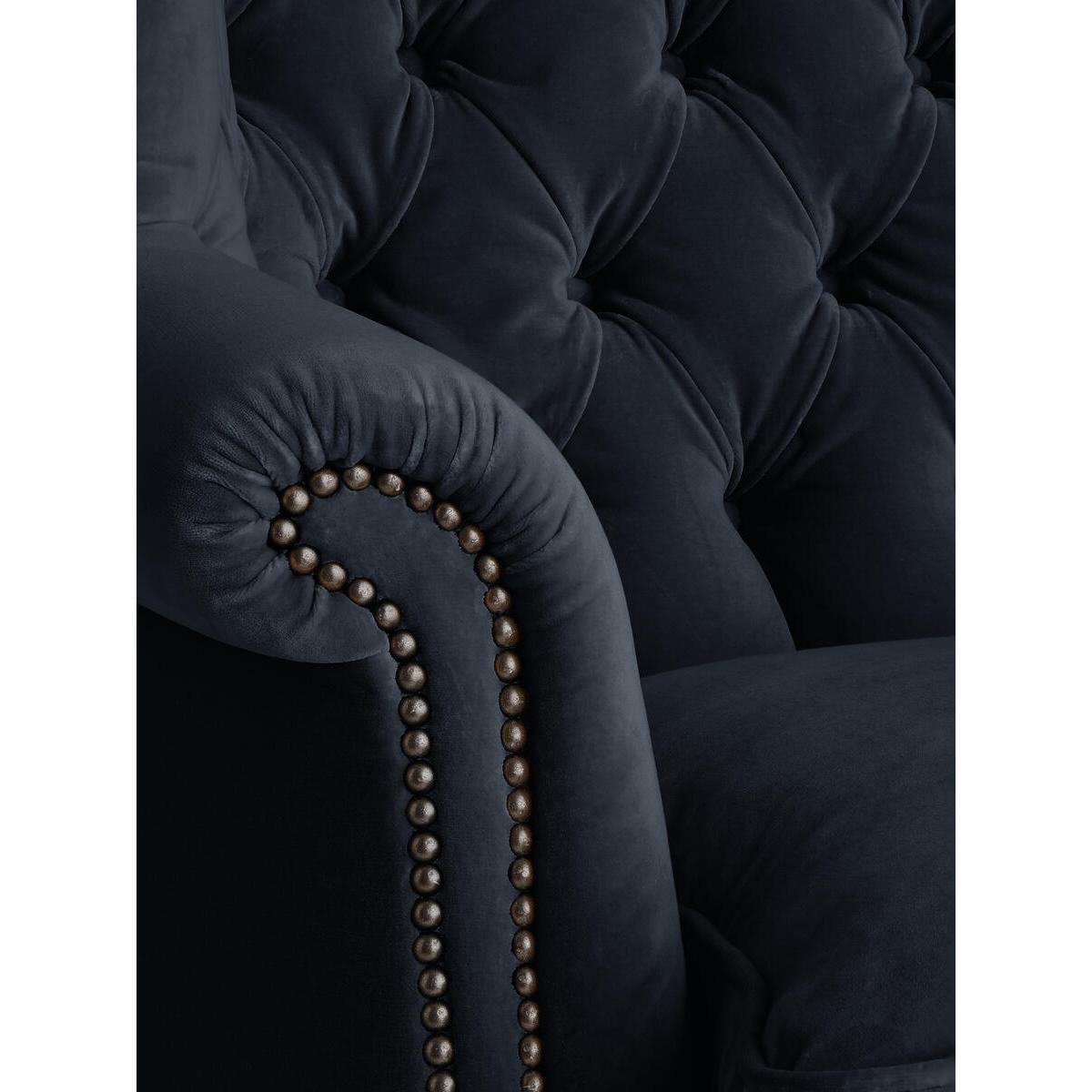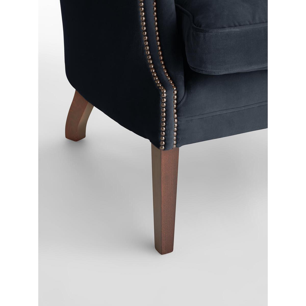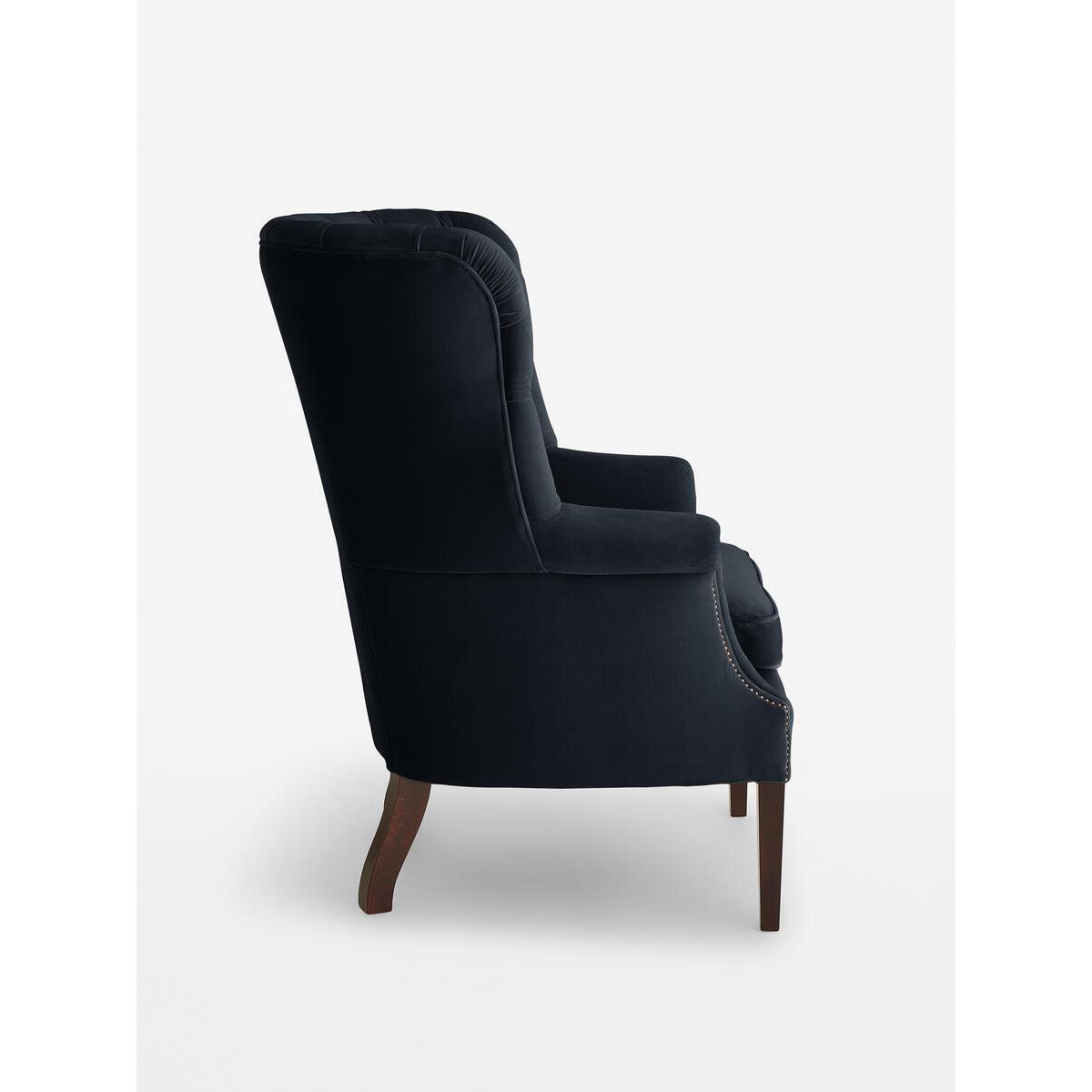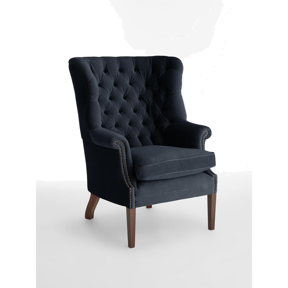 The wide side wings of our Porter chair envelop the sitter,making it ideal for when you want to be on your own or feel extracosy. Hand crafted in England and upholstered in tactile purelinen, it's inspired by traditional porter chairs seen around the Houses from Babington to Chicago and New York. Upright porter chair with velvet upholstery. Wide side wings. Deep buttoned detailing. Hand crafted in England. Dark stained timber feet. Inspired by chairs at Soho House Chicago and Babington House.
