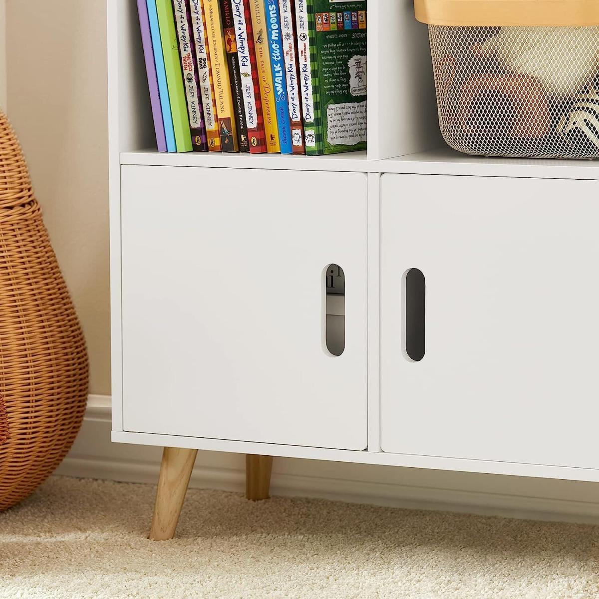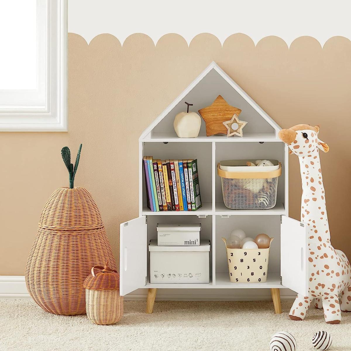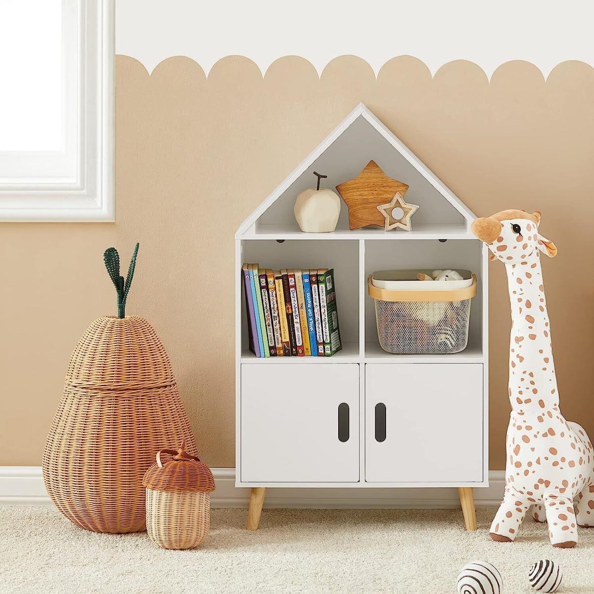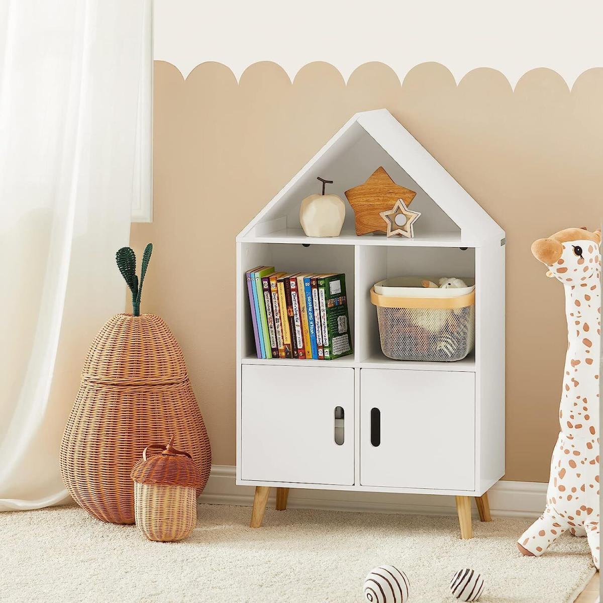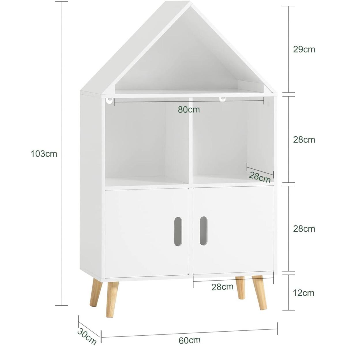 Modern design children storage shelf will blend perfectly with any decor. It will keep your room nicely organized. House shape design, attractive and contemporary way to create a good look for a children's room.3 open storage compartments and 2 doors offer ample storage space for the books and toys. The cutout handles allow your fingers to open the doors easily. Made of high quality MDF in white lacquer. The legs are made of pine wood with varnished coating. Stable and durable. Suitable for children ages 3 and up, promotes organisation and reading skills. Sturdy wood with environmental protection paint and the anti-tipping device, ensure good stability and safety, an ideal choice for daycare, classroom and children's room.