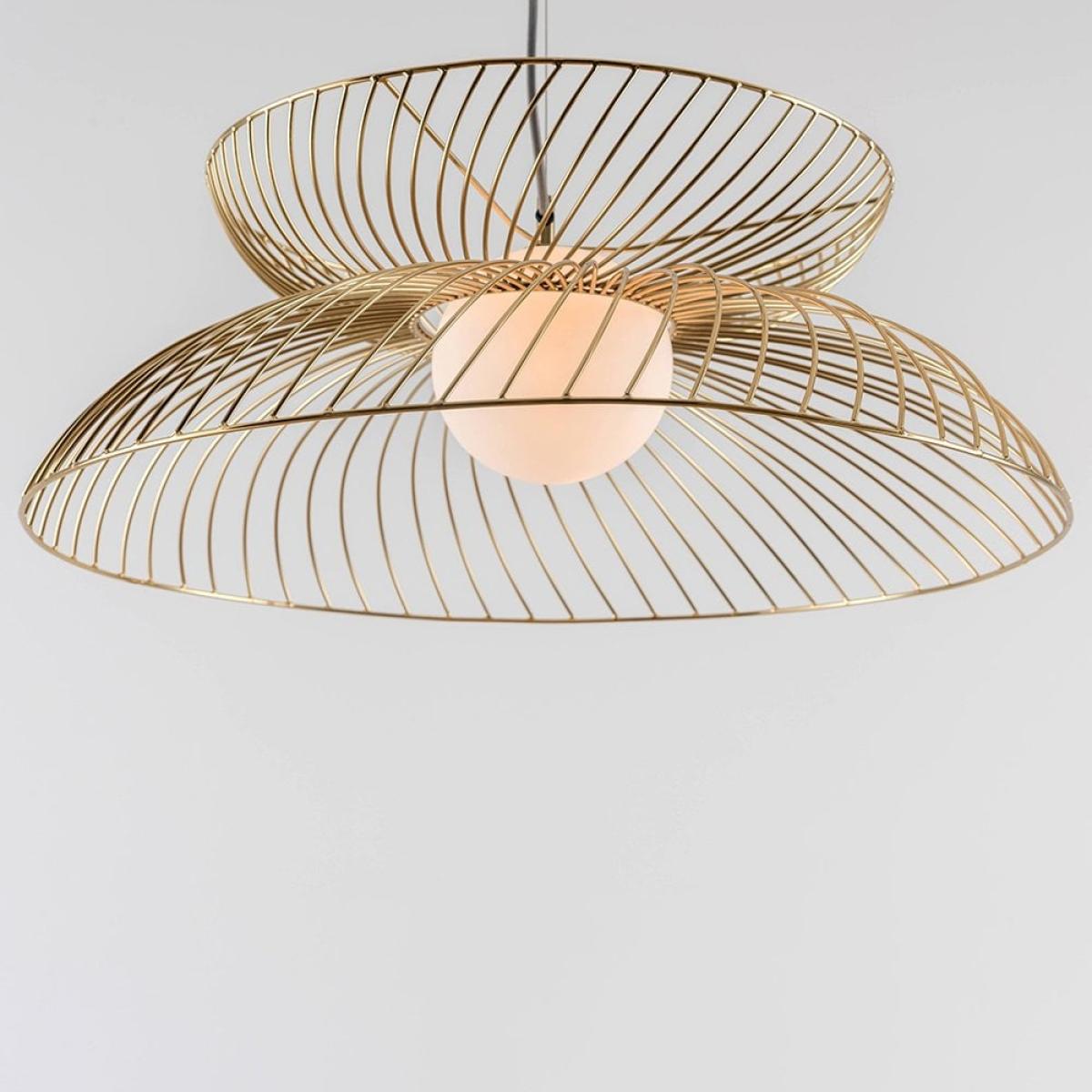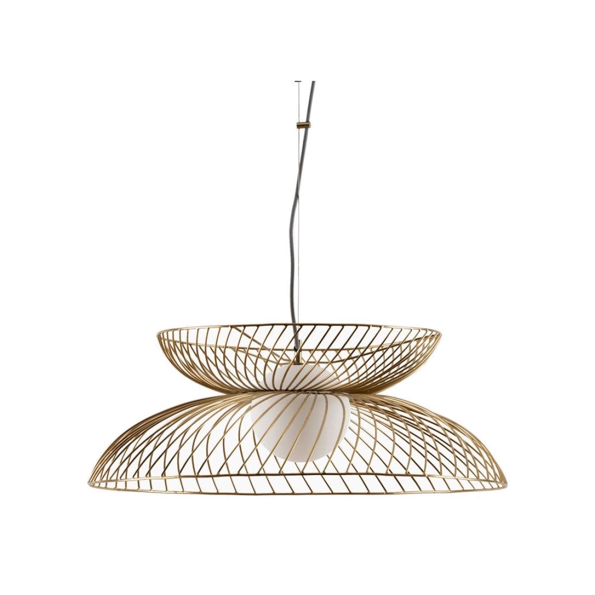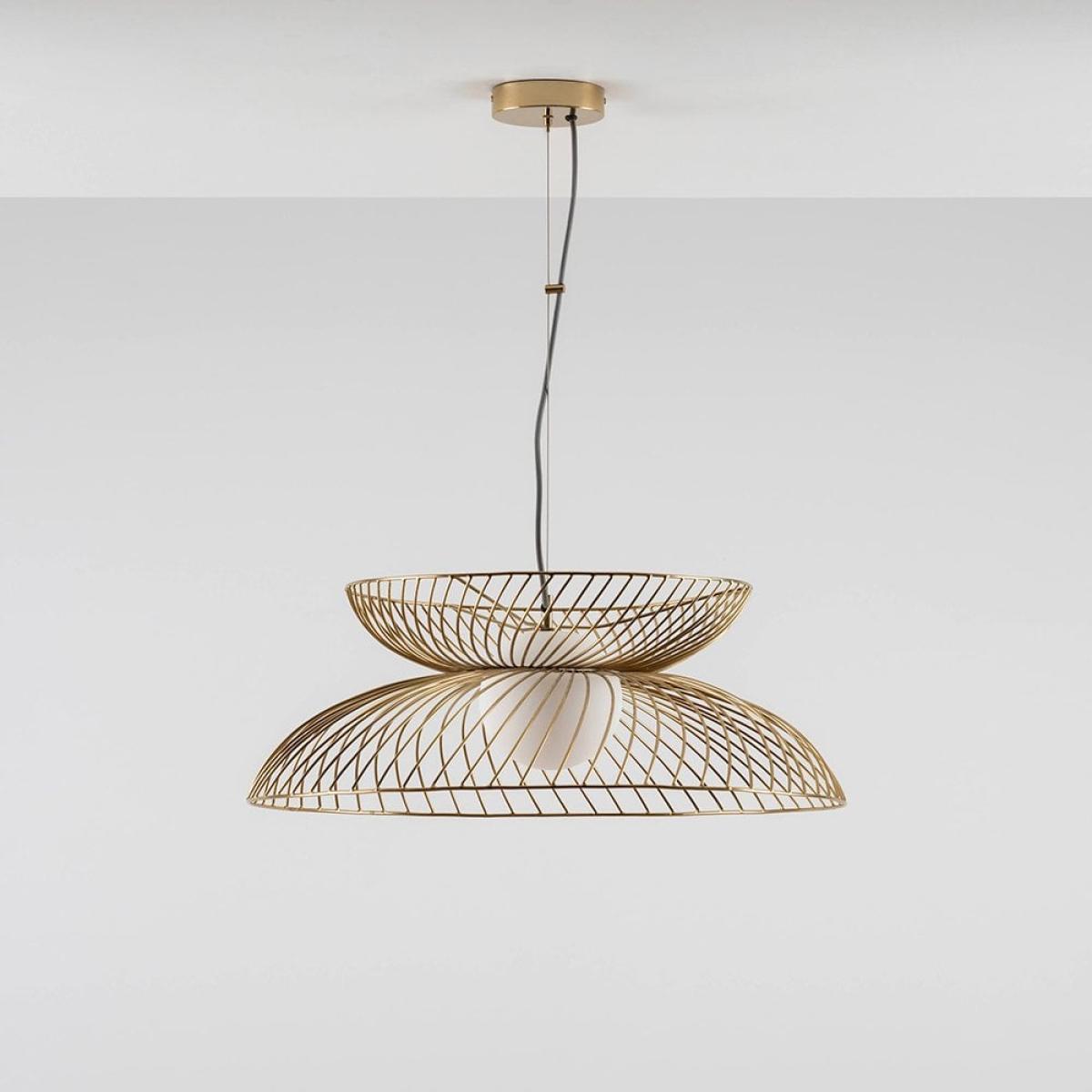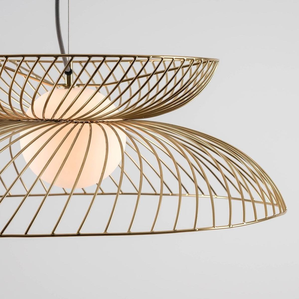 With swirled metal caging, this pendant ceiling light is the centrepiece you've been searching for, designed to command attention. The cable is adjustable, allowing you to suspend from a height of your choice for a unique and versatile addition to modern bedrooms, hallways, dining rooms, and living rooms. The stunning opal glass shade is surrounded by the metal wire cage in a brass finish; the perfect colour that highlights elegance and effortless cool. houseof is a B Corp Certified company that produces environmentally conscious lighting by minimising waste, using low-impact productions and materials, and offsetting emissions. With daring shapes, pops of colour, and affordable functional designs, Cult Furniture are proud to partner with them.