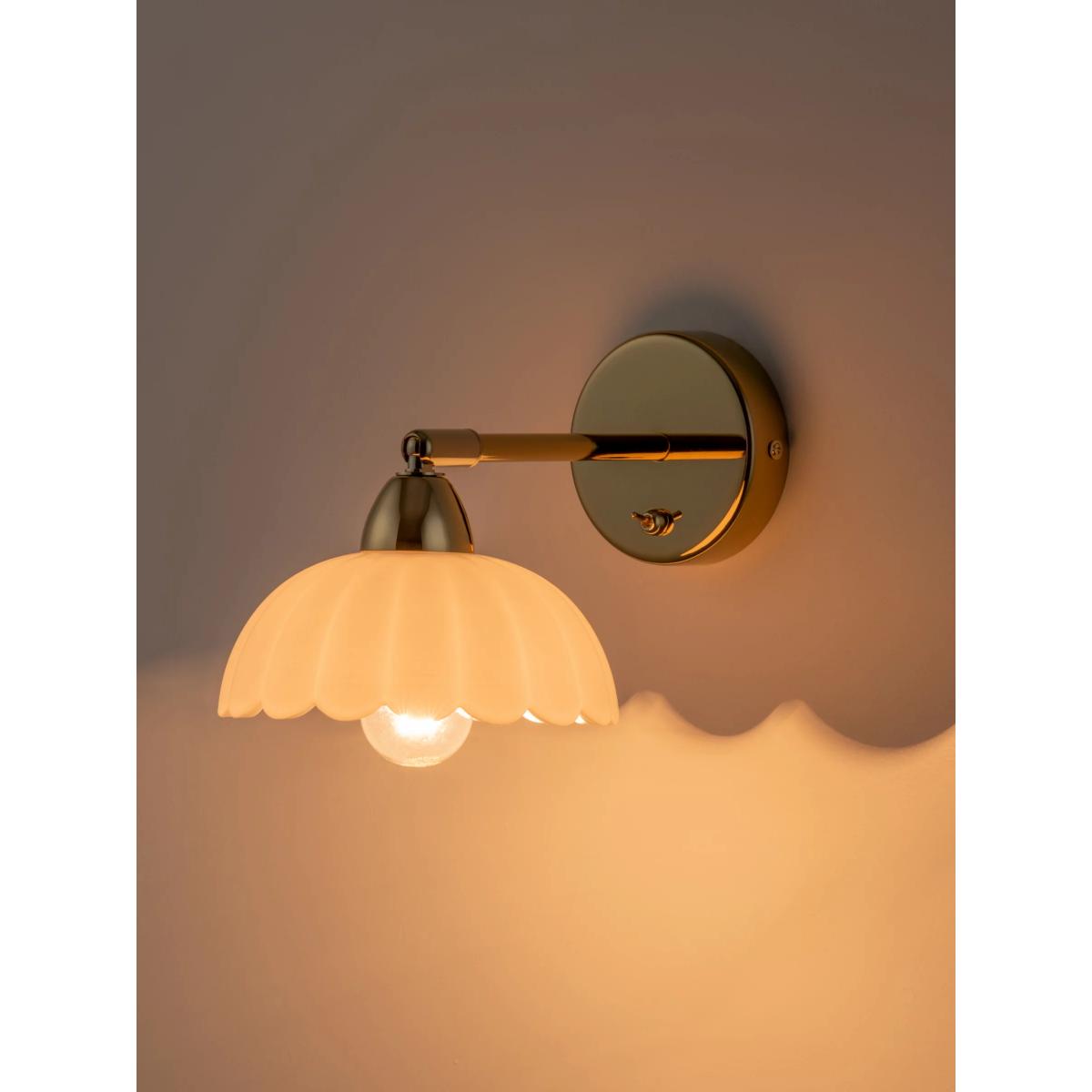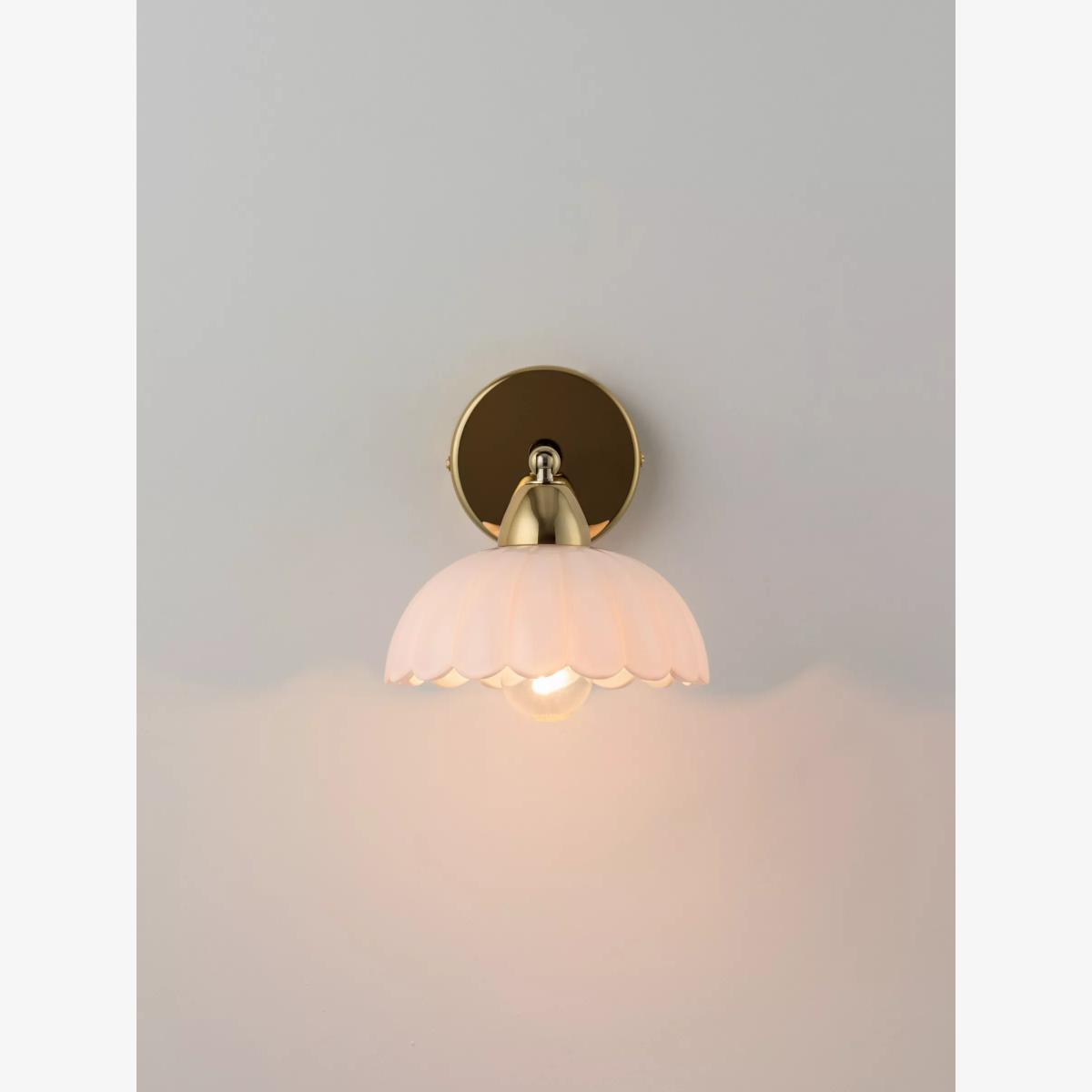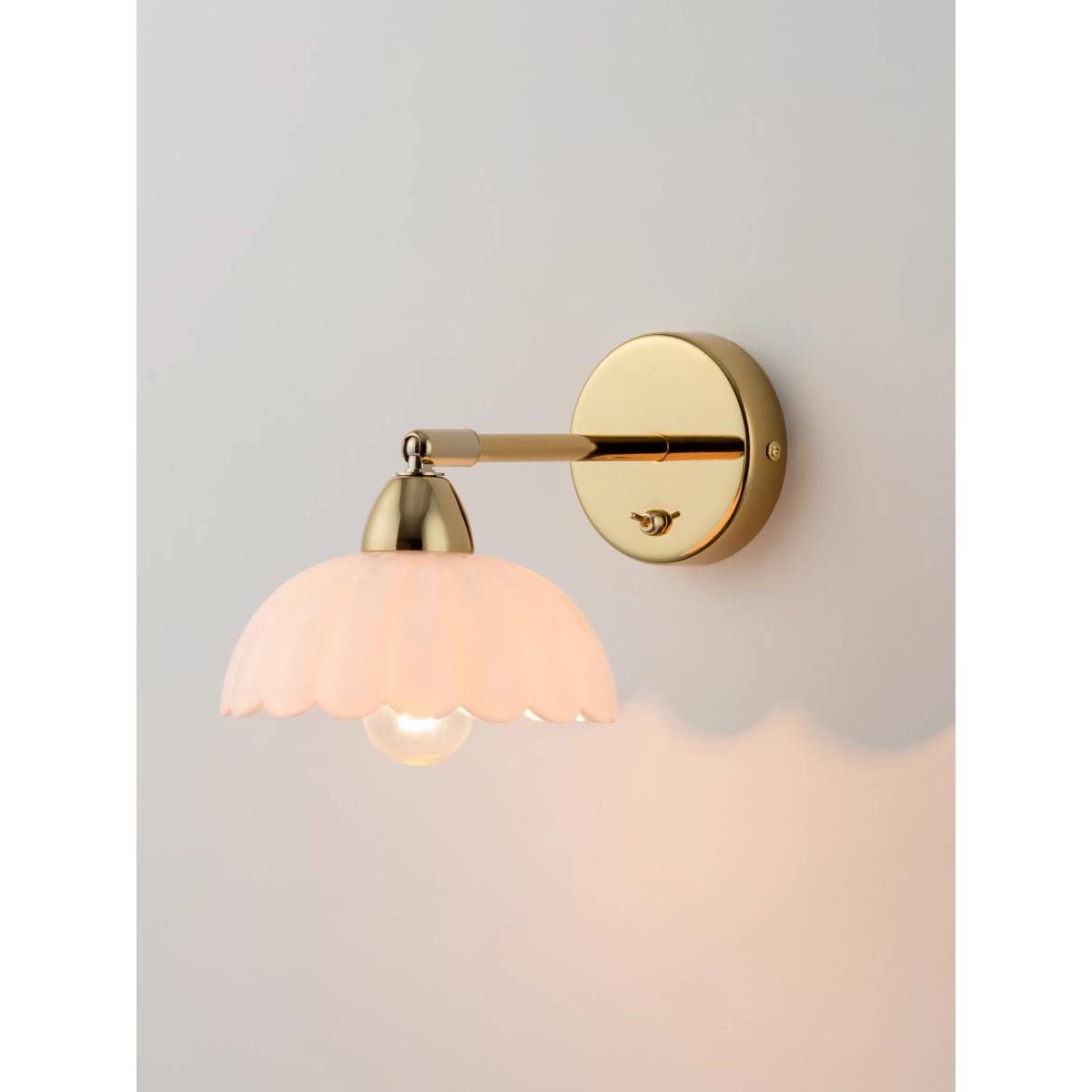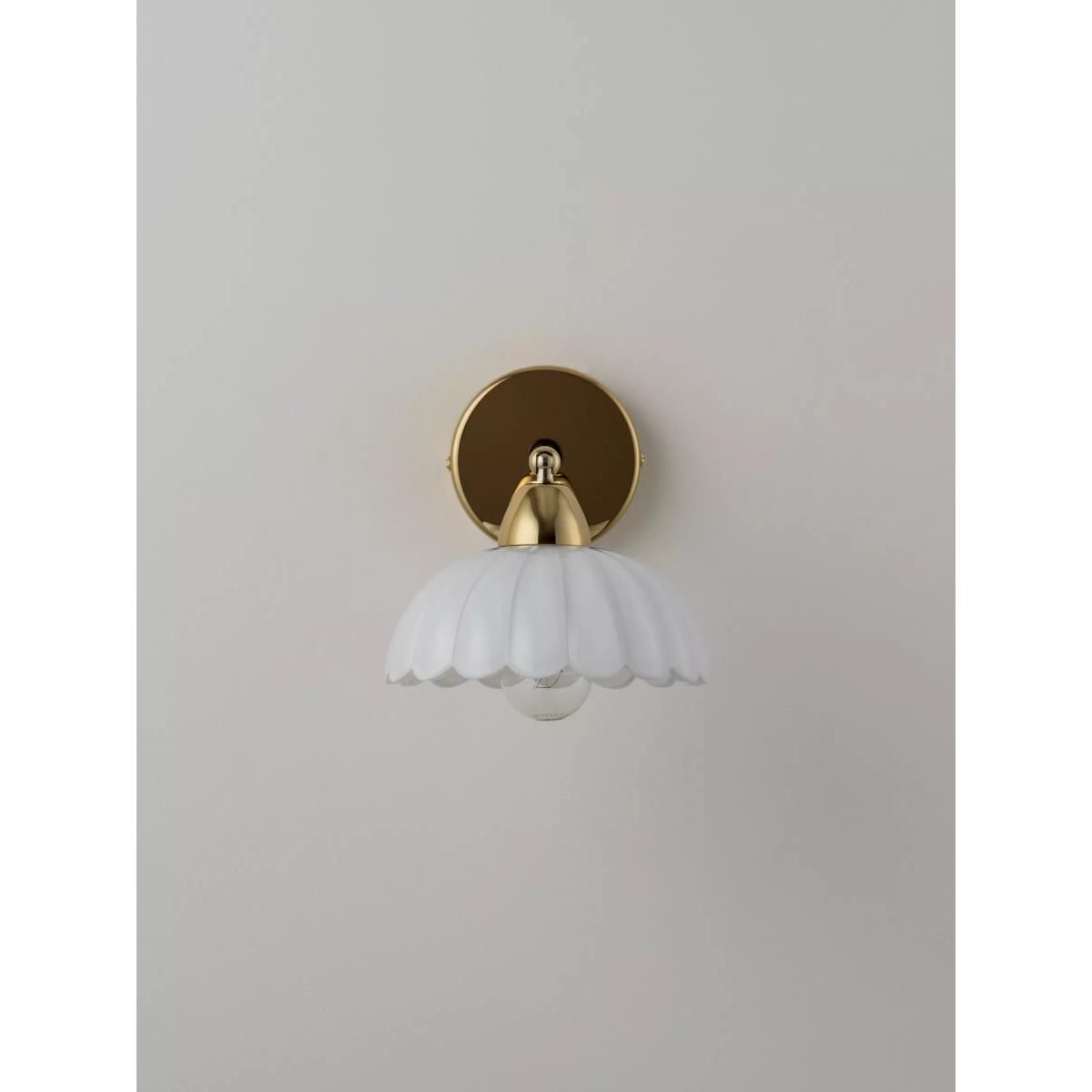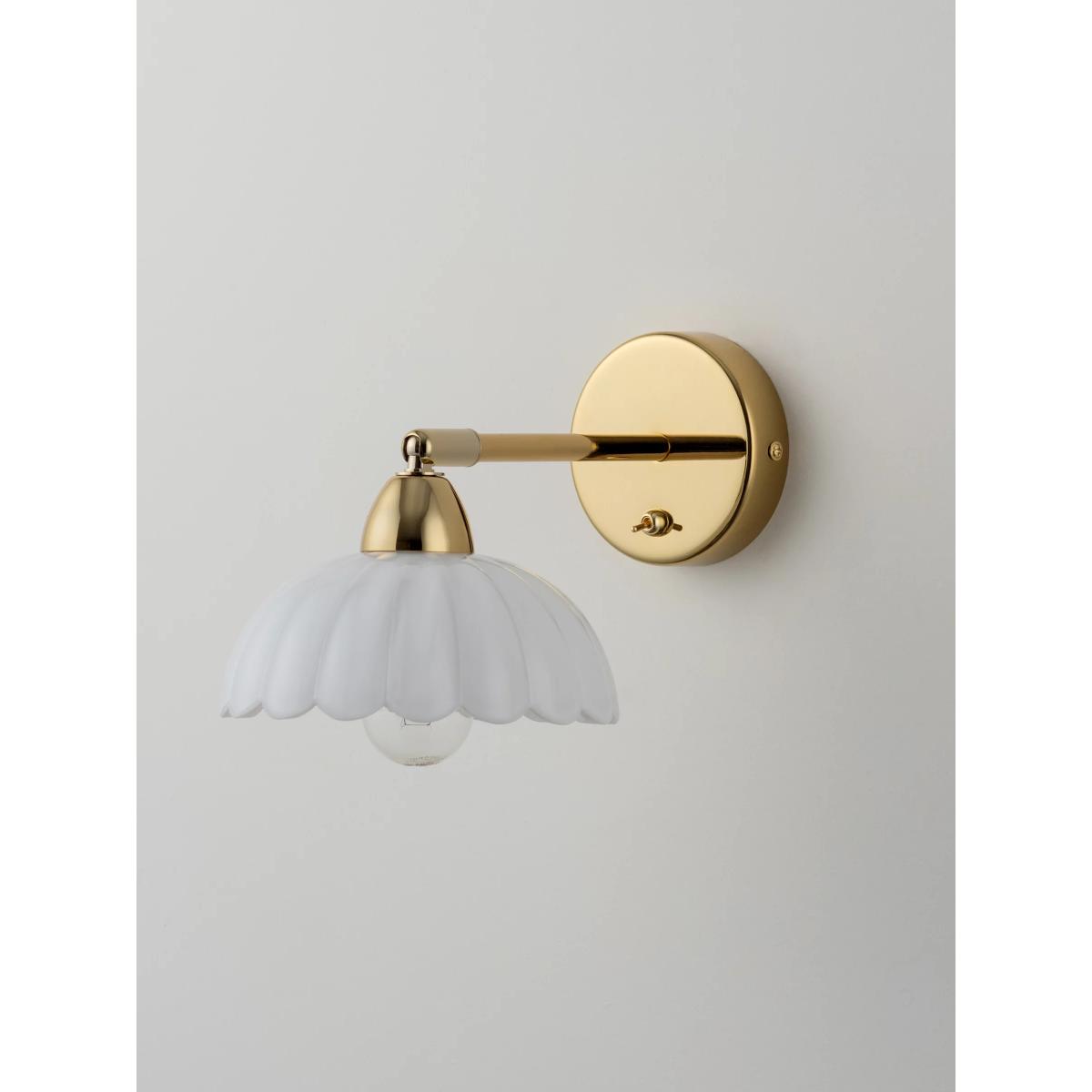 Inspired by '70s design, nostalgic and playful flower shapes are becoming synonymous with houseof. This wall light is a nod to the classic French brasserie lights, and has a moveable shade so that the light can be directed where needed. The light also has an on/off toggle switch, making it a perfect bedside or living room reading light. Finished in polished brass, the white milky glass imbues a comforting, soft warm glow. For ultimate impact, style with the matching ceiling pendant.