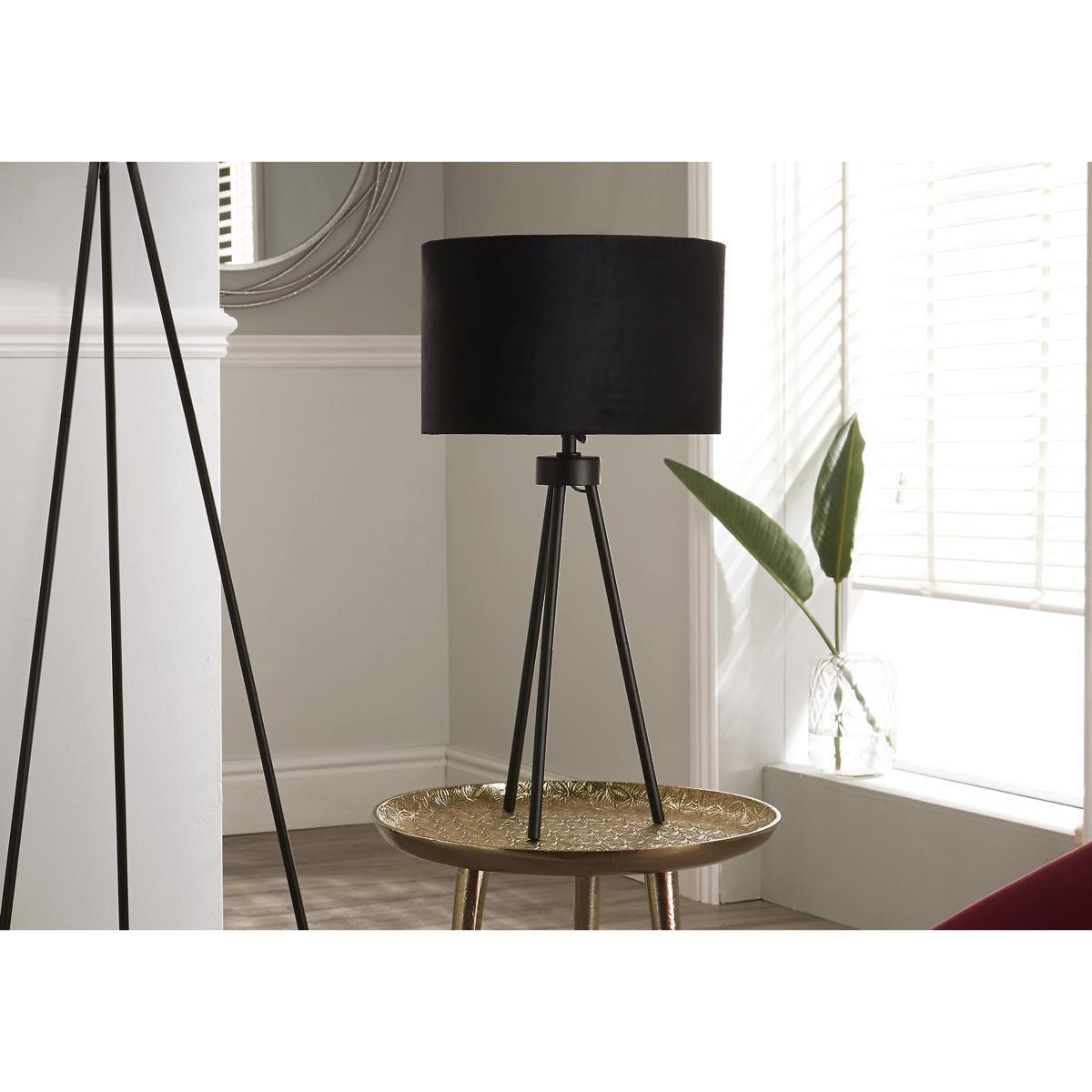With its black velvet shade and slim tripod legs, the Houston table lamp will add sophisticated glamour to any room. Why you’ll love it. Luxe shade, striking silhouette. Contemporary style. Drum shade in rich black velvet. Distinctive slim tripod legs in matt black metal. Pair it with the Houston floor lamp. What you need to know. Black metal tripod base. Black velvet drum shade lined with black faux cotton. ES/E27 GLS 60W bulb. Dimensions. Width: 32 cm (12.6 inches). Depth: 32 cm (12.6 inches). Height: 62 cm (24.4 inches).