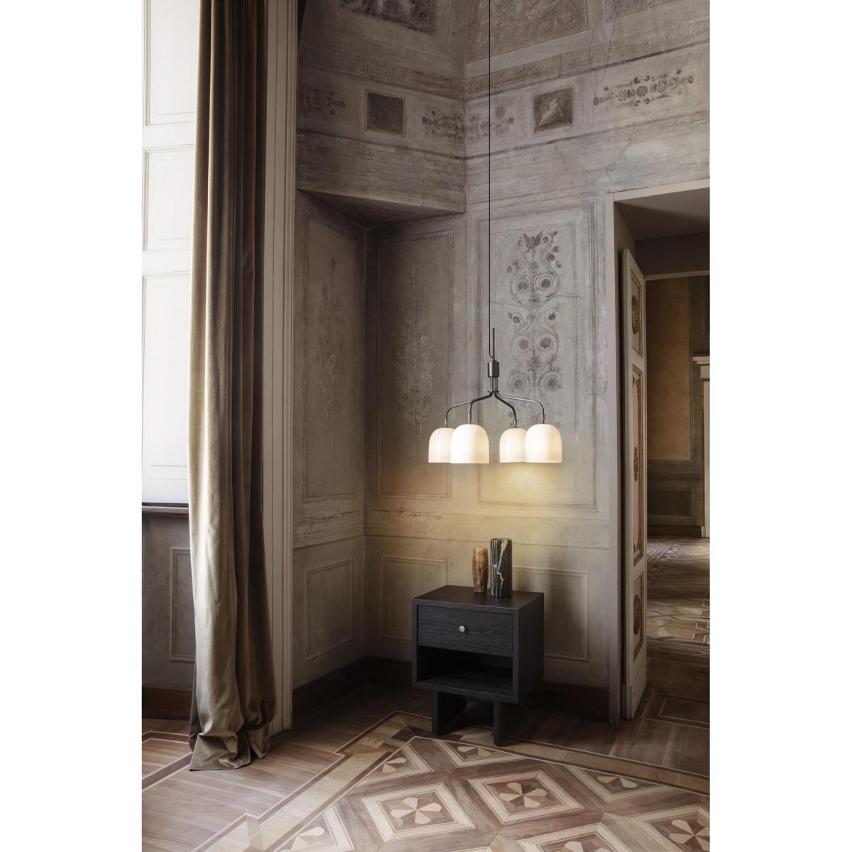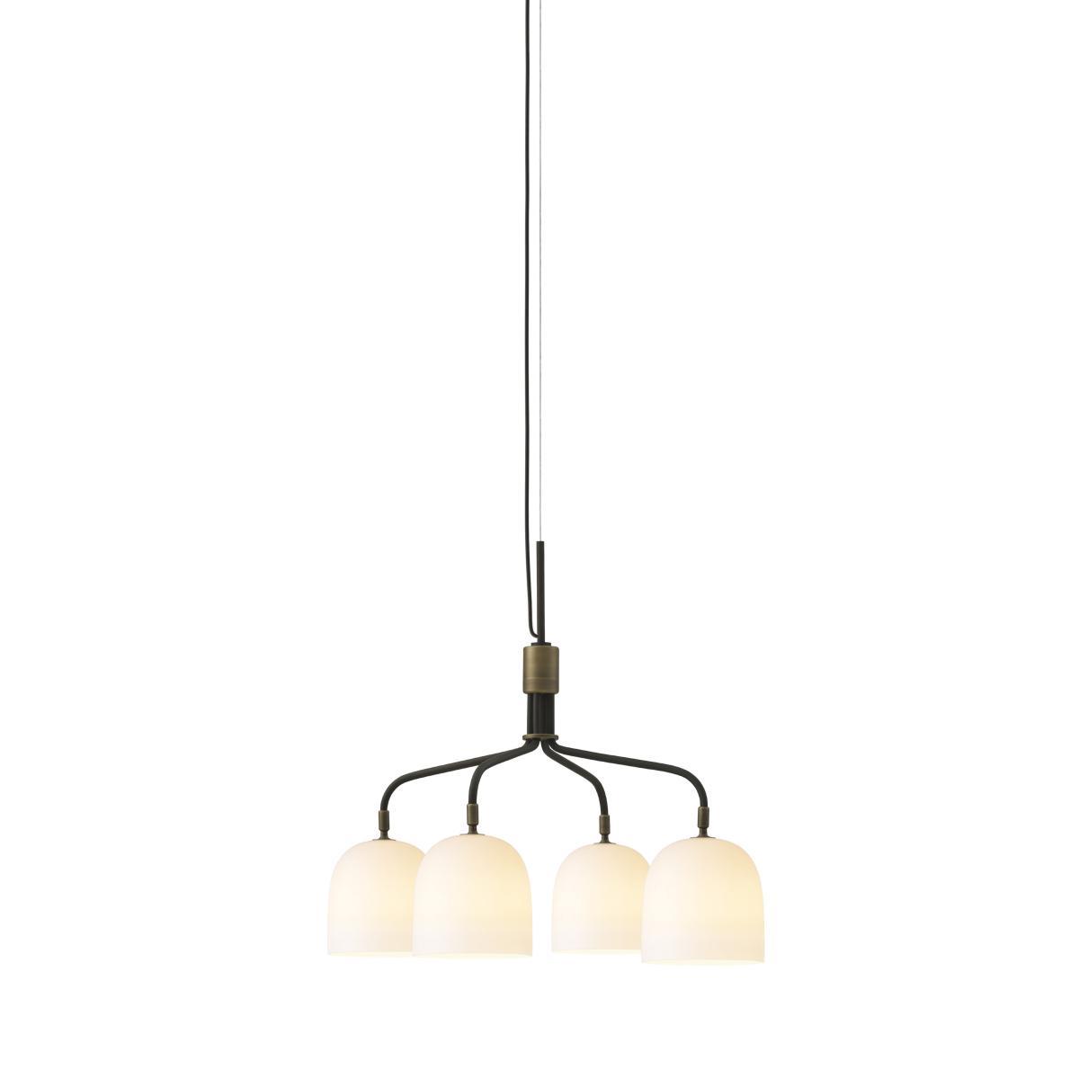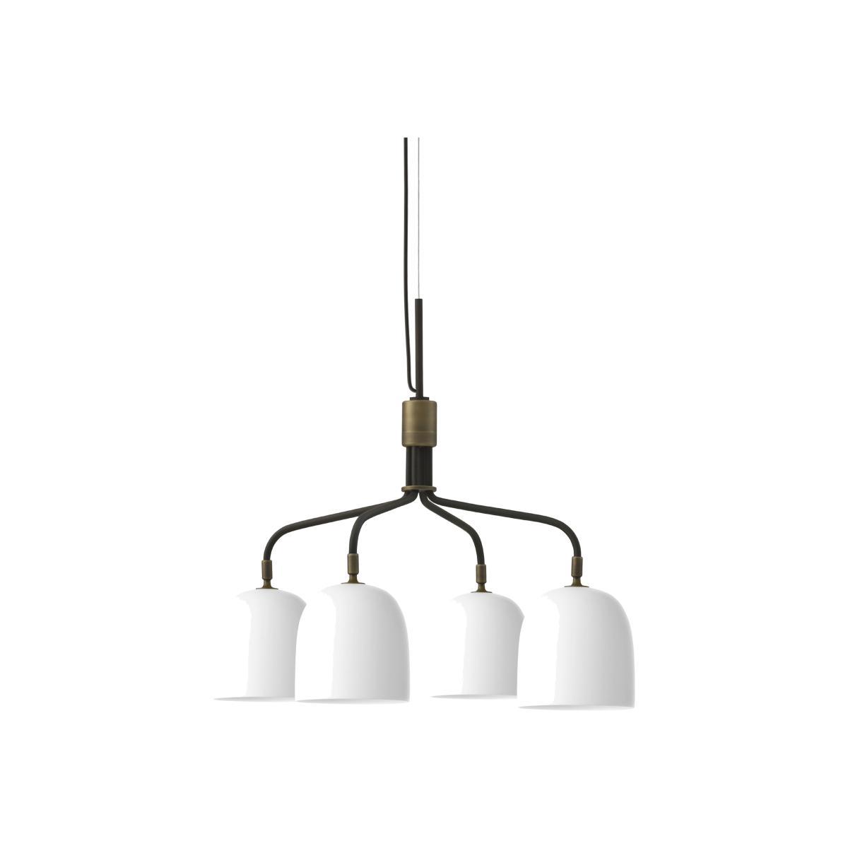 The Howard lighting collection sports a classic industrial style with a touch of luxury. Danish studio Space Copenhagen designed the Howard lamps to equip the rooms of the Howard 11 hotel, in the So Ho district of Manhattan. Named after the hotel, the Howard collection refers to New York City's urban grammar, dominated by dark metal and industrial aesthetics: a celebration of the materiality of New York seen through Scandinavian eyes. The Howard collection features a raw industrial aesthetic combined with refined, elegant details. Each pendant engages in a game of contrast. Made of translucent porcelain or dark metal, the pendants are enlivened with golden brass details. The versions with metal lampshade combine a sober bronze exterior with a sophisticated brushed brass finish interior. The metal gains a nice patina over time. The white porcelain versions combine the preciousness and nobility of ceramic with raw metal elements. The 4-branch chandelier stands out with its sculptural silhouette with its modern, sophisticated expression. Howard pendants are suitable for both private and public spaces.